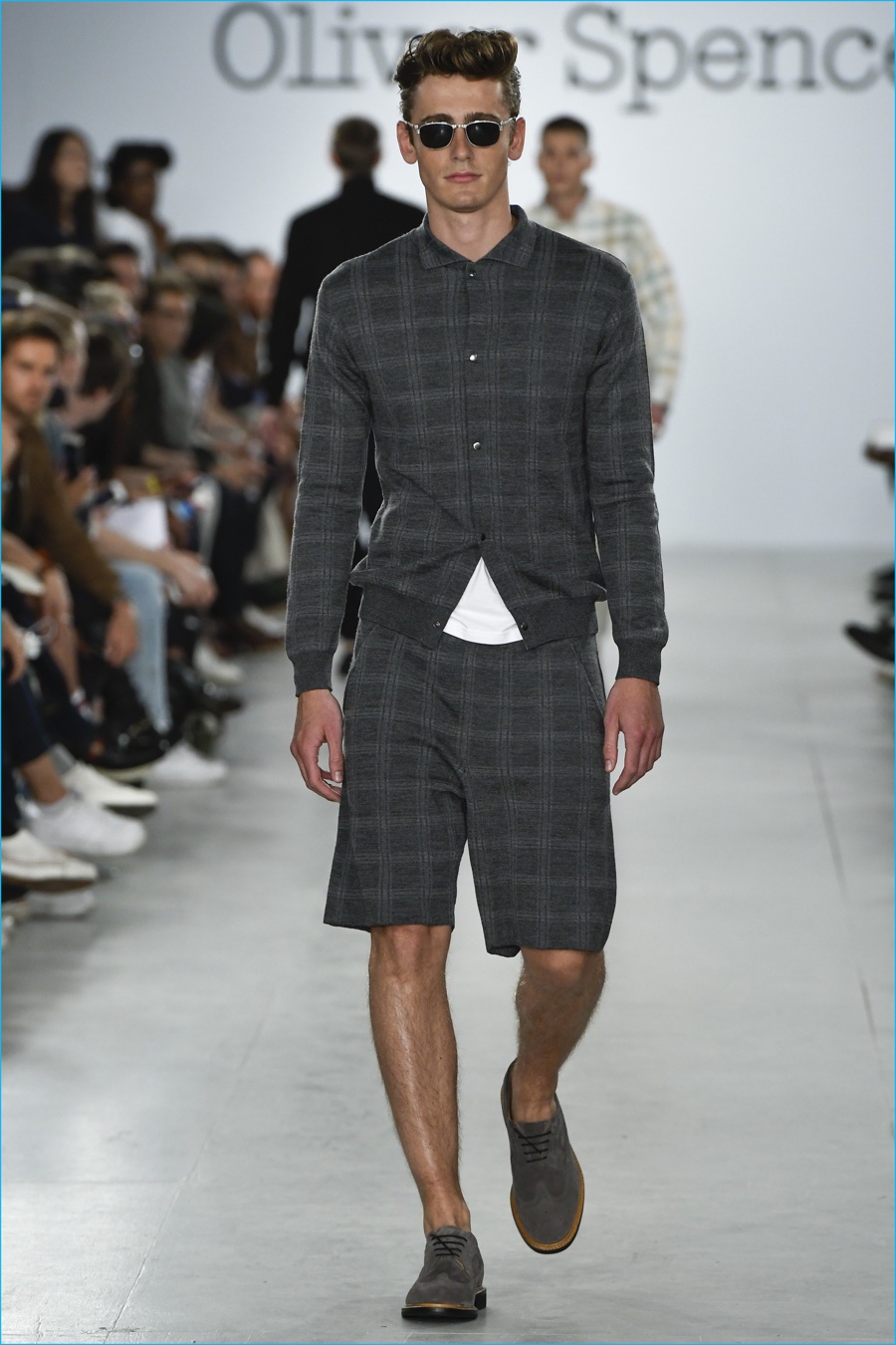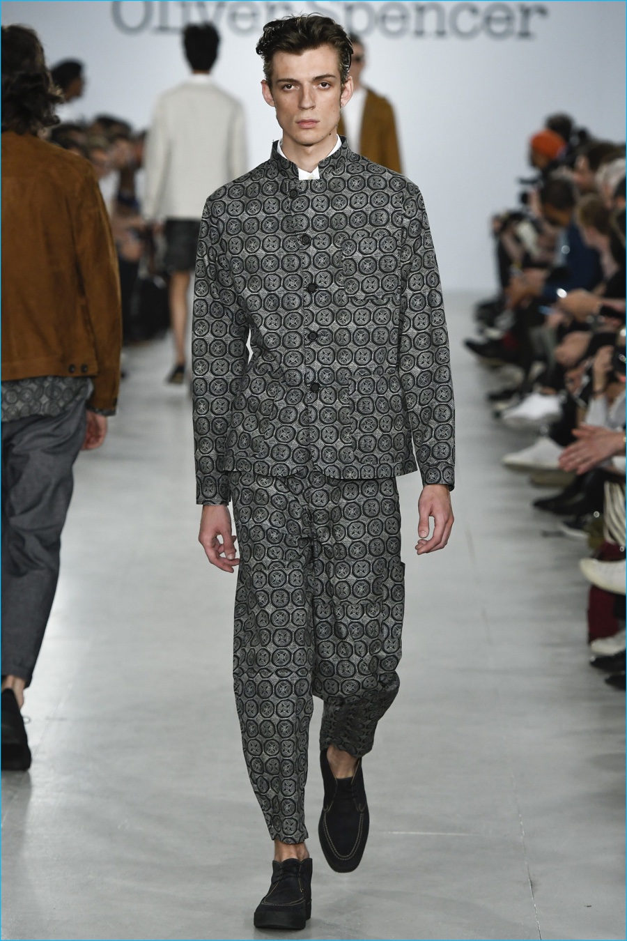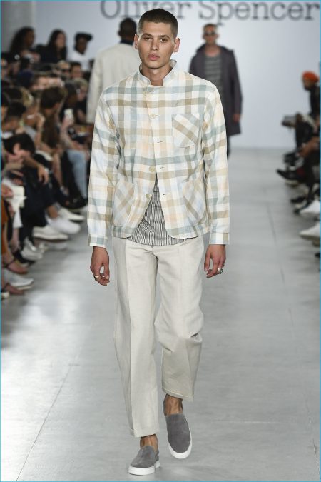 First, Spencer addresses suiting, embracing loose, slouchy shapes and a penchant for tonal prints. Adding to his man’s arsenal, straight-cut trousers, breathable coats, patterned bomber jackets and check button-down shirts are front and center. Making a case for coordinated ensembles, Oliver Spencer’s new collection is rounded out by classic menswear such as short-sleeve shirting, furnished in Madras and checks.