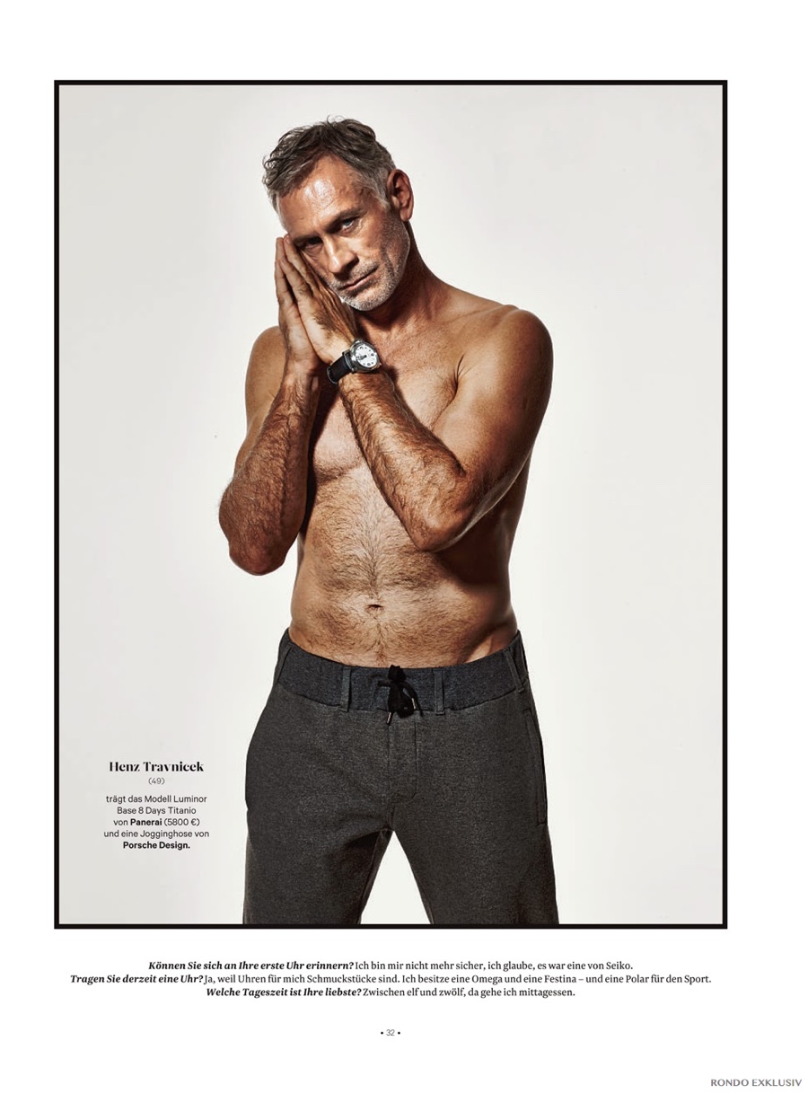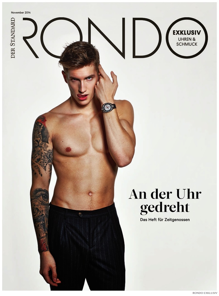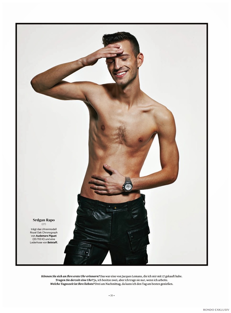 Mann An Zeiger-Oliver Stummvoll, Srdgan Rapo, Manuel Stummvoll, Adam Kai and Henz Travneek come together for a November shoot from Rondo Exklusiv. Posing shirtless in trousers from Porsche Design, Belstaff and other fashion brands, Wiener models and Austria’s Next Top Model contestants link up with photographer Irina Gabrich and stylist Stephan Hilpold. / Grooming by Agnes Veegh. Photo assistance by Raimund Apel.