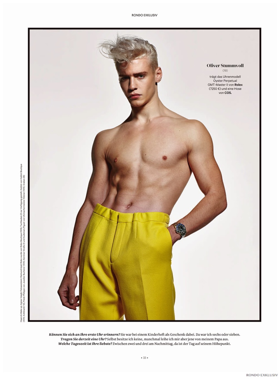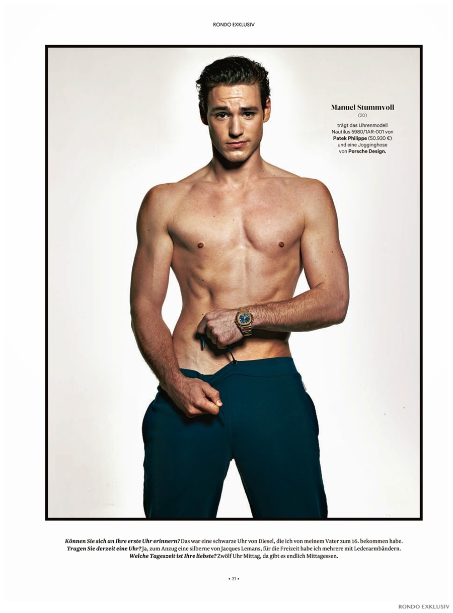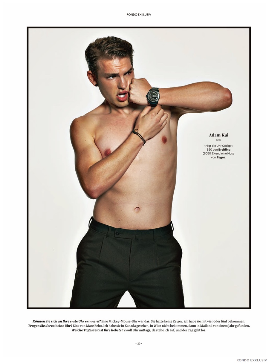 Mann An Zeiger-Oliver Stummvoll, Srdgan Rapo, Manuel Stummvoll, Adam Kai and Henz Travneek come together for a November shoot from Rondo Exklusiv. Posing shirtless in trousers from Porsche Design, Belstaff and other fashion brands, Wiener models and Austria’s Next Top Model contestants link up with photographer Irina Gabrich and stylist Stephan Hilpold. / Grooming by Agnes Veegh. Photo assistance by Raimund Apel.