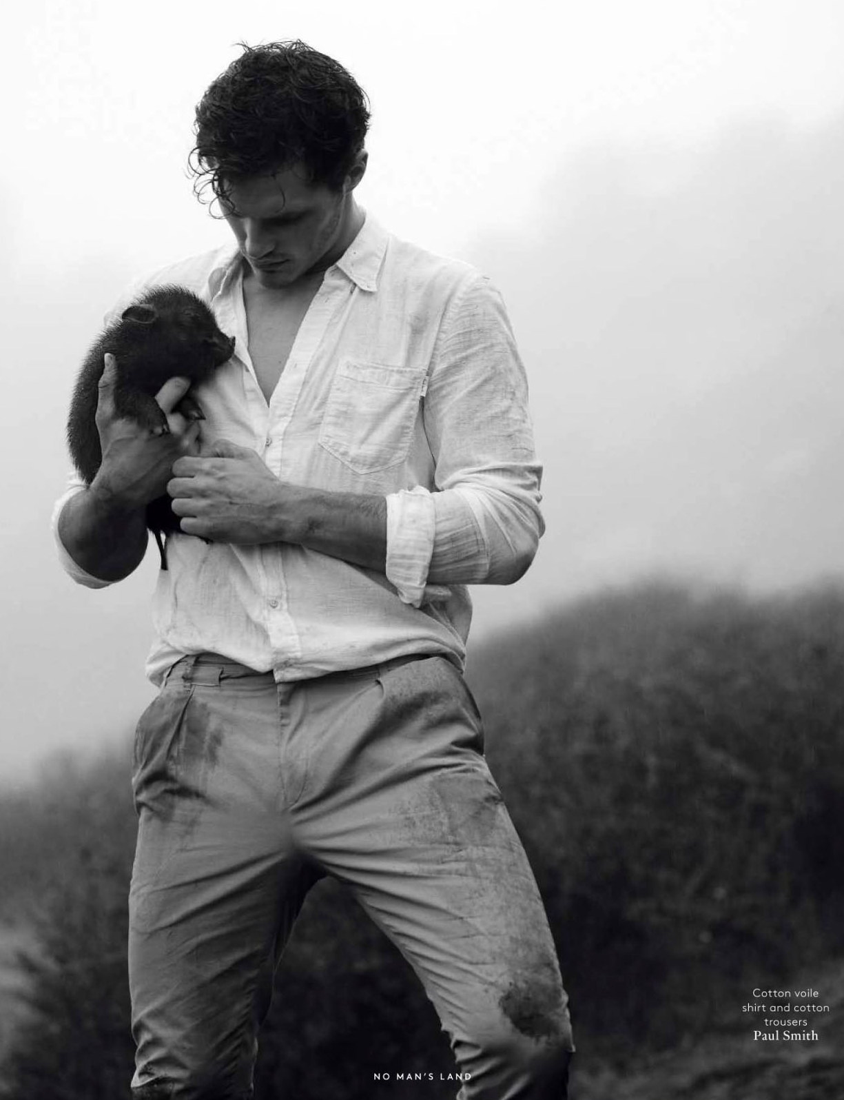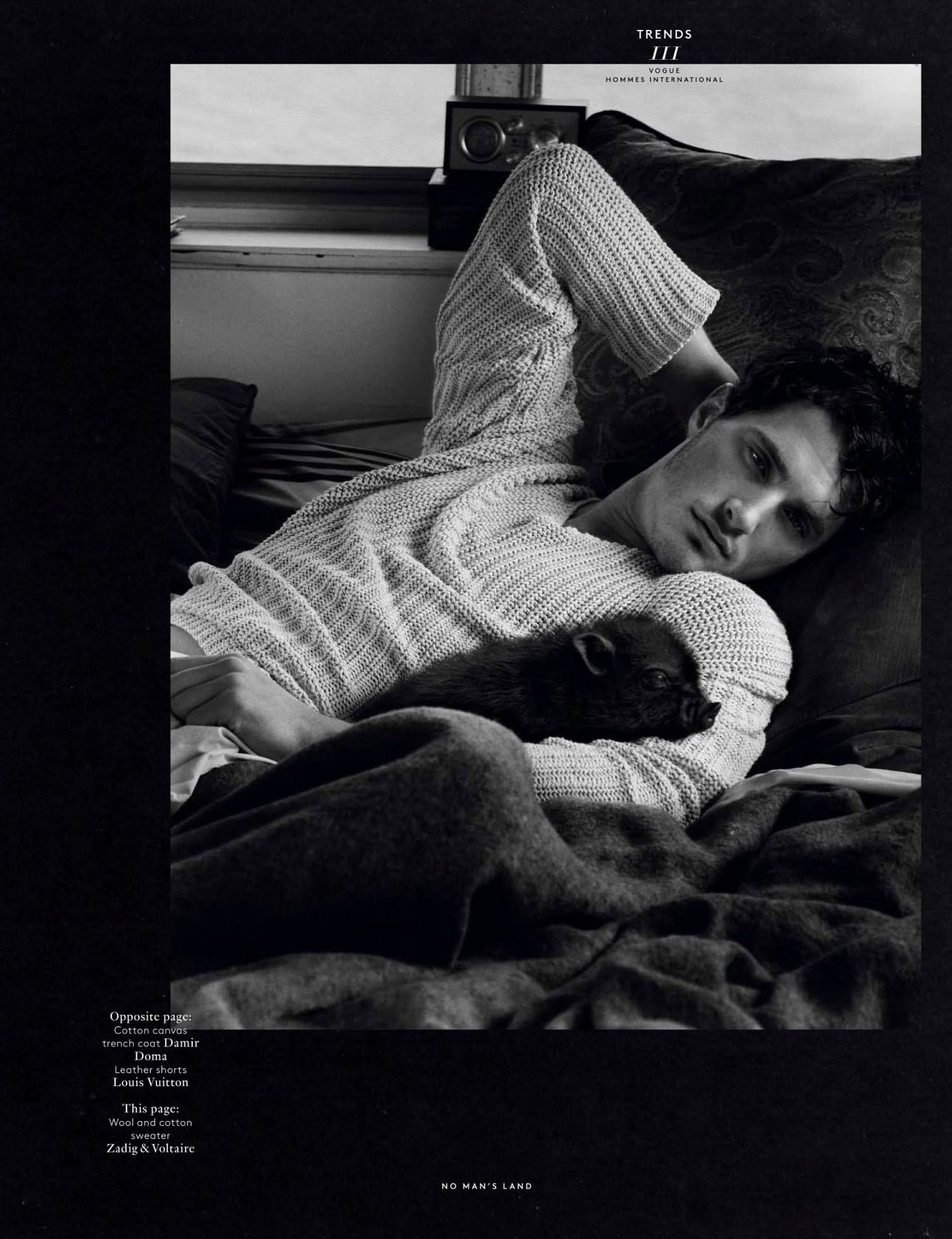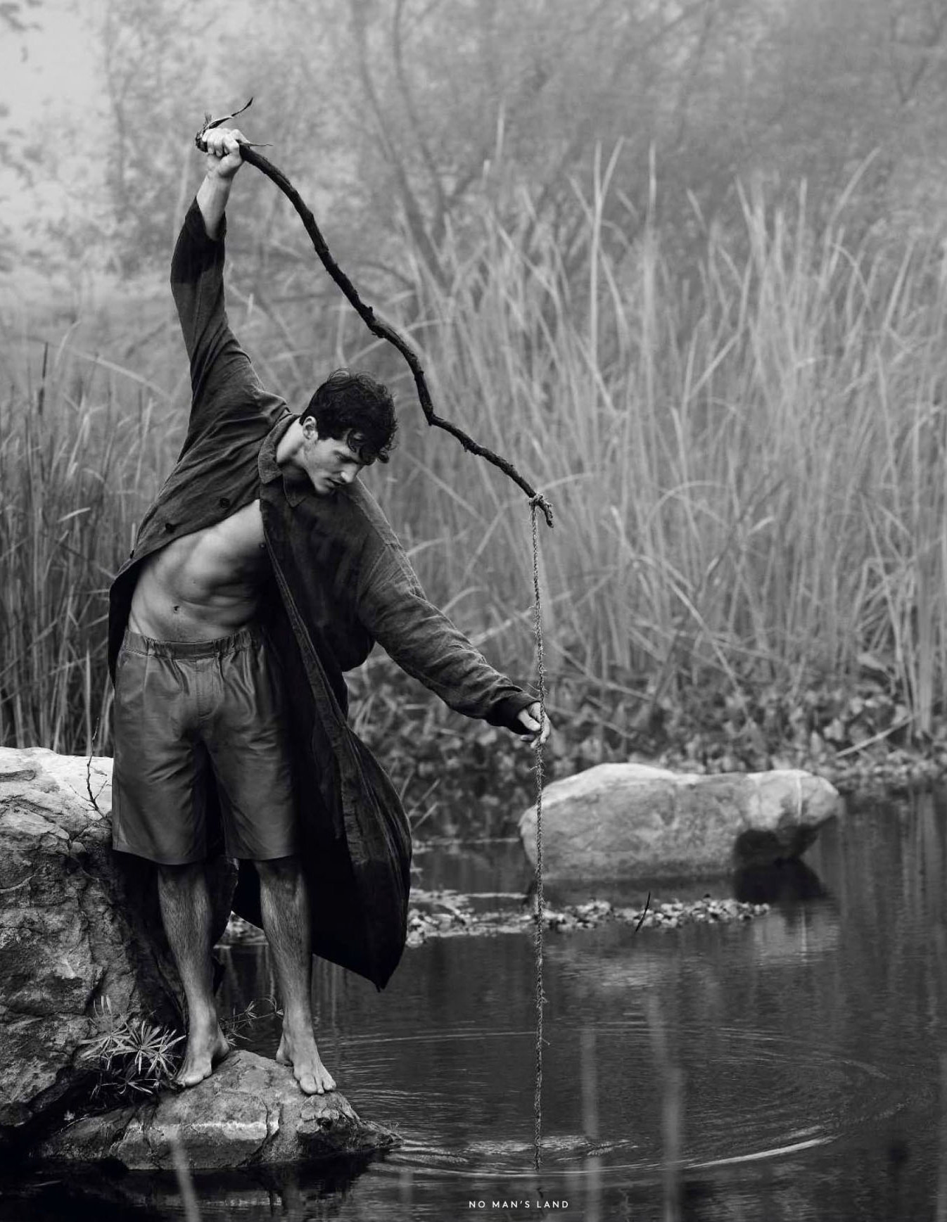 Into the Wild–Photographed in the middle of an untamed nature, Ford Europe model Ollie Edwards graces the pages of the spring/summer 2013 issue of Vogue Hommes International, for a charming black & white spread. The British model poses for Mark Segal’s lens in casual and laid-back designs from the likes of Emporio Armani, Balmain and Louis Vuitton, selected by stylist Azza Yousif. / Styling assistance by Jeanne Crehange and Brandon Palas. Grooming by Lesly McMenamin.