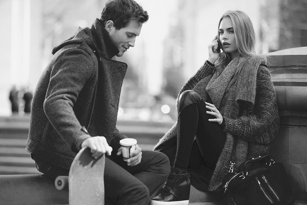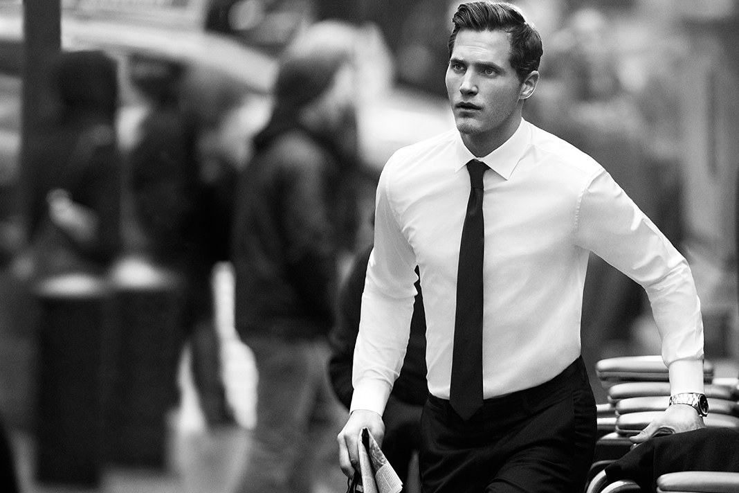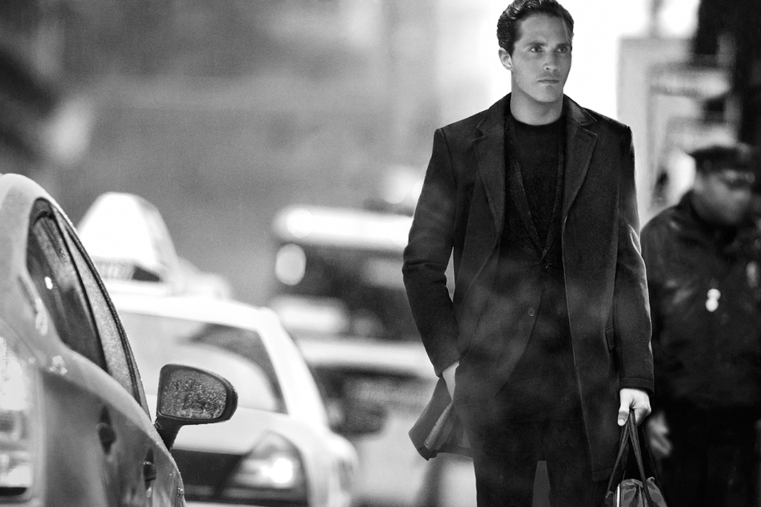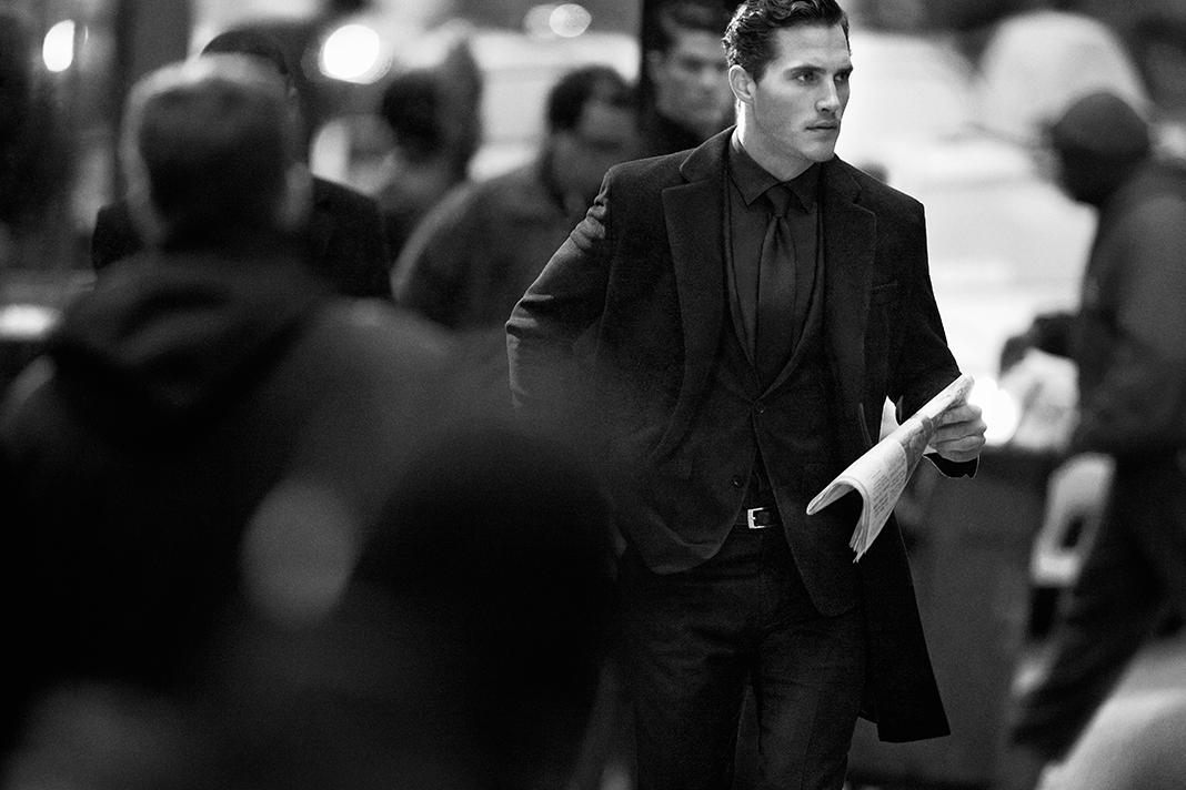 City Attitude–After fronting the fall/winter 2013 campaign for DKNY’s Jeans line, VNY model Ollie Edwards reunites with photographer Mikael Jansson and stylist Alastair McKimm to shoot the brand’s main outing. Staged once again in the city of New York, the new advertisements prefer the timeless refinement of black & white, emphasizing the numbers designed by Garry Martin, the label’s menswear designer, for the upcoming fall season. With a collection that blends elements from sportswear and traditional tailoring, DKNY’s latest offering definitely pays homage to its signature urban functionality, without forgetting a fashionable approach to everyday dressing. / Hair by Anthony Turner. Makeup by Hannah Murray.