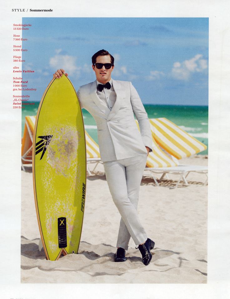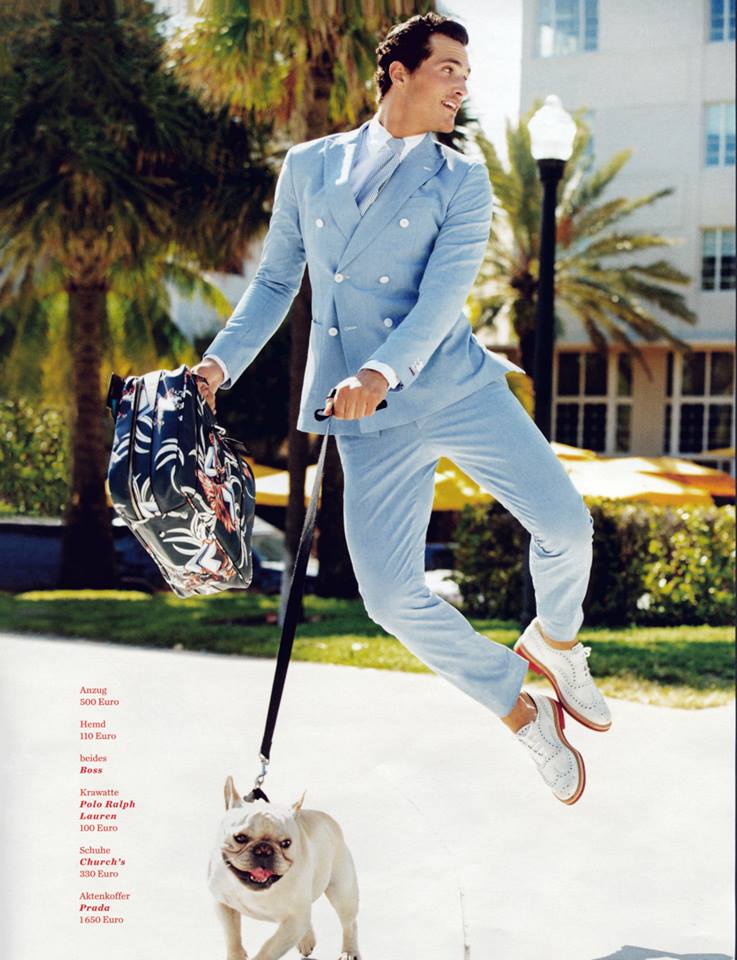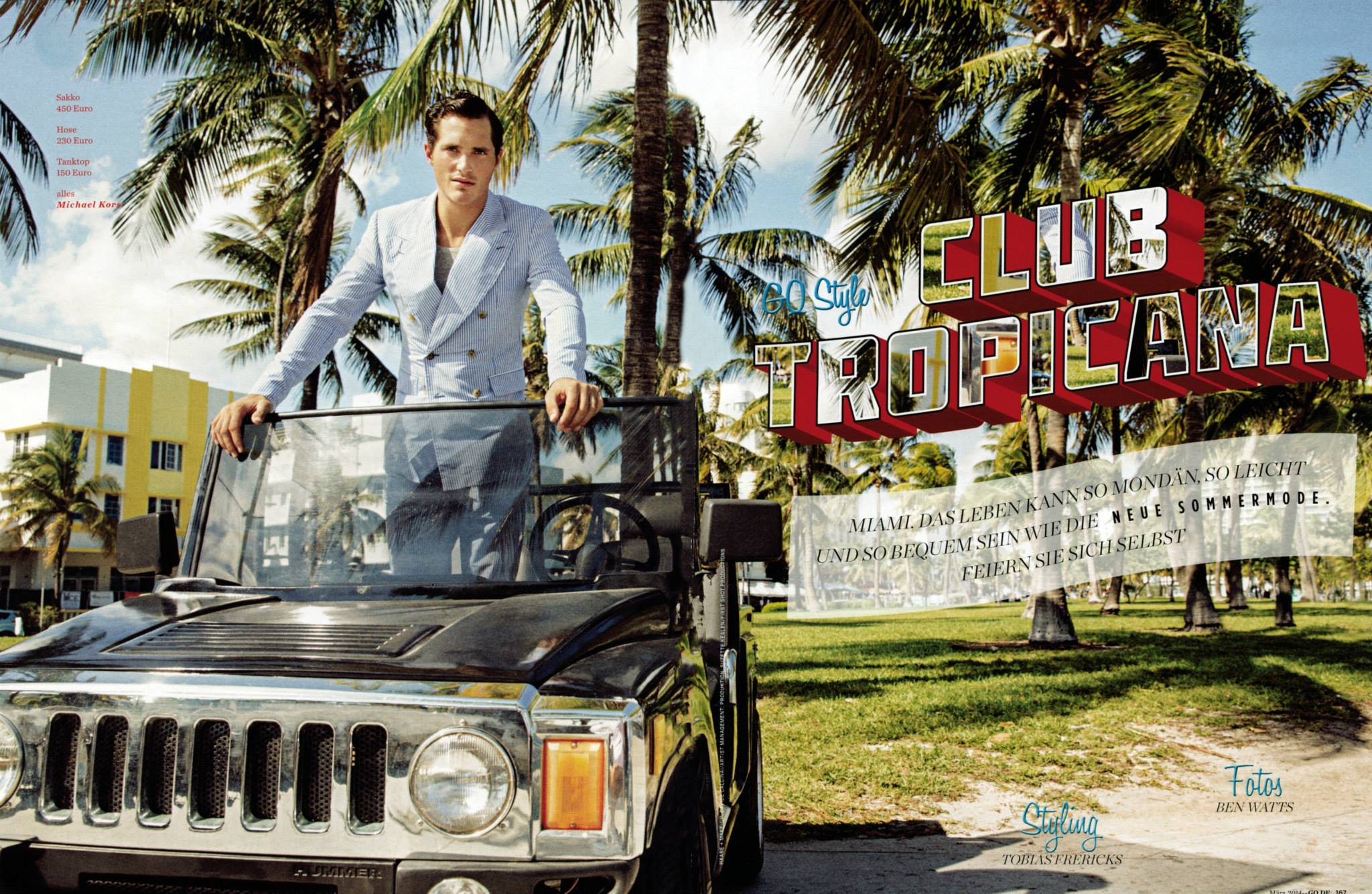 Club Tropicana–For the latest issue of German GQ, model Ollie Edwards enjoys a stylish vacation, posing for Ben Watts’ lens. Styled by Tobias Frericks in a multifaceted wardrobe that never renounces to a dose of modern elegance, Ollie easily alternates Bottega Veneta’s checked designs, Prada’s exotic prints and Giorgio Armani’s textured deconstructed jackets, defining spring’s best styles.
