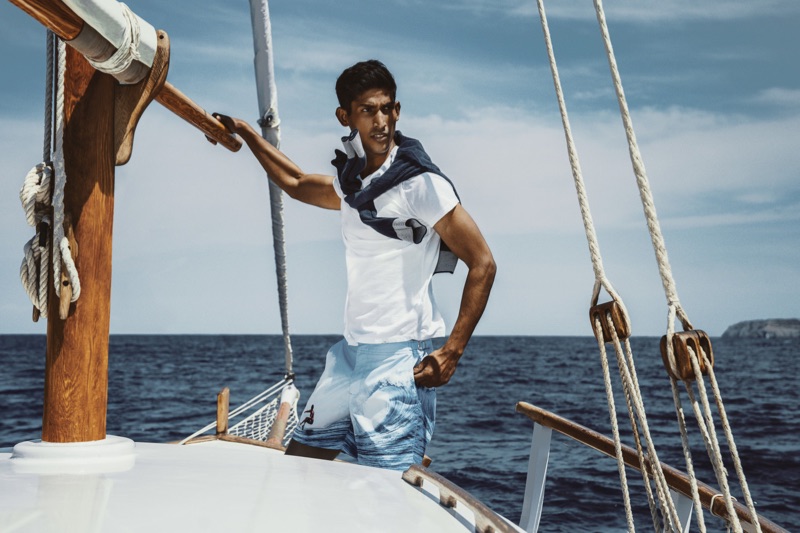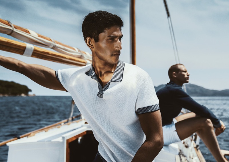 Orlebar Brown sails into fall with new imagery lensed by photographer Julian Broad. Showcasing the brand’s latest styles for the season, models Augusta Alexander and Pranav Bhargav are front and center. Michael Darlington styles the models for the occasions. Taking to the Spanish island of Mallorca, the models wear key pieces from Orlebar Brown’s fall-winter 2019 collection. Smart polo shirts and tees complement Orlebar Brown’s signature swim shorts.