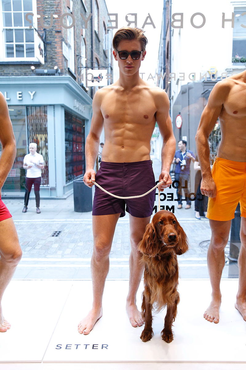Orlebar Brown Spring/Summer 2015–Nothing quite goes with summer like a new look from Orlebar Brown. The label brought its signature pieces to London Collections: Men once more with a presentation. Simple basics came together in the menswear lineup with fitted polo shirts, short-sleeve printed shirts and cotton bombers. Adding a little magic to the swimwear portion, models in stylish sunglasses posed with dogs for charming results.