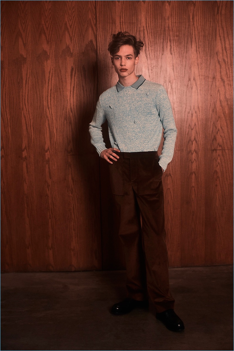 PinLayering for fall, Orley turns out a textured knit sweater with a smart polo.