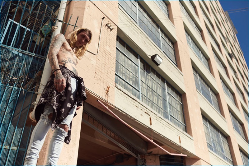PinAnthony Vaughan photographs Bradley Soileau in an oversized t-shirt and white ripped jeans from Other UK.