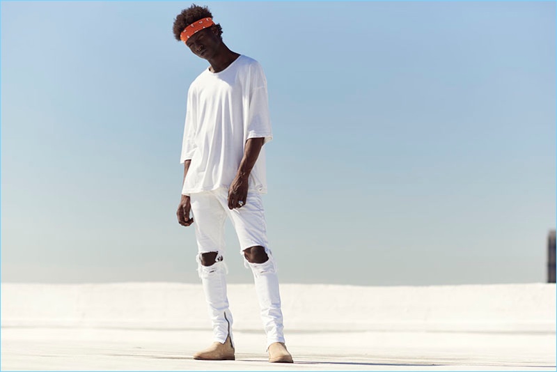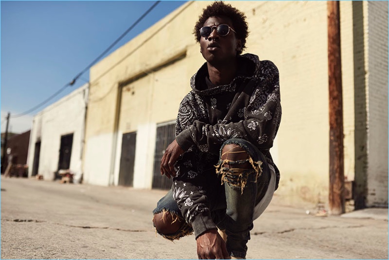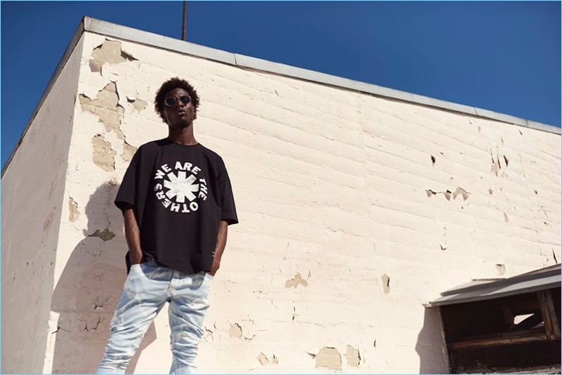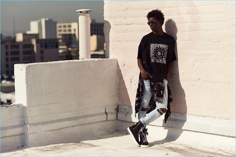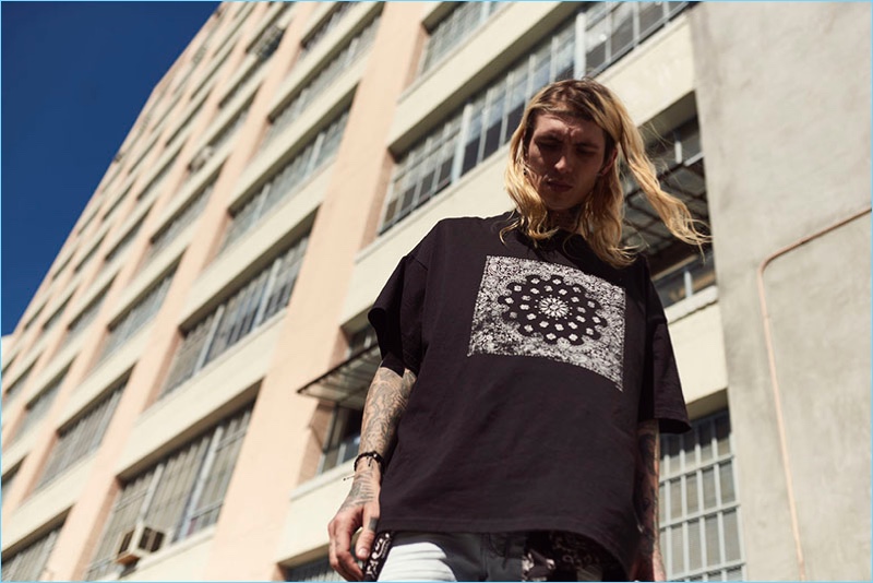 Adonis and Bradley sport Other UK’s range, which takes inspiration from Los Angeles’ music scene. Here, 90s hip-hop and 80s rock ‘n’ roll style come together to create quite the melting pot. Paisley and tie-dye prints lend the season a graphic appeal, while ripped denim and box cut tees solidify a current attitude.
