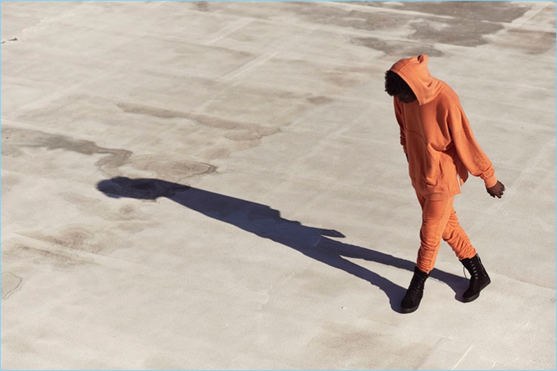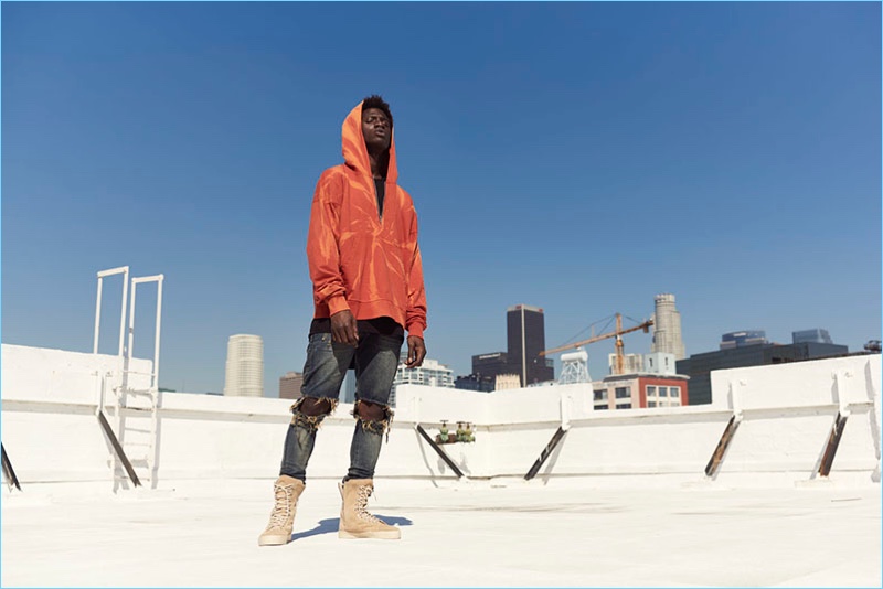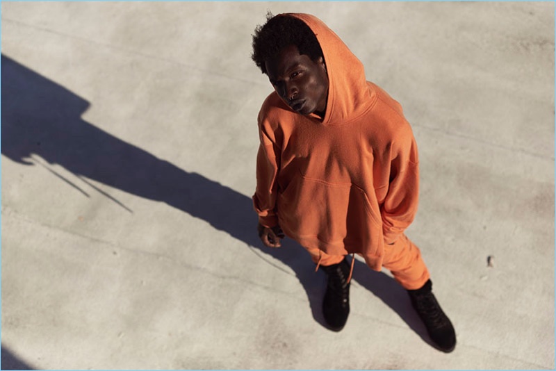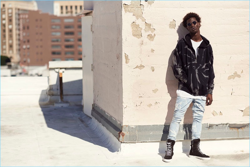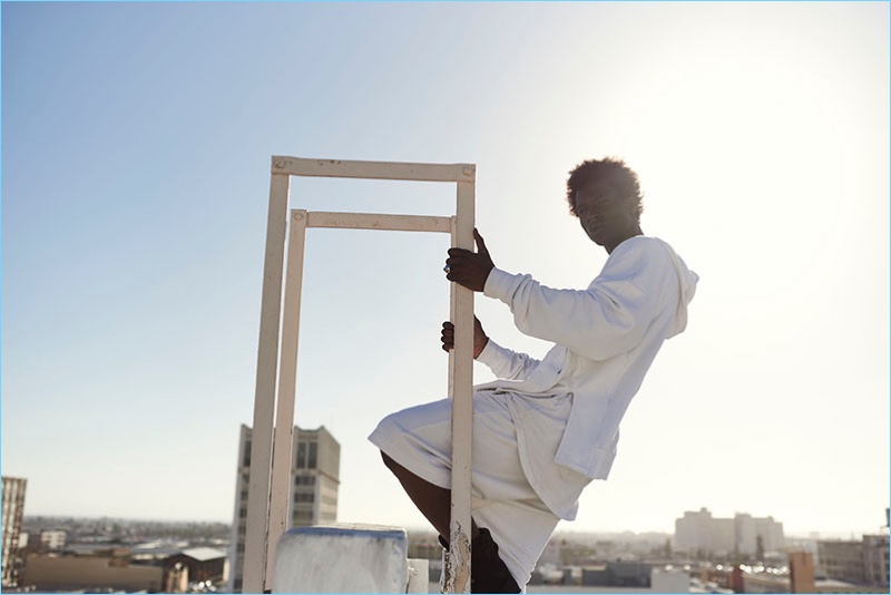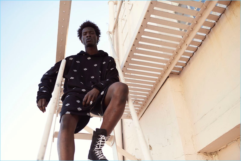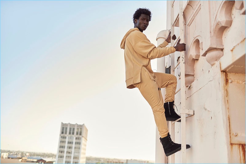 PinClimbing a ladder, Adonis Bosso wears joggers and a hoodie from Other UK’s OTHERSIDE collection.