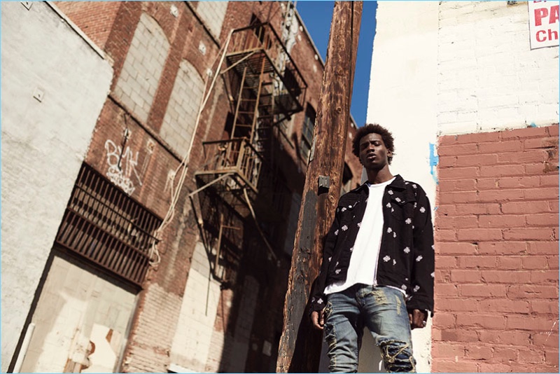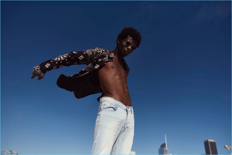 PinModel Adonis Bosso sports a printed shirt and light wash denim jeans from Other UK.