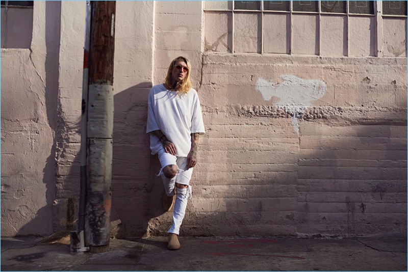 PinPictured in an alley, Bradley Soileau wears an oversized t-shirt and ripped white jeans from Other UK.