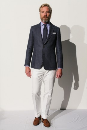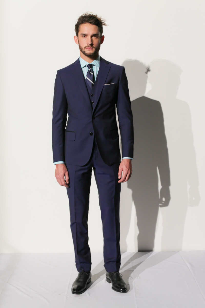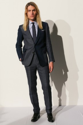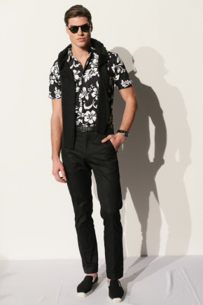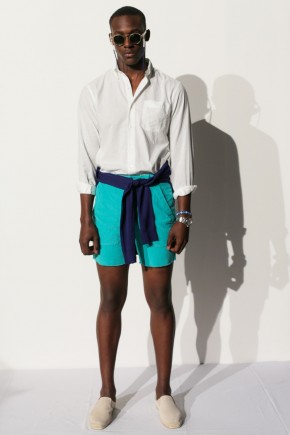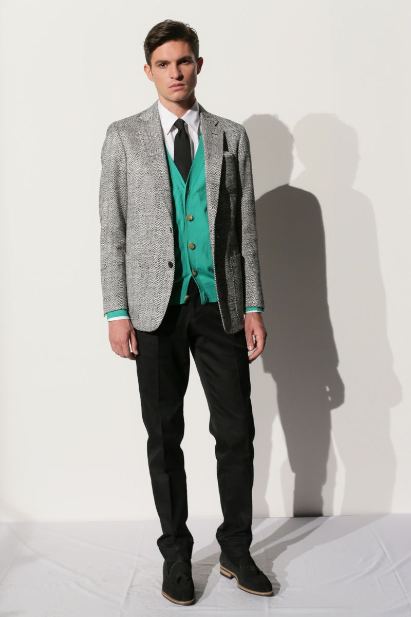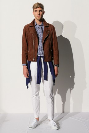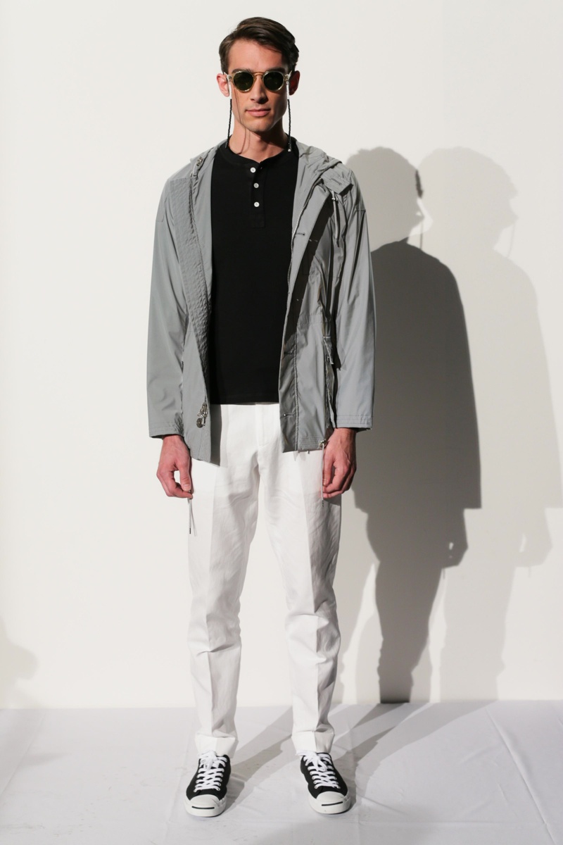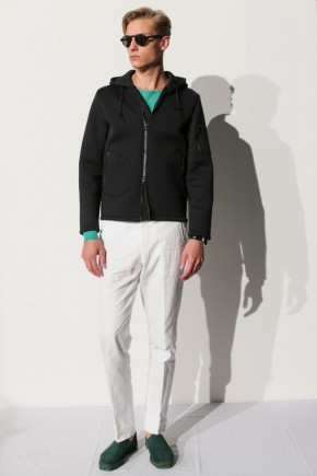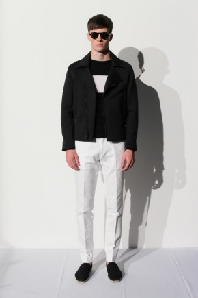 Essential Focus–Their first presentation for New York Fashion Week, Ovadia & Sons designers Ariel and Shimon Ovadia showcased their laid-back spring/summer 2014 collection. A balance of relaxed garments and sharp tailoring as seen in suiting reflected the label’s firm grasp on the all-inclusive wardrobe. Dressed in black and white with accents of green and blue, an easy temperament encompassed the collection that offered alongside shirting and chinos, outerwear that ranged from a neoprene motorcycle jacket to a lightweight anorak.
