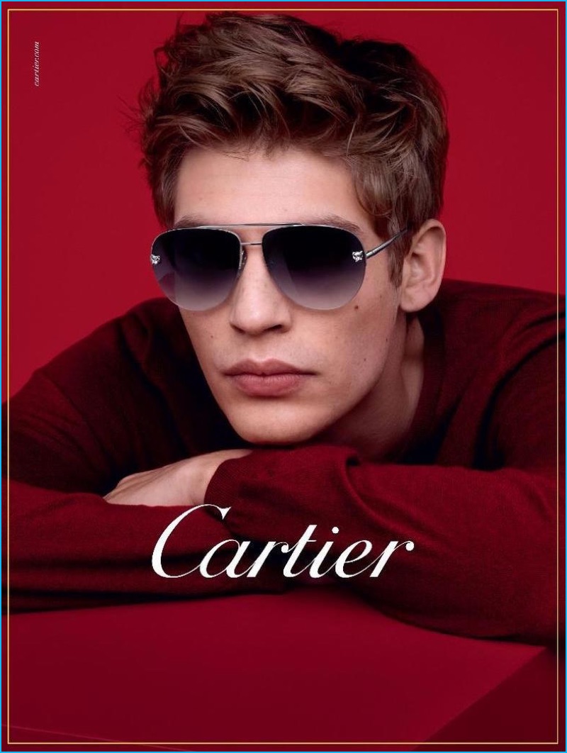 Cartier delivers a new advertisement for its Panthére de Cartier Aviators. The metal style provides an ultra-light and luxurious spin on an eyewear classic. Model Baptiste Radufe dons the must-have aviators in platinum. Fronting the striking campaign, Baptiste appears before photographer Daniel Jackson. Spotlighted against a red backdrop, Cartier’s aviators are wishlist ready. The sunglasses feature panther details and come in gold as well as with a mirrored finish.