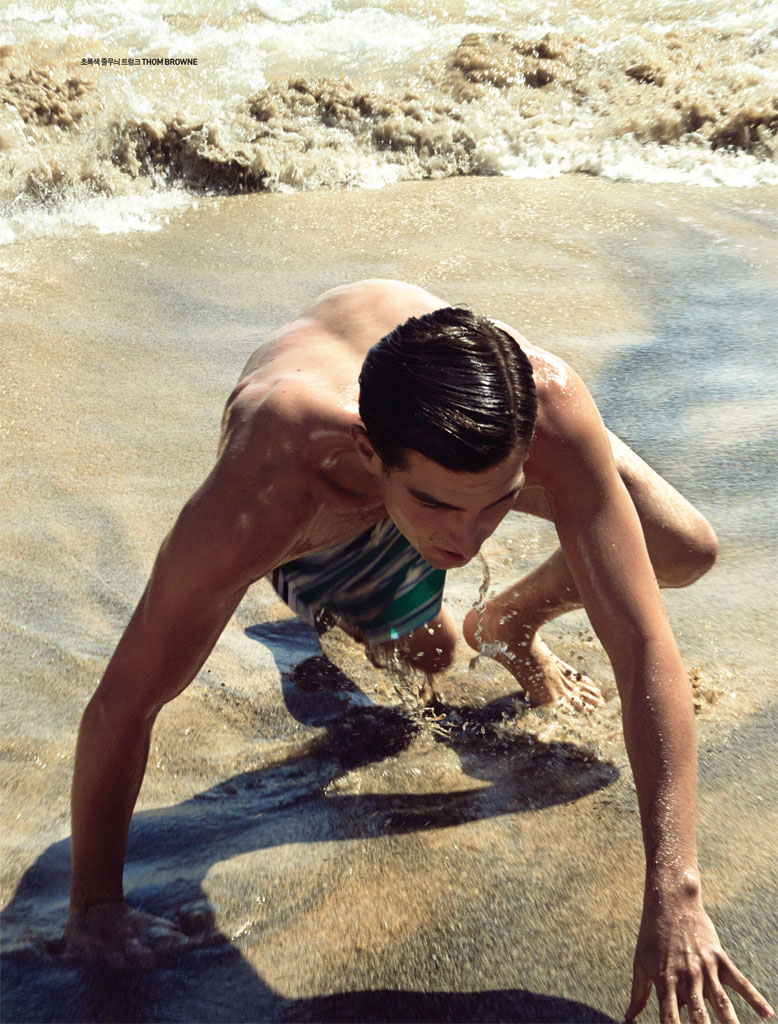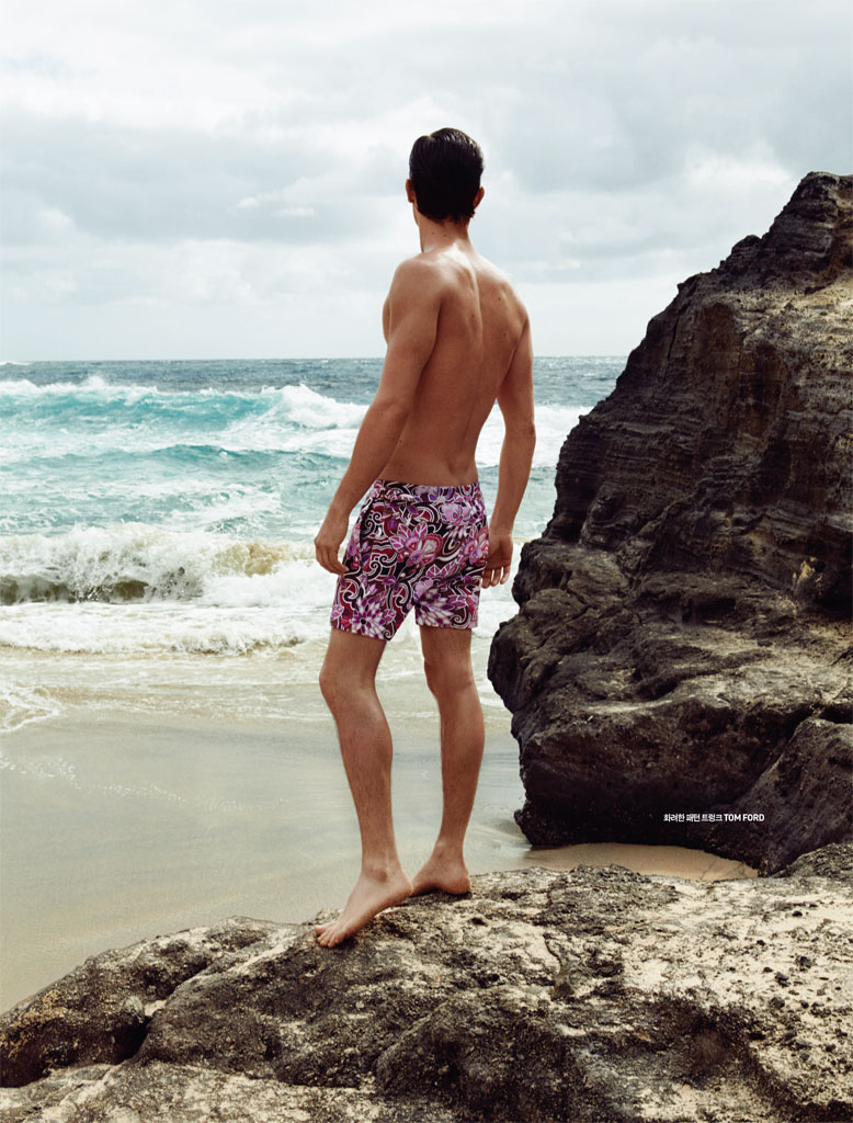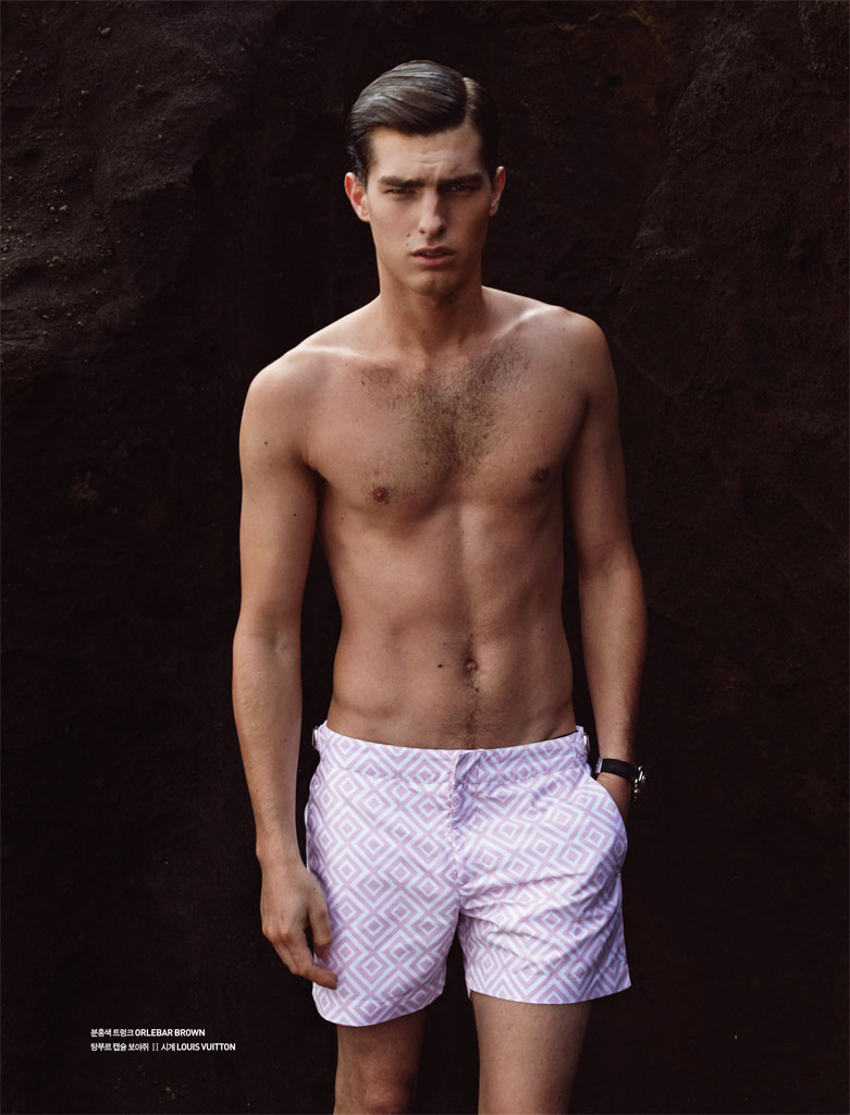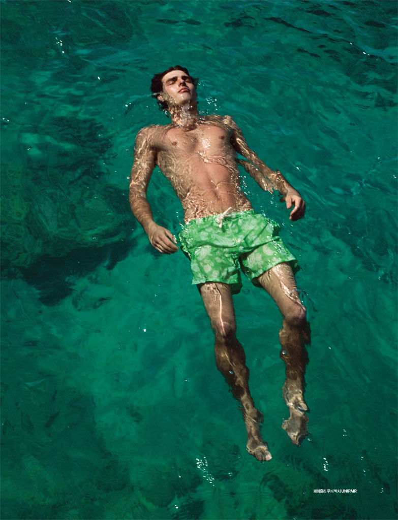 Underwater Fashion–Paolo Anchisi chases the sun for the spring/summer 2013 issue of GQ Style Korea, photographed by Hilary Walsh (Atelier Management). The Italian model poses on a rocky shore in summer swimwear pieces, mixing plain colors with graphic patterns, like oversized polka dots and stripes, or opulent motifs. Captured lounging under the sun or having a moment of relaxation in a clear blue sea, the Ford New York model proves how to be fashionable for the next summer holidays.