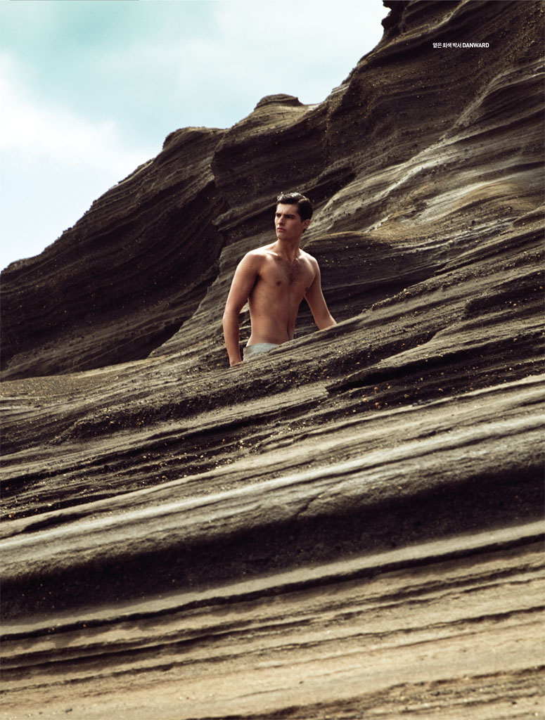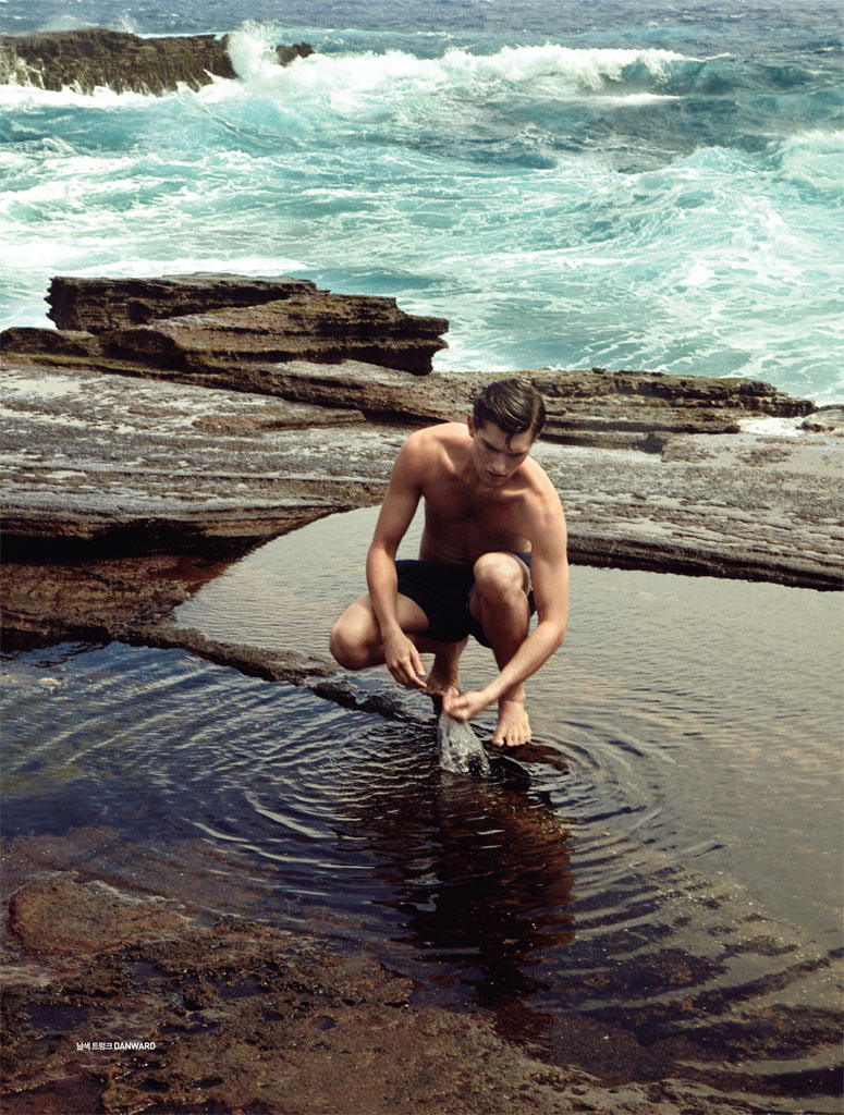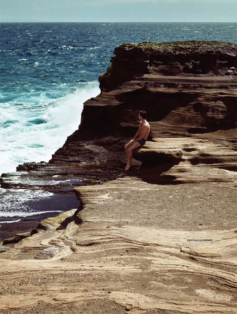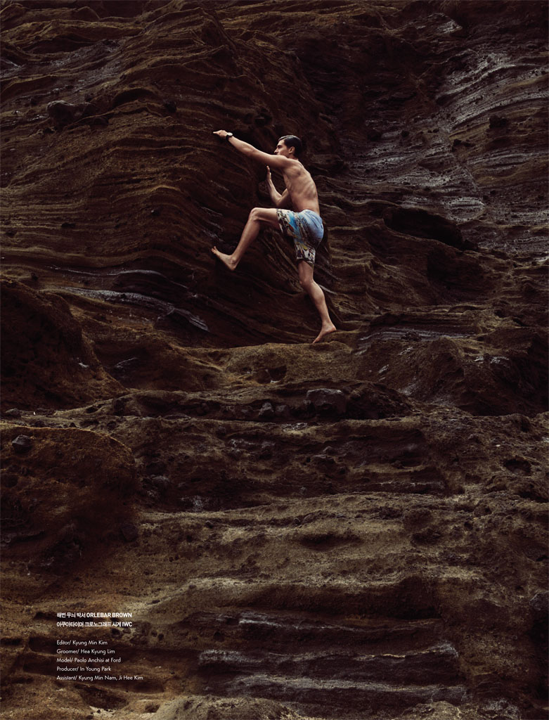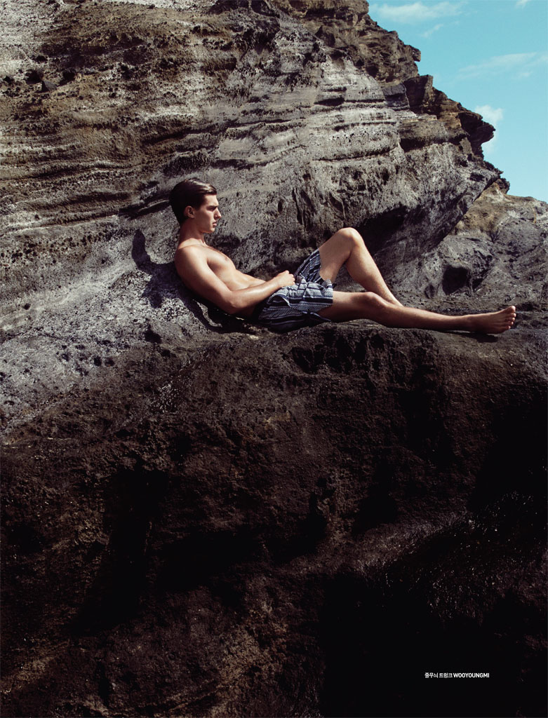 Underwater Fashion–Paolo Anchisi chases the sun for the spring/summer 2013 issue of GQ Style Korea, photographed by Hilary Walsh (Atelier Management). The Italian model poses on a rocky shore in summer swimwear pieces, mixing plain colors with graphic patterns, like oversized polka dots and stripes, or opulent motifs. Captured lounging under the sun or having a moment of relaxation in a clear blue sea, the Ford New York model proves how to be fashionable for the next summer holidays.