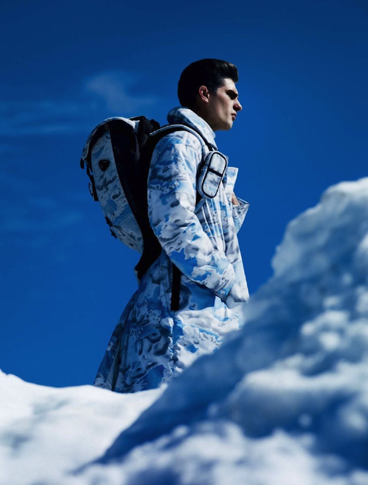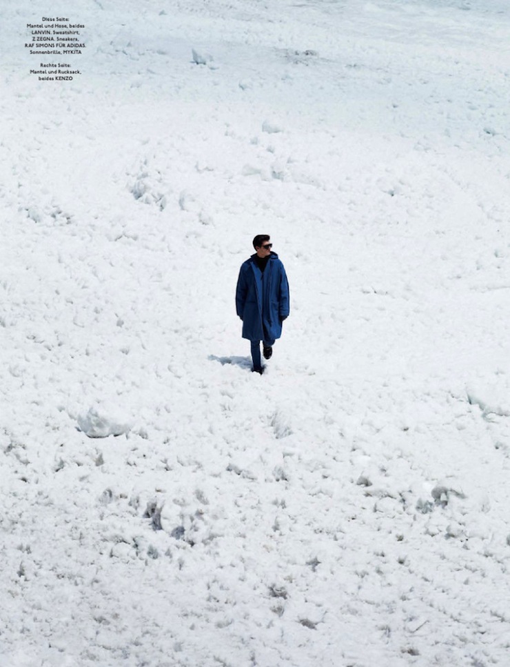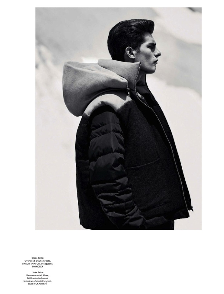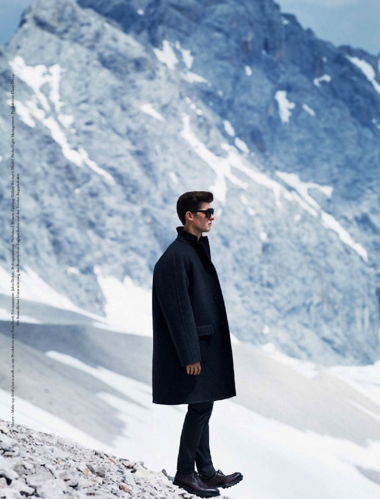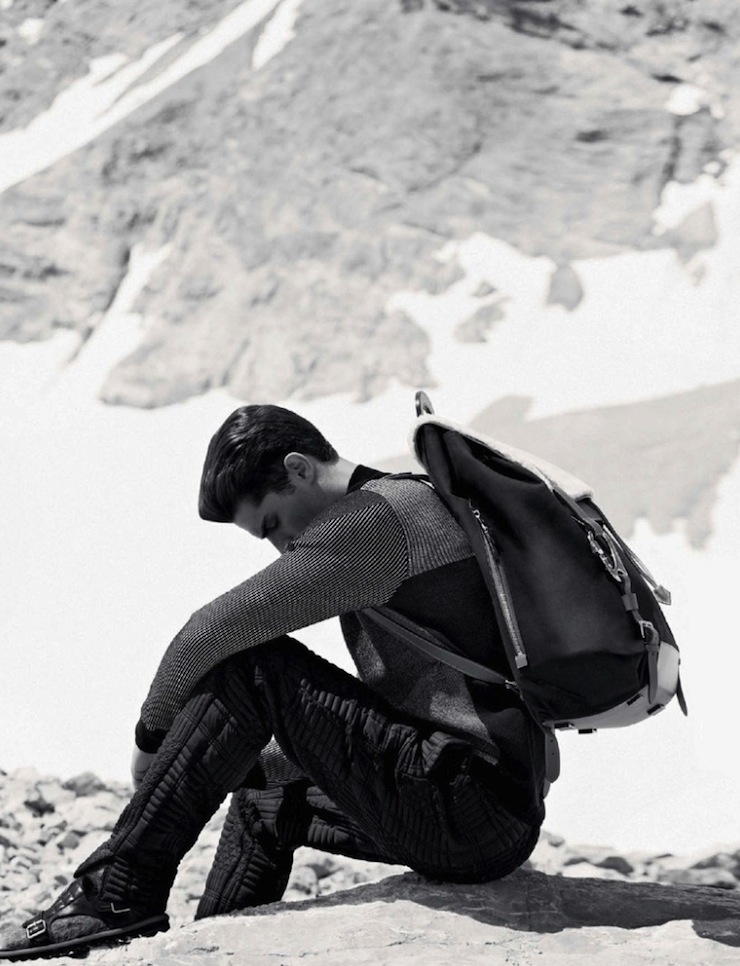 The Big Chill–Model Paolo Anchisi graces the pages of the fall/winter 2013 issue of GQ Style Germany, posing for an outdoor spread lensed by Daniel Riera. Captured among the slopes, the Sight model embraces a practical wardrobe that blends functionality with performing fabrics and innovative details, without forgetting a hint of fashionable appeal. Styled by Tobias Frericks in padded designs, textured coats and comfortable volumes, Paolo is a solitary explorer surrounded by a breathtaking uncontaminated landscape. / Styling assistance by Nicolas J. Brown. Grooming by Stelli using Tom Ford products.