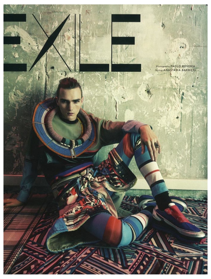 Exhile–Capturing the dark side of traditionally cheerful prints, photographer Paolo Roversi collaborates with Anastasia Barbieri for a story in the spring/summer 2014 edition of Vogue Hommes International. Referencing season themes such as Prada’s disturbed paradise, Barbieri outfits Bananas model Gryphon O’Shea in a phenomenal series of printed looks with great character.