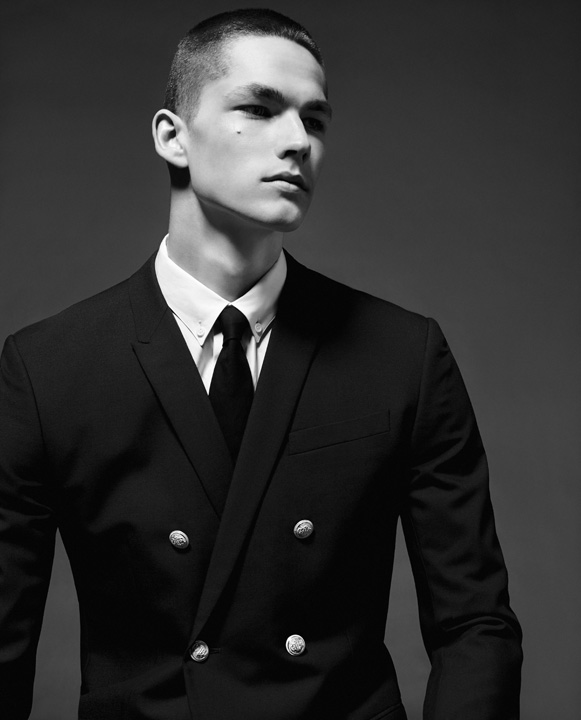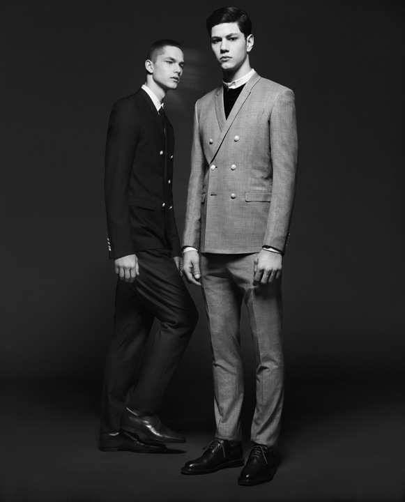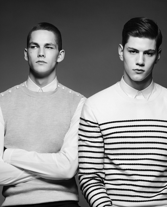 Smooth Sailing–Wearing pieces from Kris Van Assche’s spring/summer 2013 collection for French fashion house Dior Homme, models Simone Nobili (Independent Men) and Miks Kaidaks (Ford Europe), appear before the lens of Paolo Zerbini for a black & white spread published in the latest issue of Icon magazine. Collaborating once more with stylist Andrea Tenerani, Zerbini captures the young duo in Van Assche’s nautical-inspired minimalism, alternating slim two-piece suits with striped numbers or lightweight knitwear pieces. / Grooming by Valentino Perini.