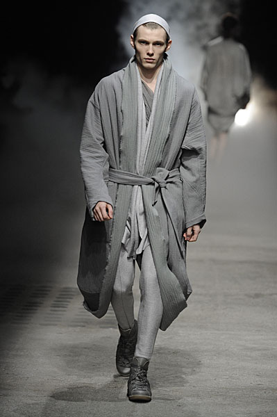Alternating between black and ash gray, Damir Doma uses the fall season as the perfect opportunity to pack the volume back on. Creating his own bubble away from the world, Doma moves to cloak his man from the elements with meticulously constructed layers of seamless draping. Meanwhile, robe-like outerwear and billowing shapes act as a reoccurring theme for Doma as he progresses the collection with an exciting splash of print and the occasional bare leg or two. Ultimately, Doma continues to demonstrate his expertise in executing near effortless silhouettes–fitted or voluminous.