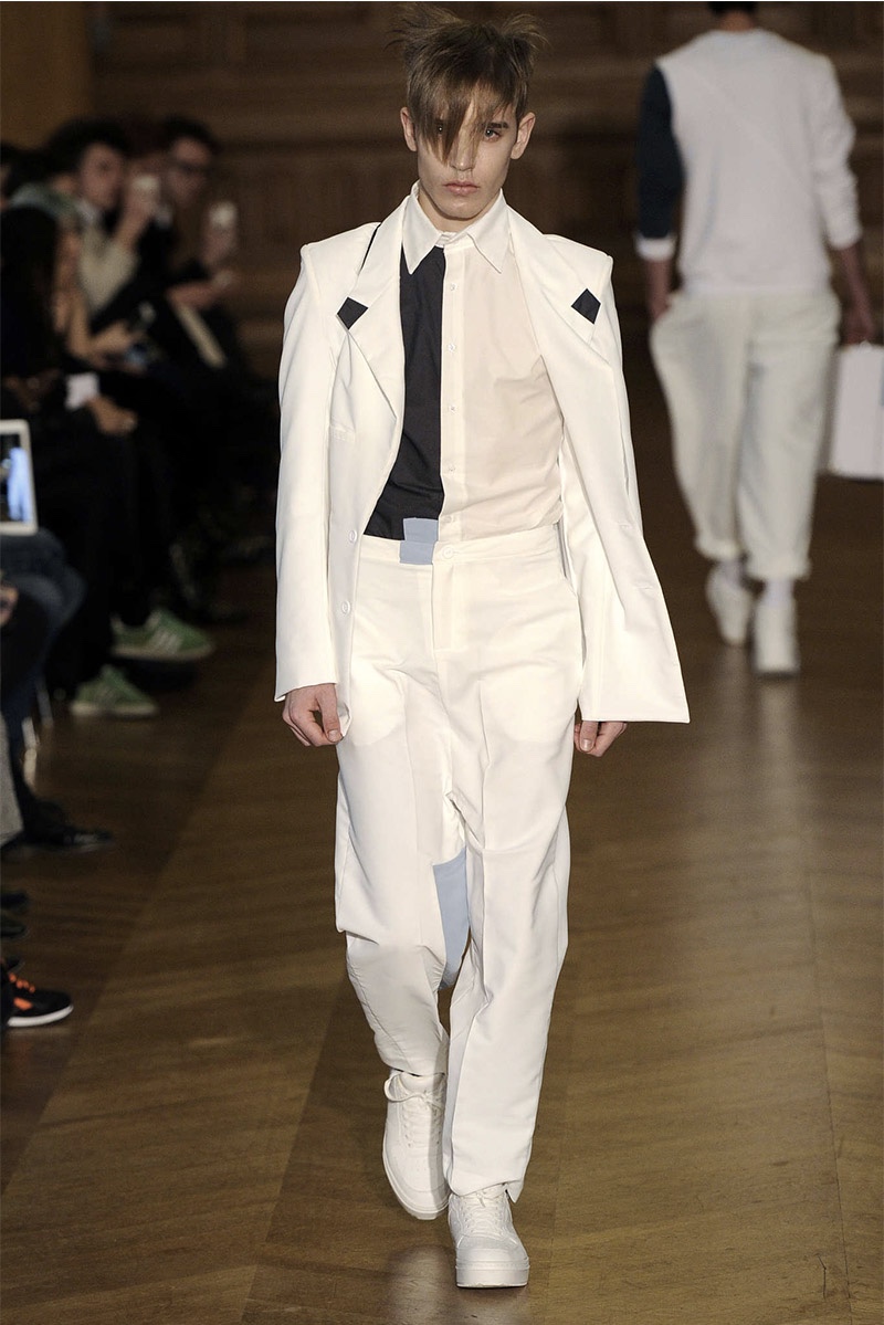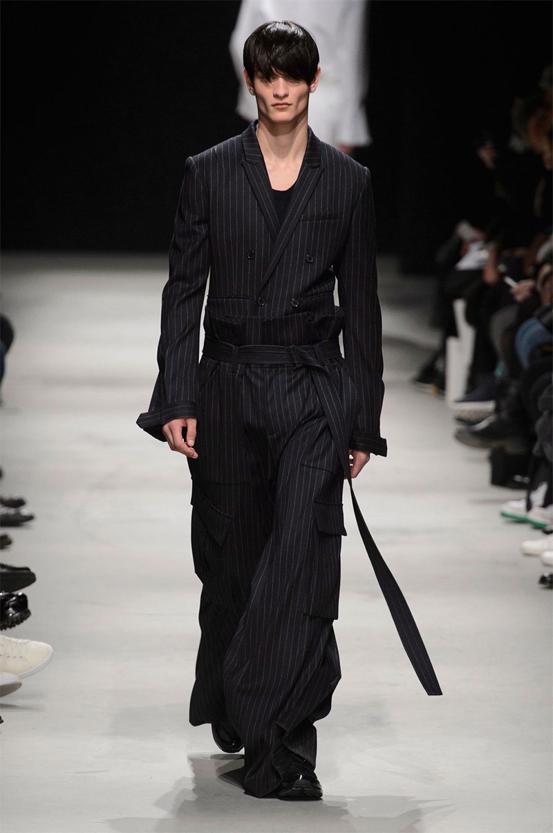 Known for its play on proportions, JUUN.J didn’t disappoint. Contrasting somber military-hued colors against white, oversized coats and jackets were paired with a mix of narrow and wide trousers that gave JUUN.J’s man an interesting style point of view.