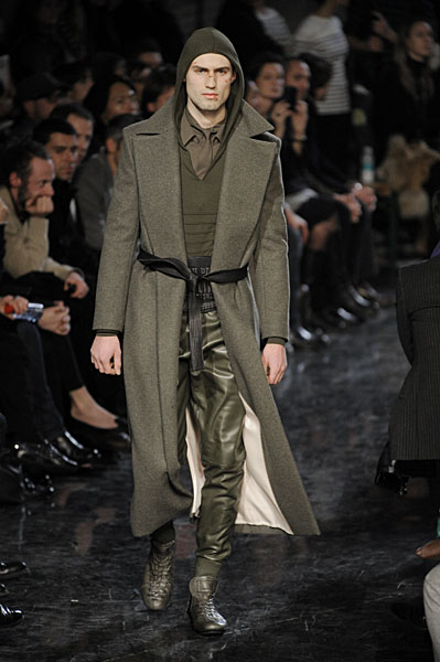 Violence takes center stage on the runway once more this season with Jean Paul Gaultier looking to boxing for inspiration. Avoiding a stale blackout, Gaultier infuses his range with a brilliant mix of silhouettes and standouts modeled after the boxer’s uniform. With enough versatility to be taken in the direction of either casual or formal wear, robe-like outerwear, voluminous waistlines, tapered legs and multi-functional leather give shape to a plethora of ready-to-layer basics and suiting separates.