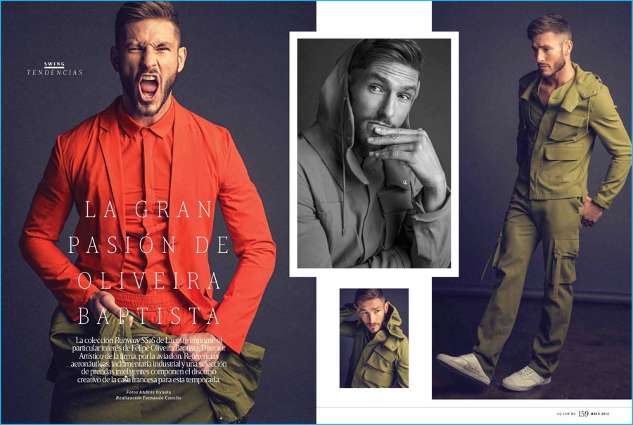 Approaching its May issue, GQ México creates a monochromatic brand story. The magazine hones in on military inspired fashions from Lacoste’s spring-summer 2016 collection. Model Parker Gregory stars in an editorial, connecting with photographer Andrés Oyuela. Sporting strong looks designed by Felipe Oliveira Baptista, Parker is styled by Fernando Carrillo. Parker’s wardrobe includes army green styles with tailored separates. Short jackets, long coats, cargo pants and a statement jumpsuit contribute to the lineup. Wearing white sneakers, Parker also has a suiting moment in a bold red number.