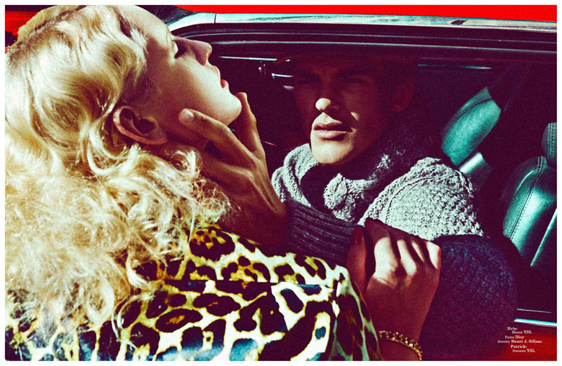 Fast Car–Photographed by Kosmas Pavlos, Austrian male model Patrick Kafka appears in a story titled Liaison Rouge. Joined by model Ilvie Wittek, the Wiener boy showcases a wardrobe made of sophisticated sweaters, refined jackets and fluid trousers, designed among others by Etro, Yves Saint Laurent, Giorgio Armani and Lanvin, for a story that has the cinematic allure of a classic film noir. / Styling by Felix Leblhuber, with hair and makeup by Jody Cuberli.