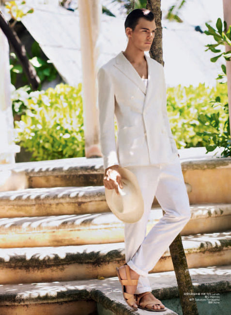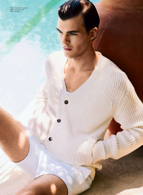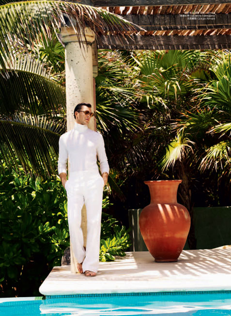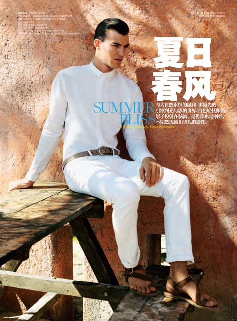 Immaculate–Clad in a spotless white wardrobe pulled together by Grant Woolhead, Patrick Kafka (d’men) smoothly transitions from the summer to the fall in luxurious suiting, casual knits, and tailored trousers. Captured by Dean Isidro for the September issue of GQ China, an elegant Patrick emanates a soothing calm in labels such as Bottega Veneta, Yves Saint Laurent, and Hermes. / Grooming by Danielle Priano.