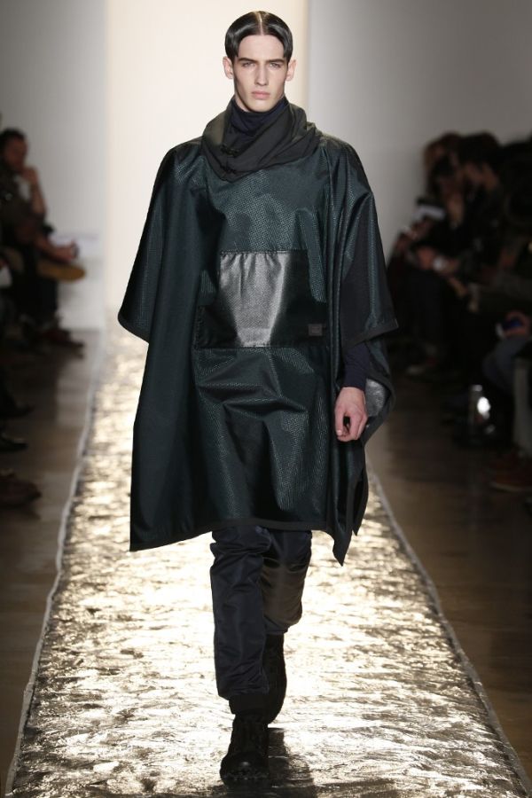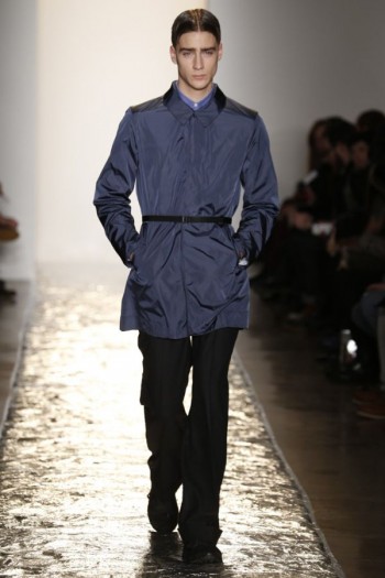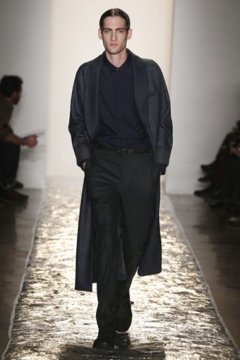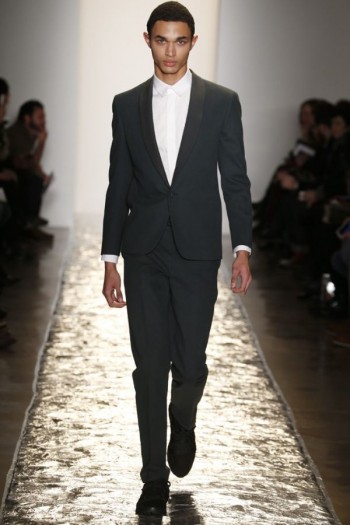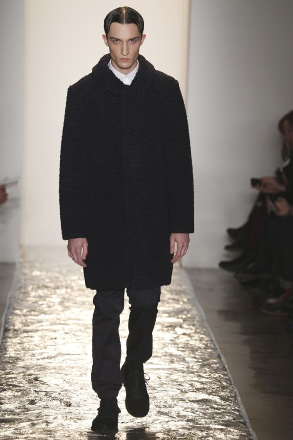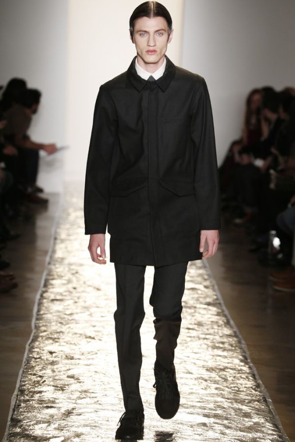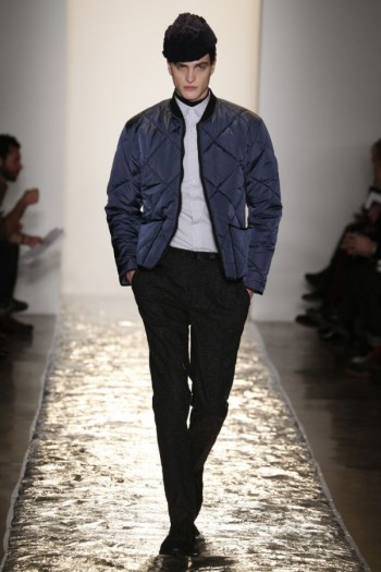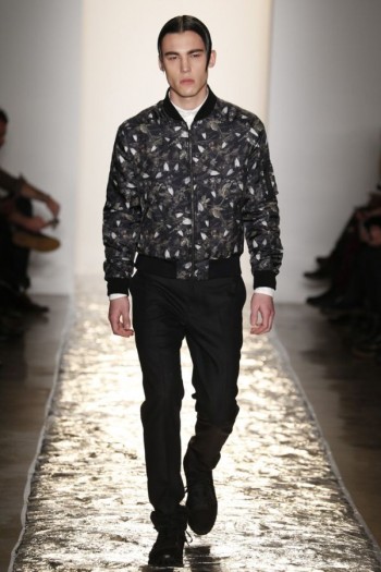 Tailored Camouflage–Retreating to the outdoors with a surprisingly urban angle, Patrik Ervell reinterpreted his signature sharp lines for the fall/winter 2013 season. Maintaining a dark color palette with hints of blue and a splash of foliage, Ervell kept things serious. Capturing the evening with solid black looks, forms were out and front for suiting and outerwear, presented as modest classics. Meanwhile, quilting offered a layer of protection when adapted for a new take on the sweatshirt or bomber. Juxtaposed with the occasional cable-knit sweater or a trim dress shirt, Patrik Ervell remains true to his sharp standard with an interesting motif shift for the season.