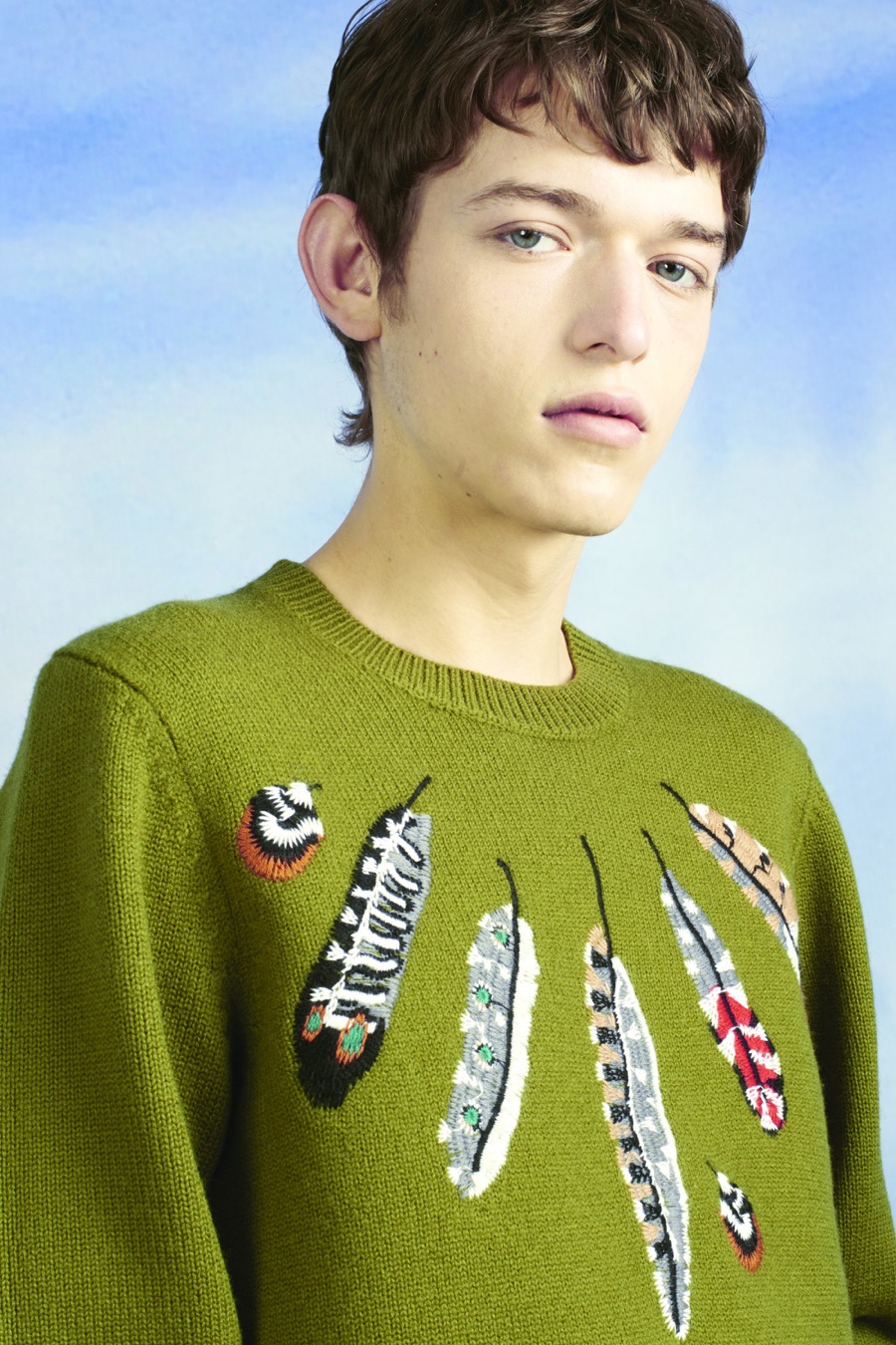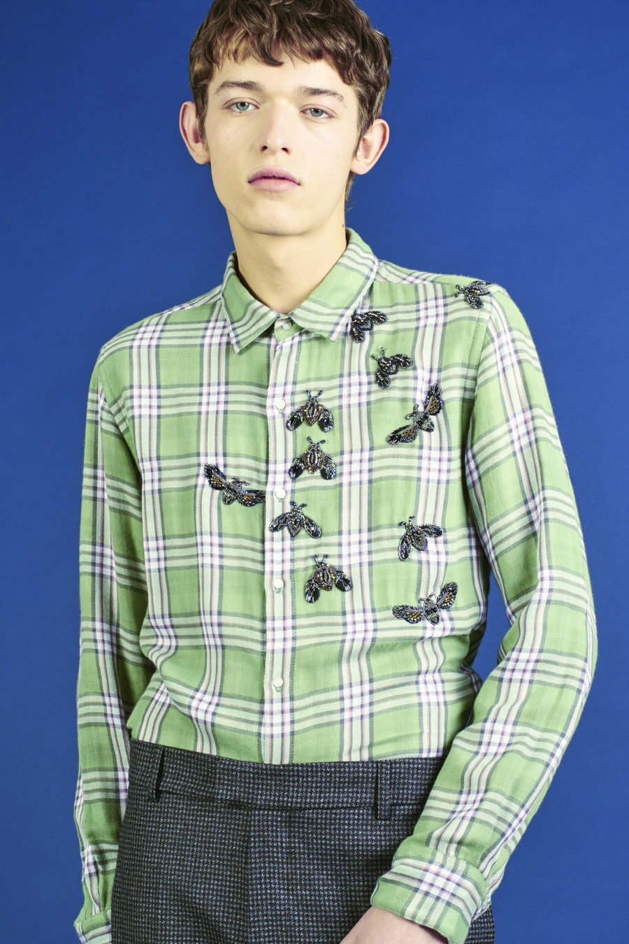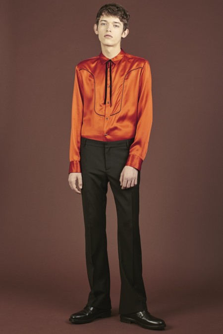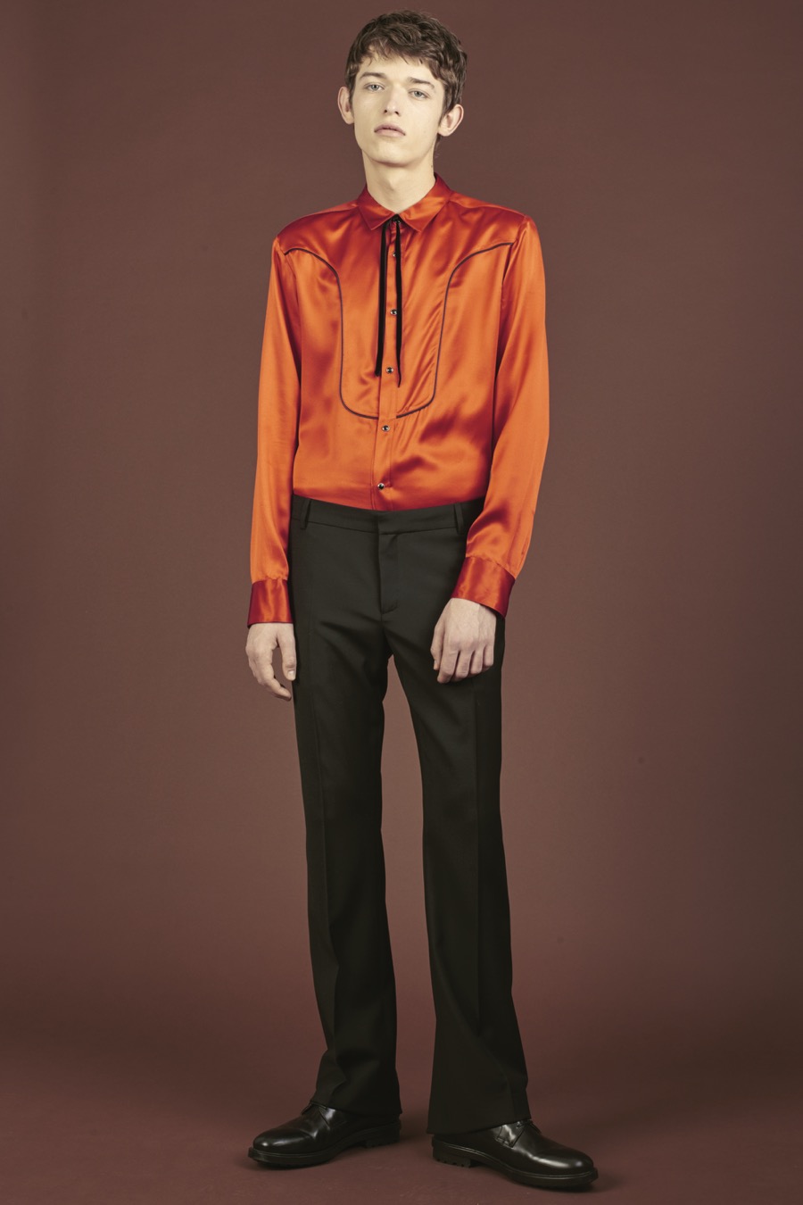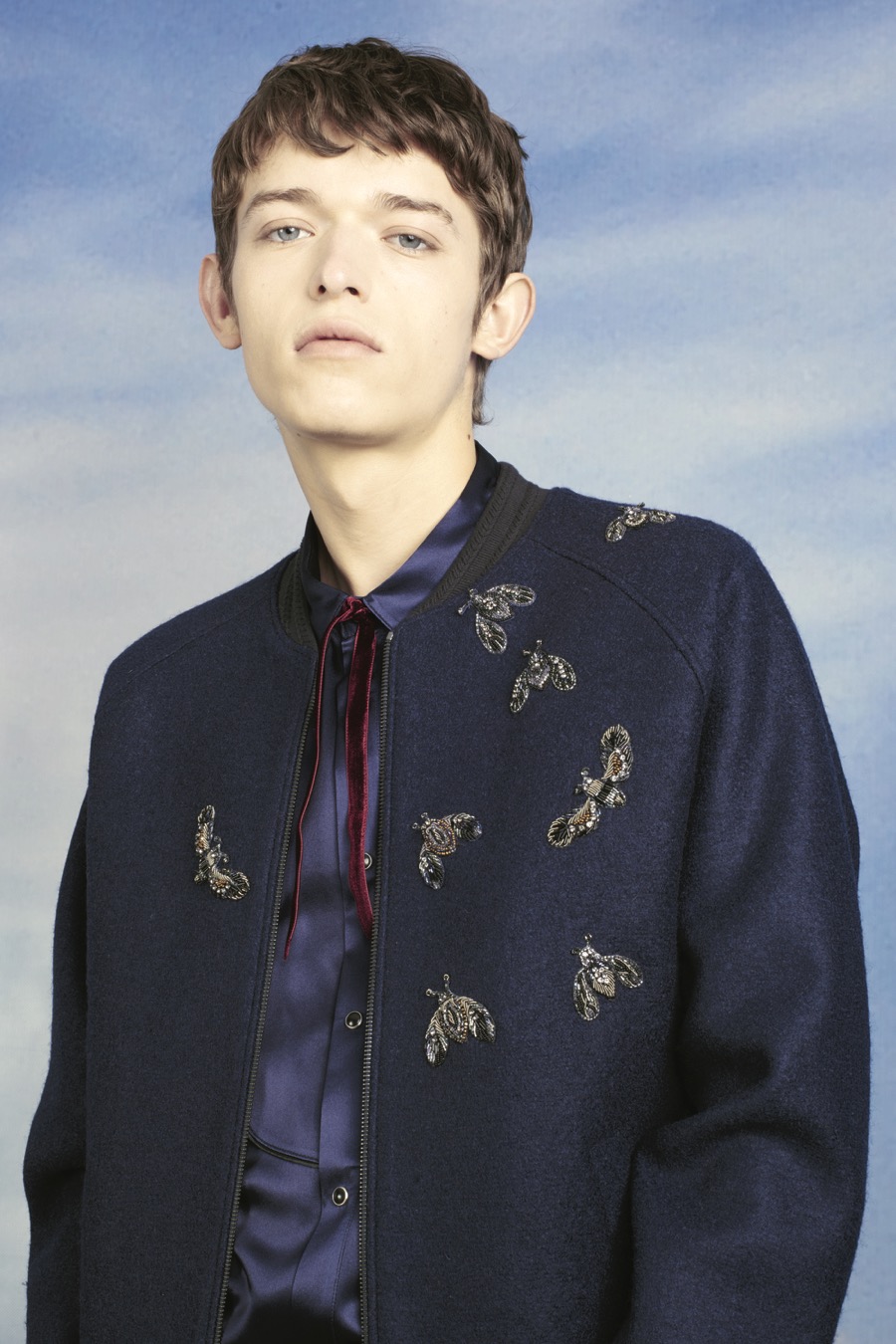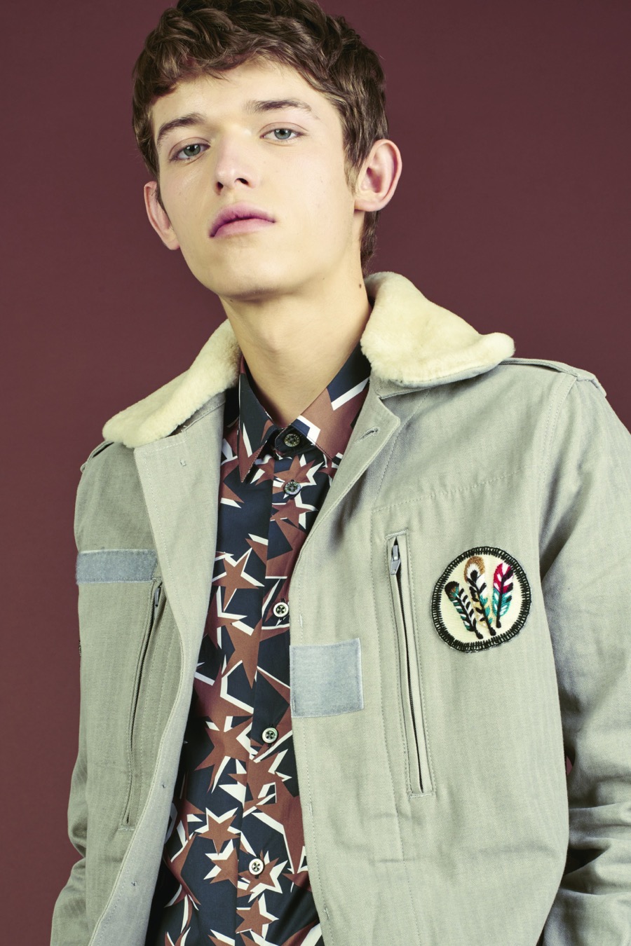 Paul & Joe embraces a western state of mind for fall-winter 2016. The Parisian label’s men’s collection adopts southwestern styles with a youthful and campy point of view. Feathers, flowers and stars come together for the season’s graphic prints. Championing the western shirt, Paul & Joe also makes a case for fall’s trendy reversed shearling. Other items of interest include patterned suiting, velvet ribbon ties and embellished outerwear.