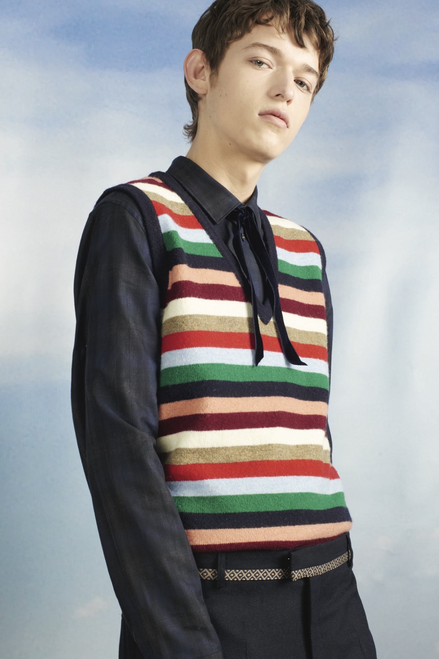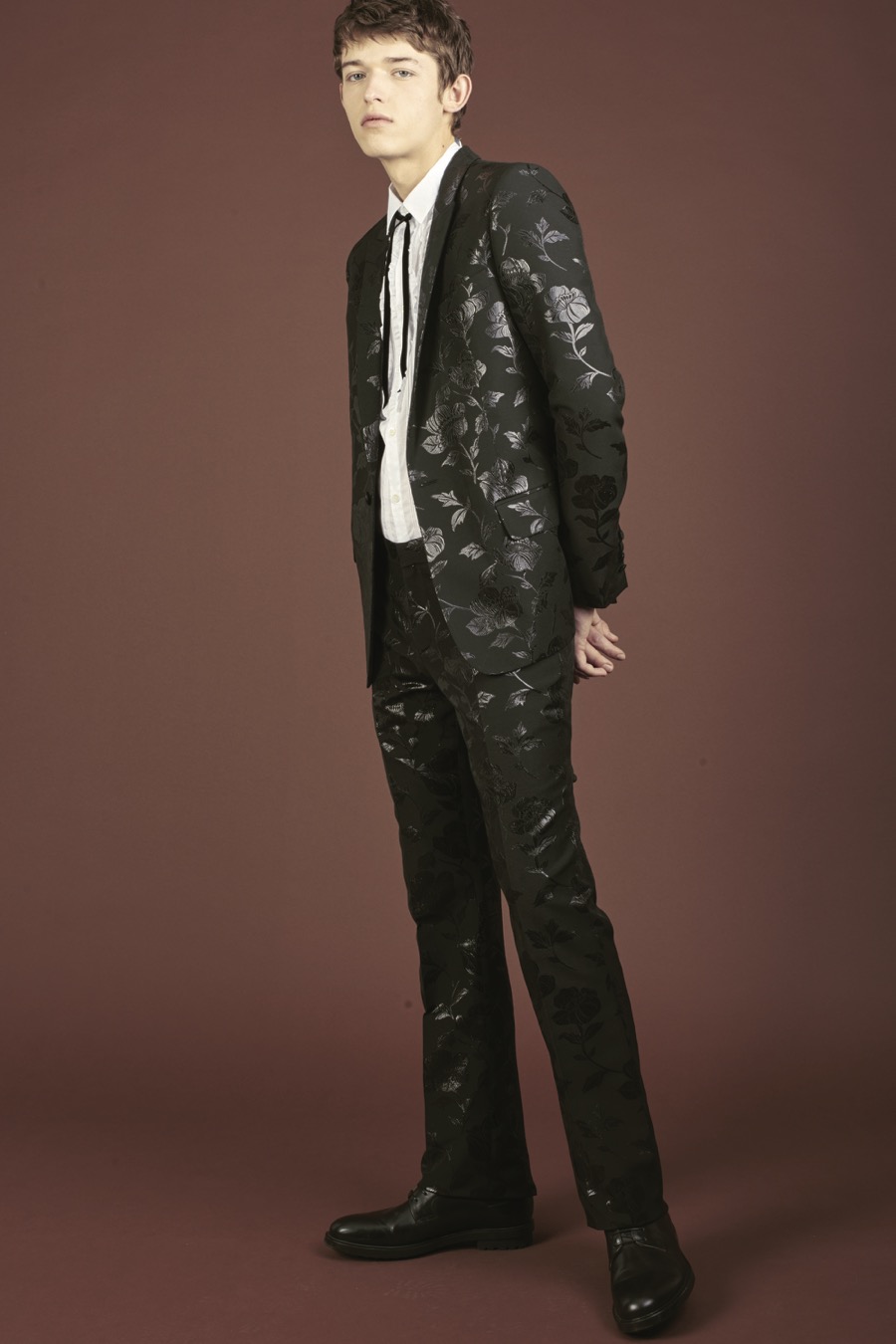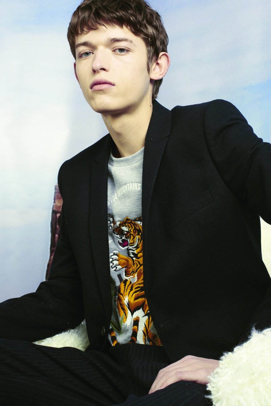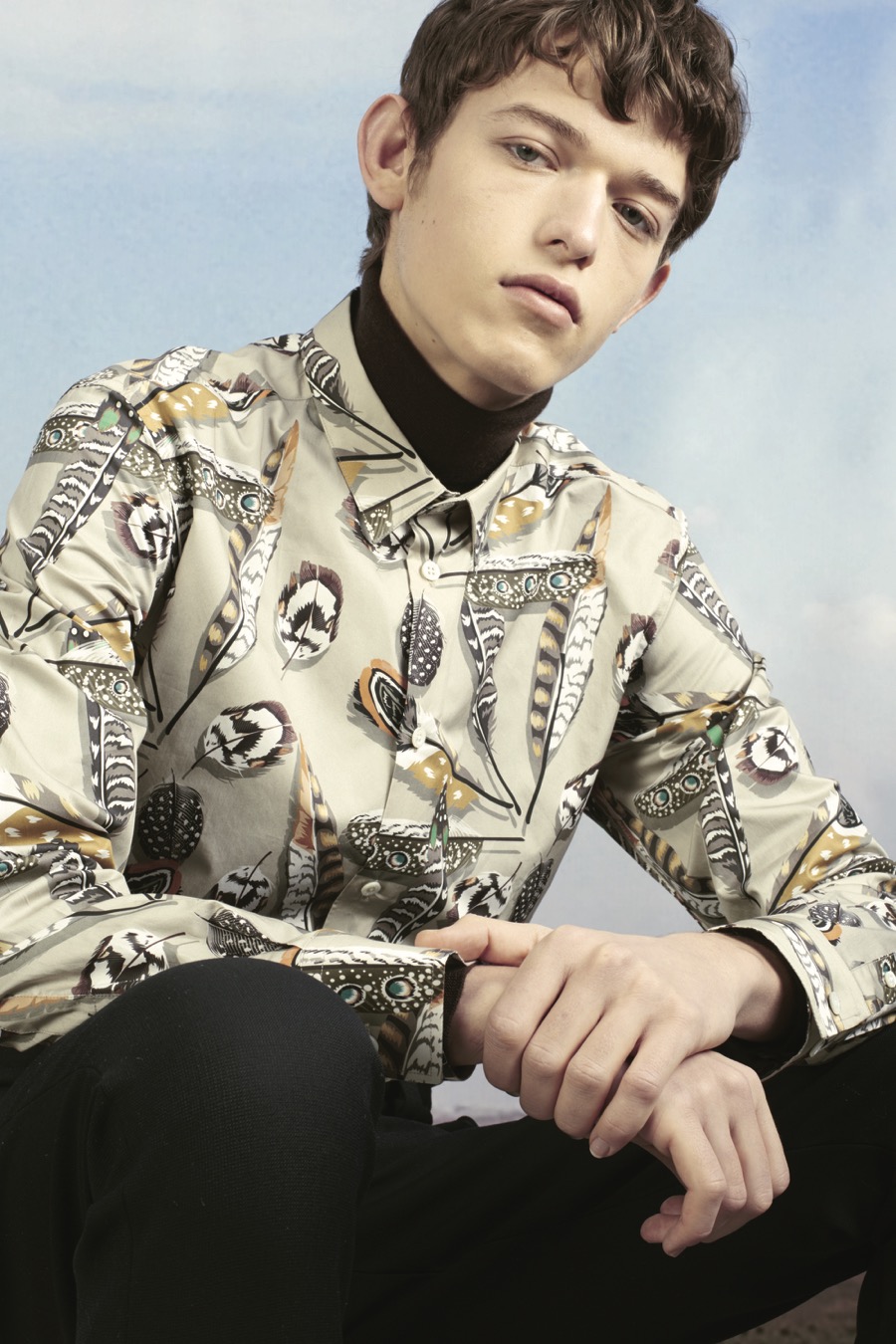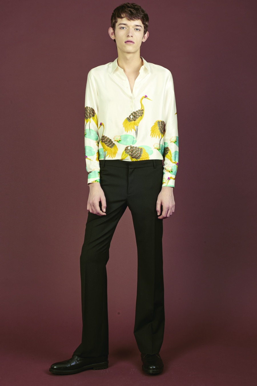 Paul & Joe embraces a western state of mind for fall-winter 2016. The Parisian label’s men’s collection adopts southwestern styles with a youthful and campy point of view. Feathers, flowers and stars come together for the season’s graphic prints. Championing the western shirt, Paul & Joe also makes a case for fall’s trendy reversed shearling. Other items of interest include patterned suiting, velvet ribbon ties and embellished outerwear.