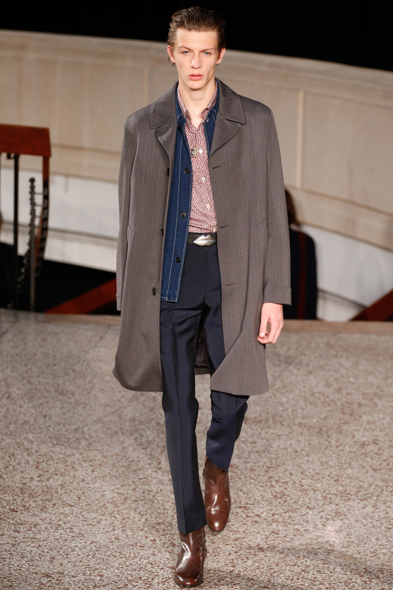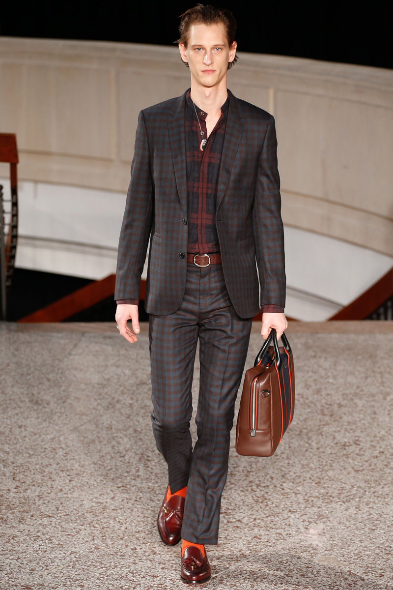 Paul Smith underscored a vibrancy in menswear as the British label presented its fall-winter 2016 men’s collection during Paris Fashion Week. Bold colors were front and center with the range playfully mixing bright hues. Smart separates came forth with striped bars and silhouettes that catered to the lean side. Subtle flares brought a 70s attitude to pleated trousers. Accompanied by turtlenecks and tops with elongated sleeves, essential tailoring was dressed up in plaids and checks. Leather coats were thin and sleek while distressed denim injected the suave collection with a certain casualness.