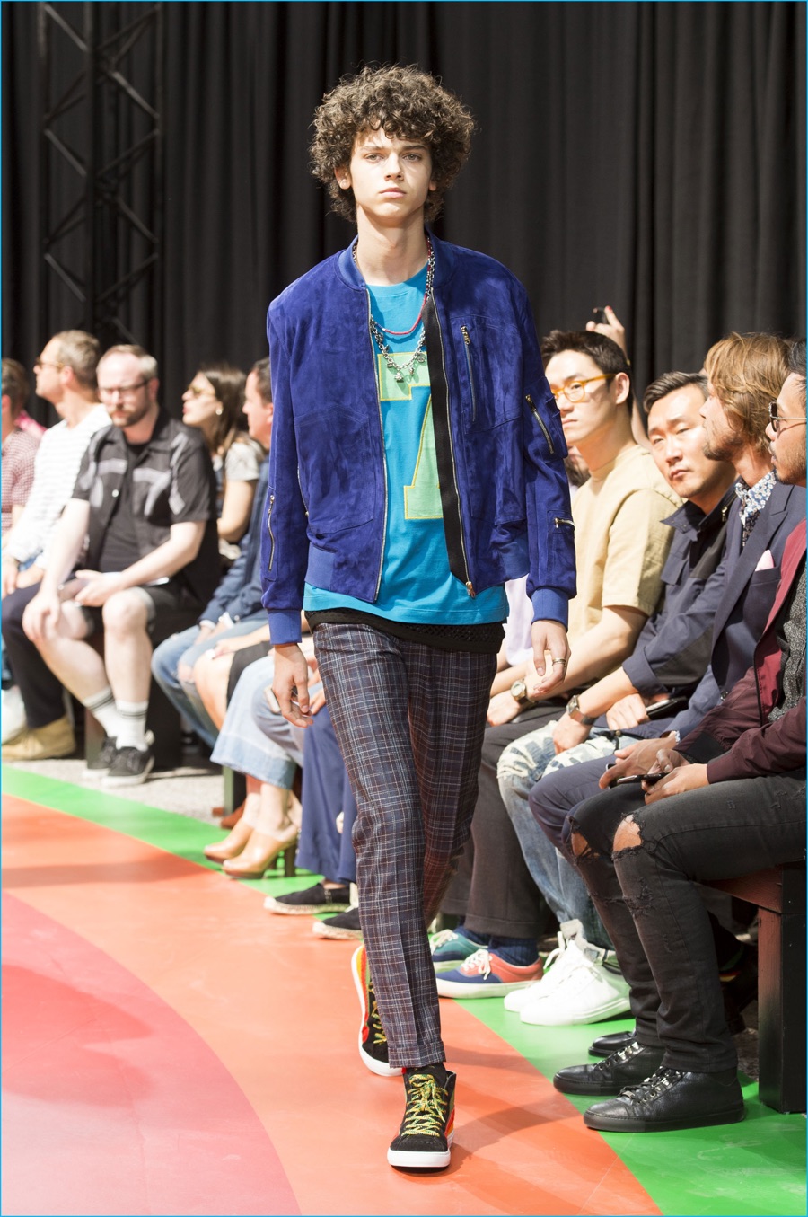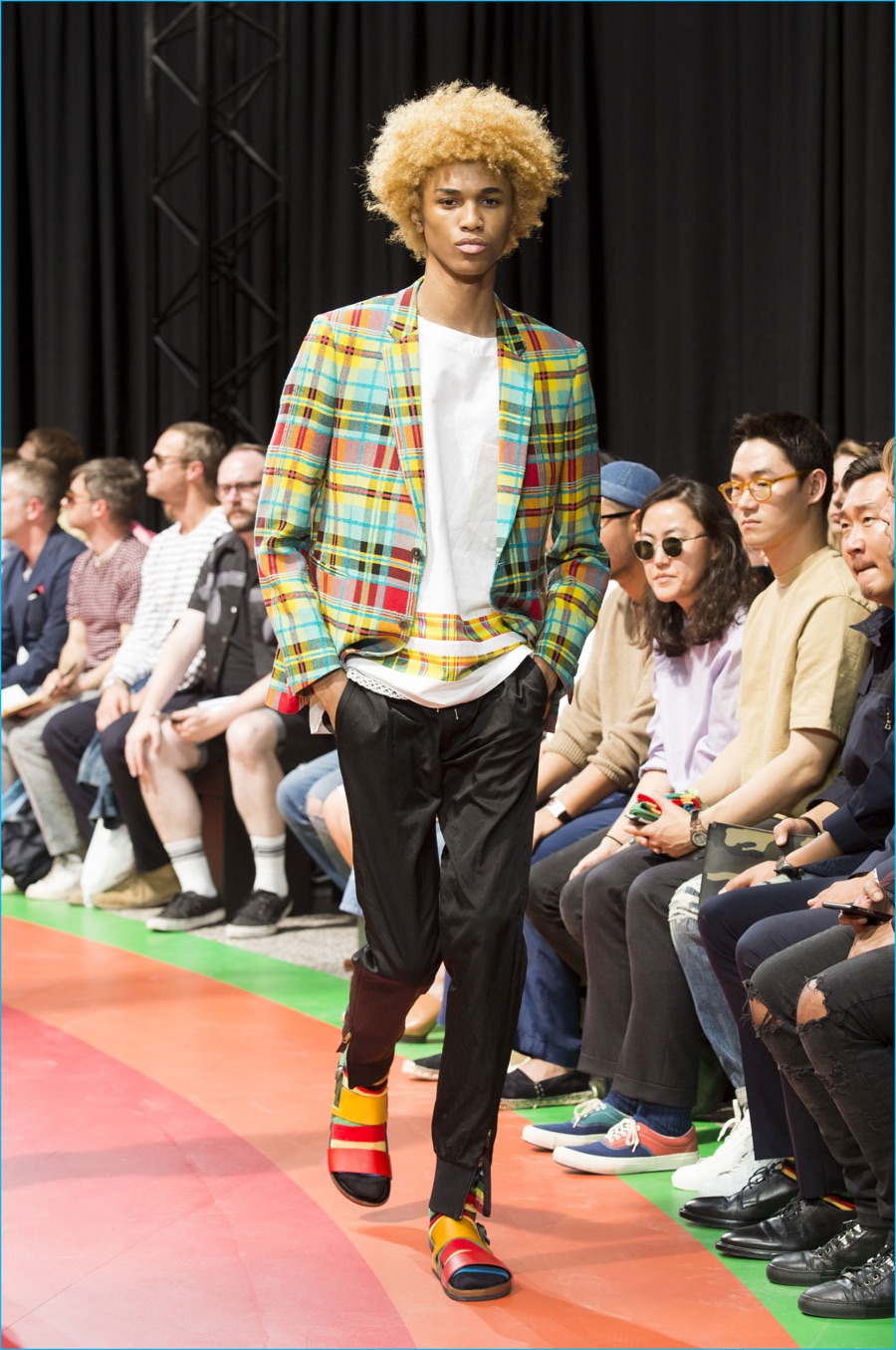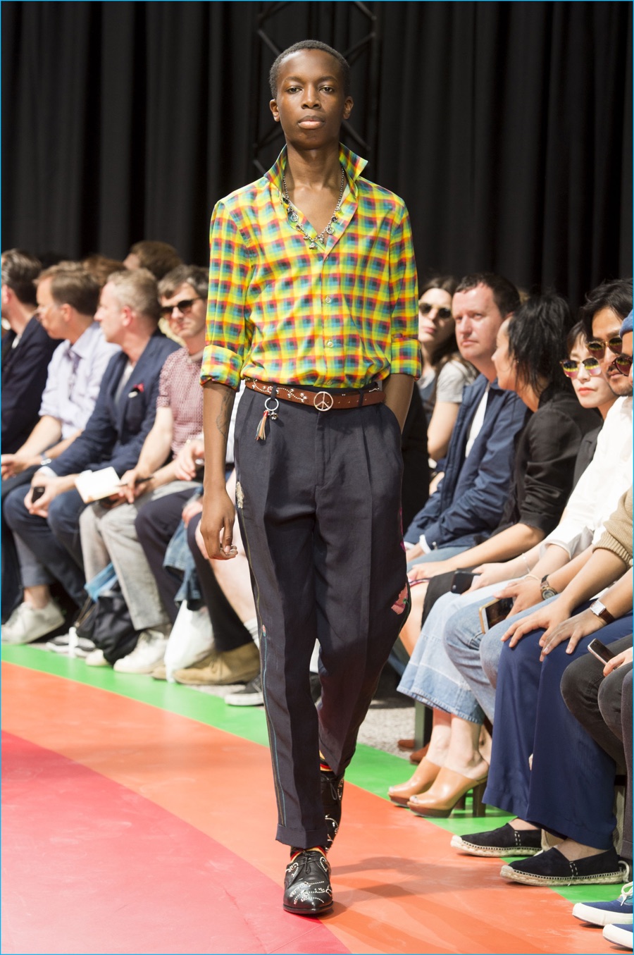 Paul Smith spread peace with his spring-summer 2017 men’s collection. Unveiled during Paris Fashion Week as usual, the selection balanced the brand’s wearable signatures with a bold, graphic flair. Tropical hued tartan brought an easy attitude to sportcoats, backpacks, bombers and shirting. The English designer also looked to hockey for the silhouette of fun, casual tees. Honing in on suiting for the season, Smith revisited 60s tailoring for summerweight wool numbers. Tying the season’s upbeat theme together, patched denim jeans, colorful striped collars and peace sign embellishments charmed.