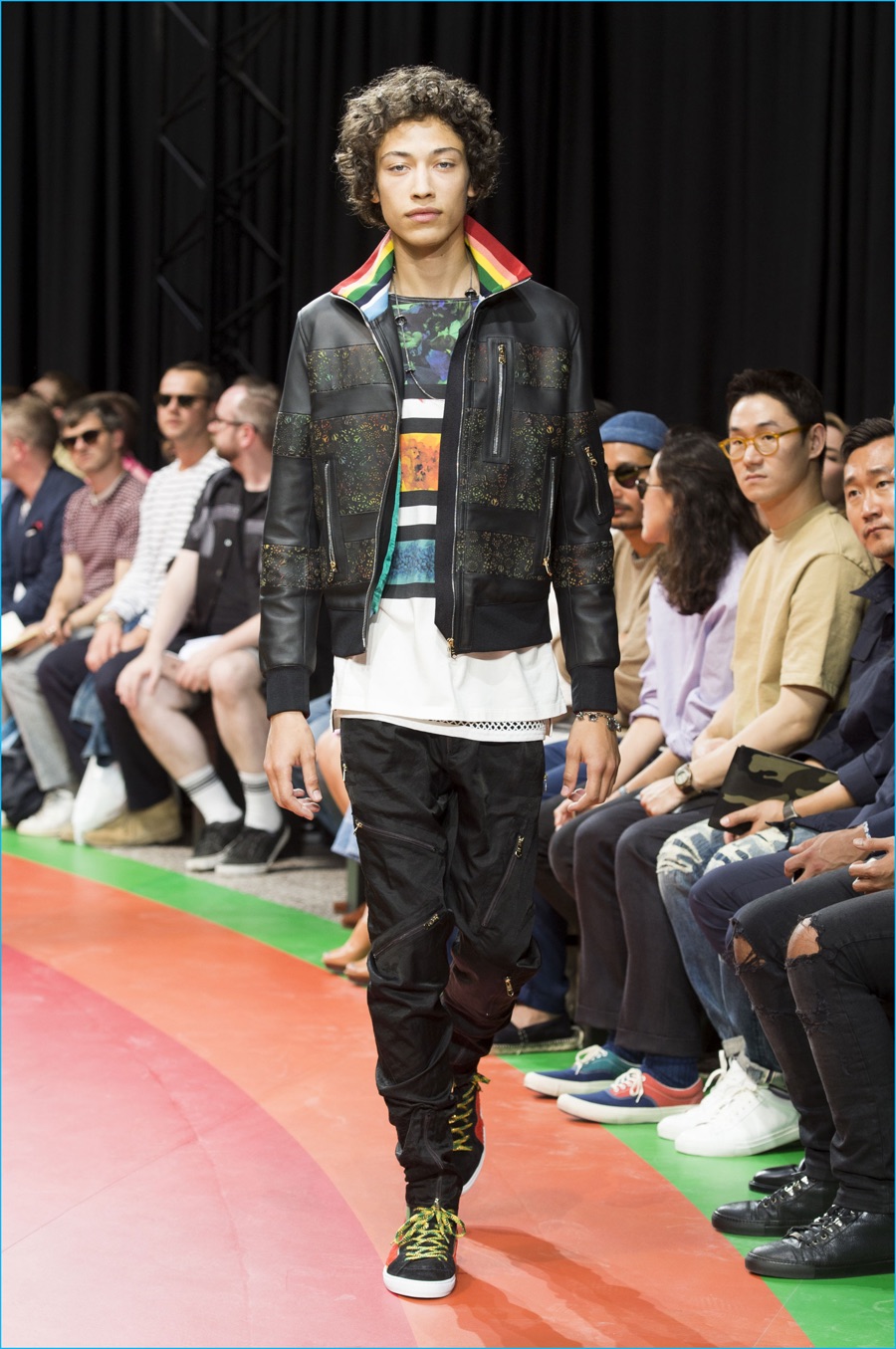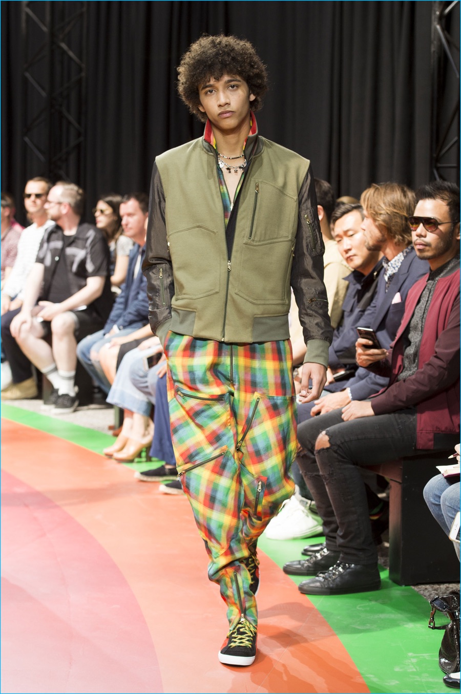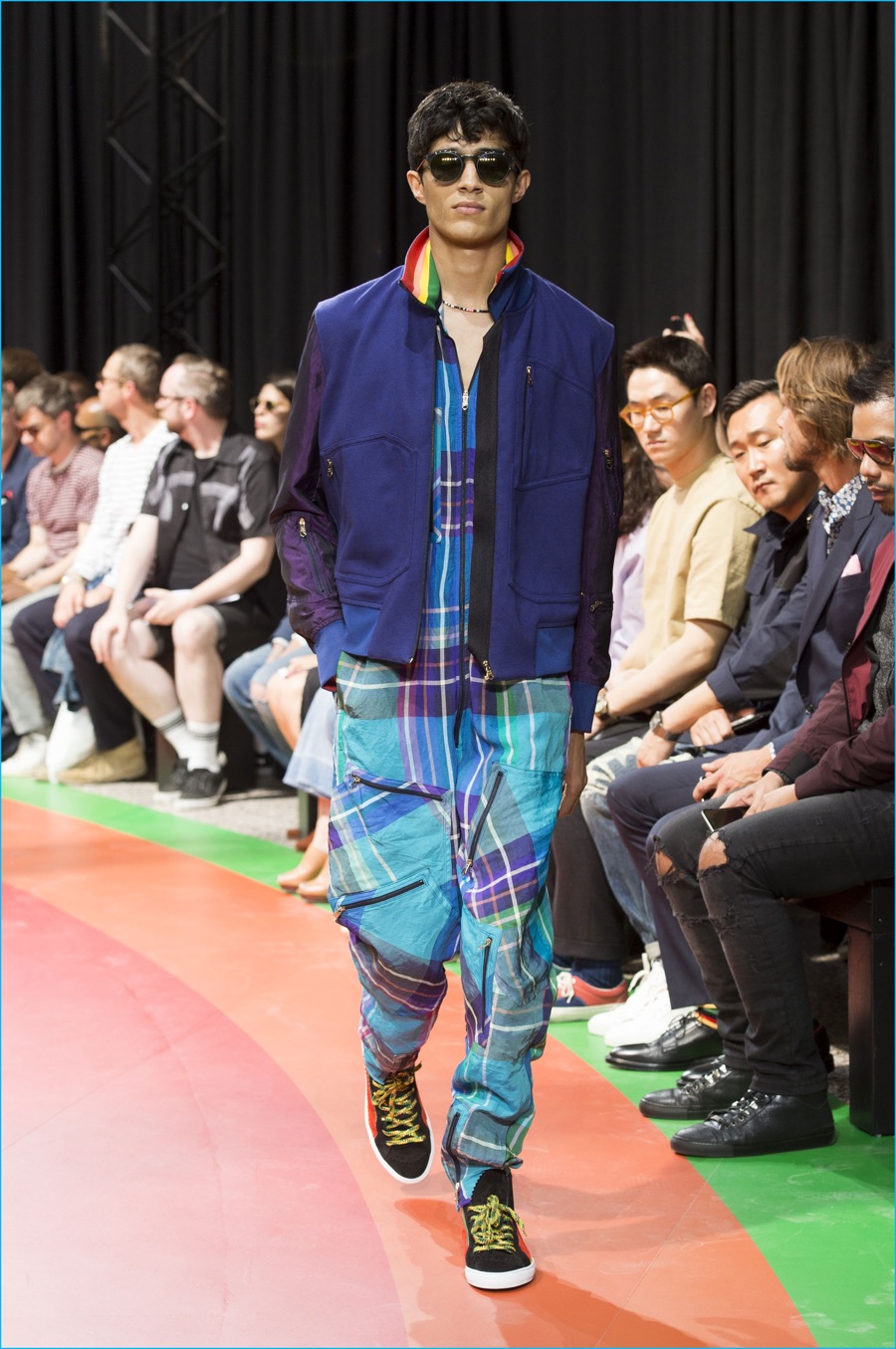 Paul Smith spread peace with his spring-summer 2017 men’s collection. Unveiled during Paris Fashion Week as usual, the selection balanced the brand’s wearable signatures with a bold, graphic flair. Tropical hued tartan brought an easy attitude to sportcoats, backpacks, bombers and shirting. The English designer also looked to hockey for the silhouette of fun, casual tees. Honing in on suiting for the season, Smith revisited 60s tailoring for summerweight wool numbers. Tying the season’s upbeat theme together, patched denim jeans, colorful striped collars and peace sign embellishments charmed.