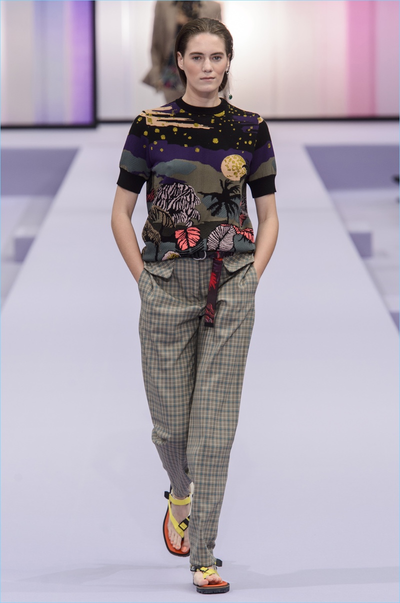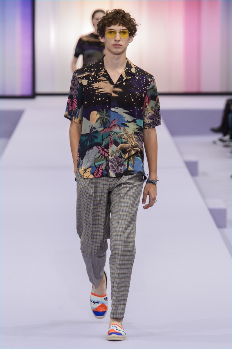 Paul Smith revisits his own archives as inspiration for spring-summer 2018. Recalling the seventies, when he often sold vintage Hawaiian shirts, Smith focuses on a tropical motif for the season. Smith’s signature flair for traditional British style begins with sharp suiting, before taking us on vacation. Offering up relaxed silhouettes, the range features a colorful mixing of shirts and statement suits. Adding strong character with prints, Smith’s standouts include tropical print shirts, trousers, sweaters, and even jackets.