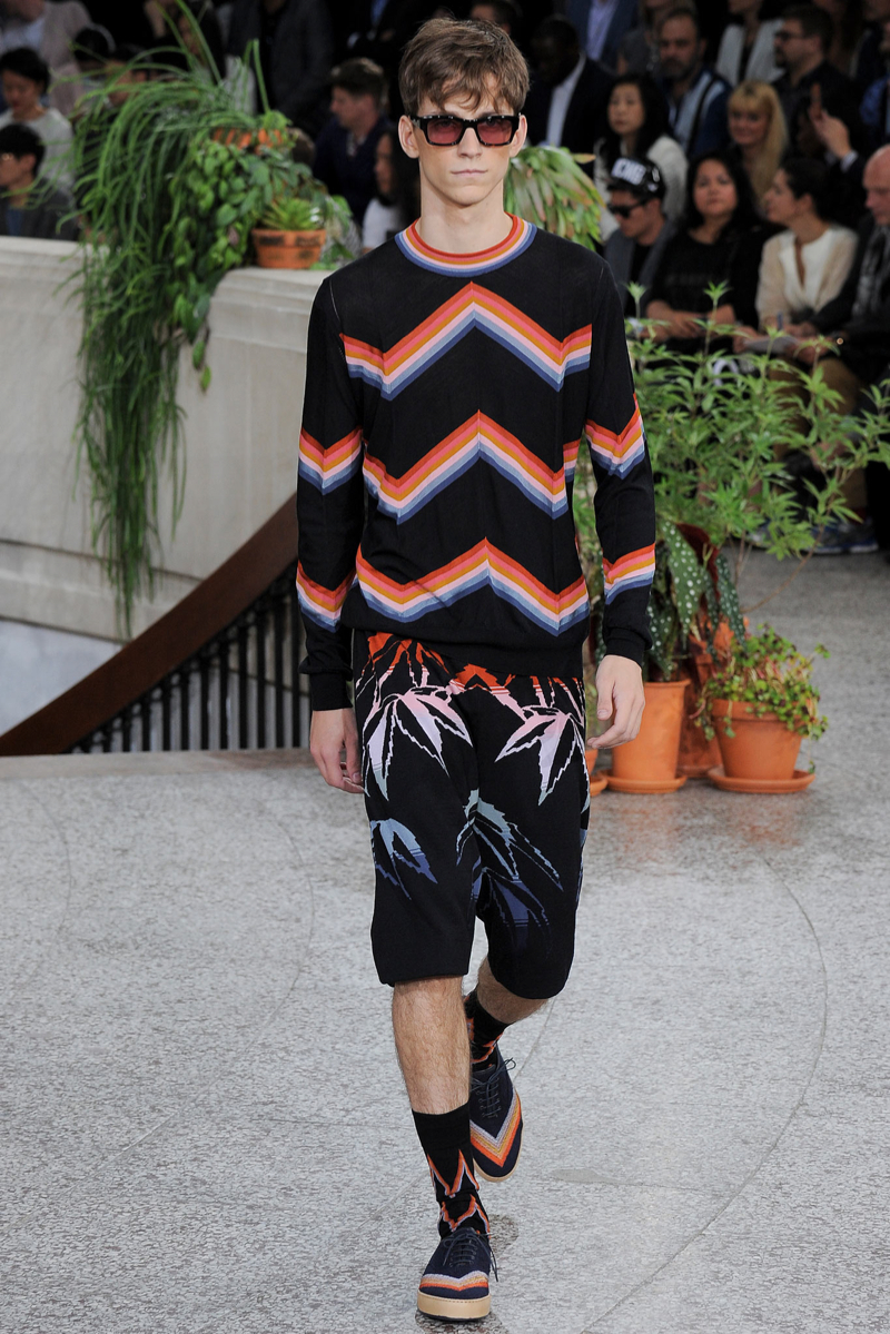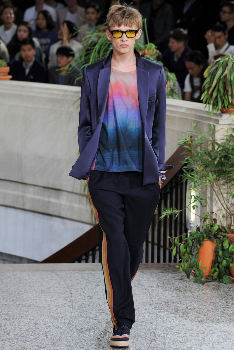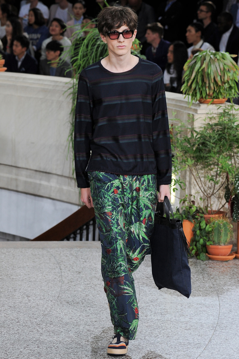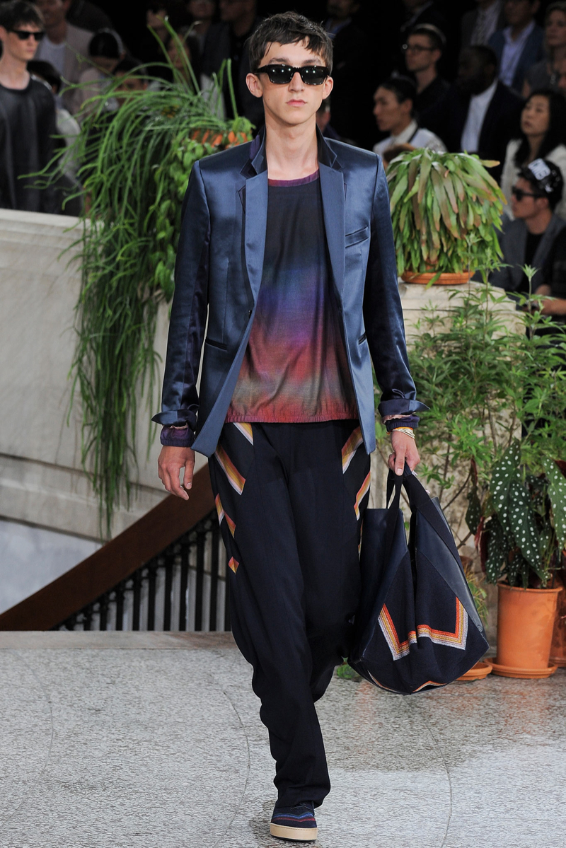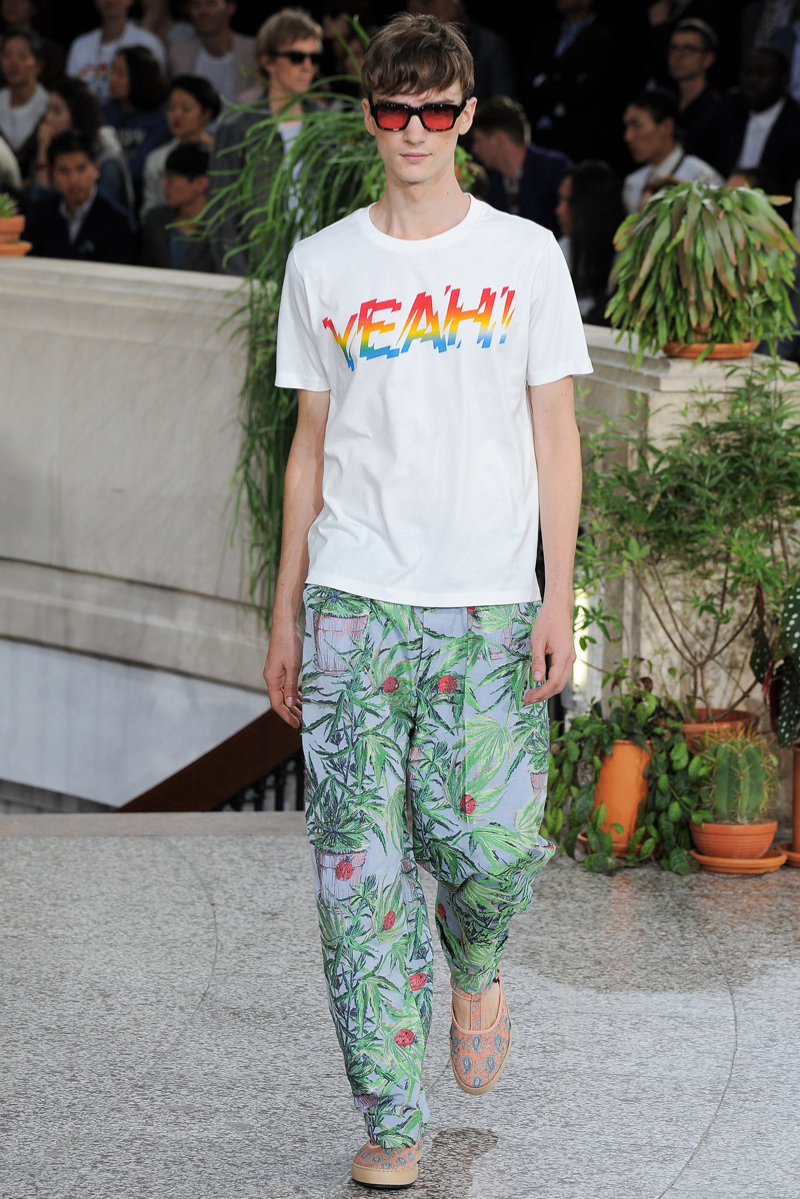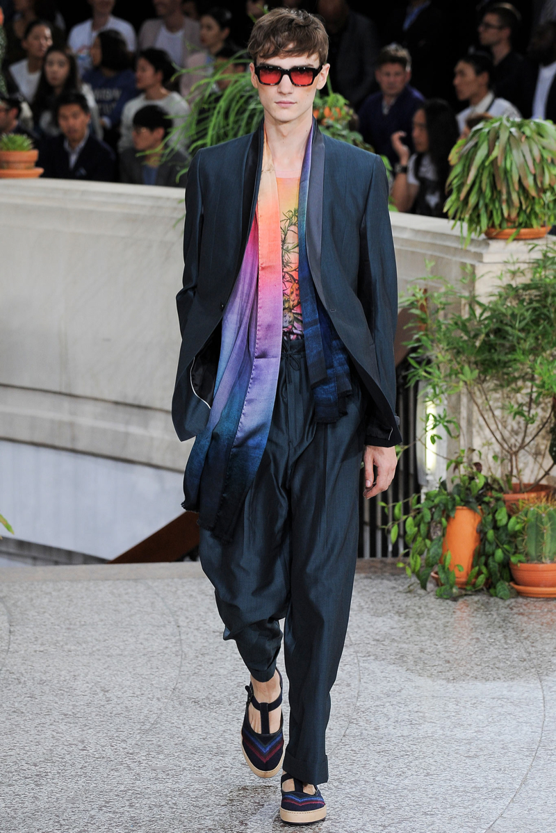 Paul Smith Spring/Summer 2015–Paul Smith had another psychedelic outing for spring/summer 2015, turning to a gamut of colors and cheeky prints of pot. Relaxed with an edge, silk trousers were an elevated step from pajama bottoms. Scarves, plaid shorts and tops were completed with fringe for a defiant look that went right along with bright diagonal prints. Gradients also came into play, embracing vivid watercolors. From short-sleeve tees and billowing trousers to casual knit pullovers, the Paul Smith man was one of the most relaxed imabges during Paris Fashion Week, ending with a resounding ‘Yeah!’ (yes, the closing t-shirt said that!)