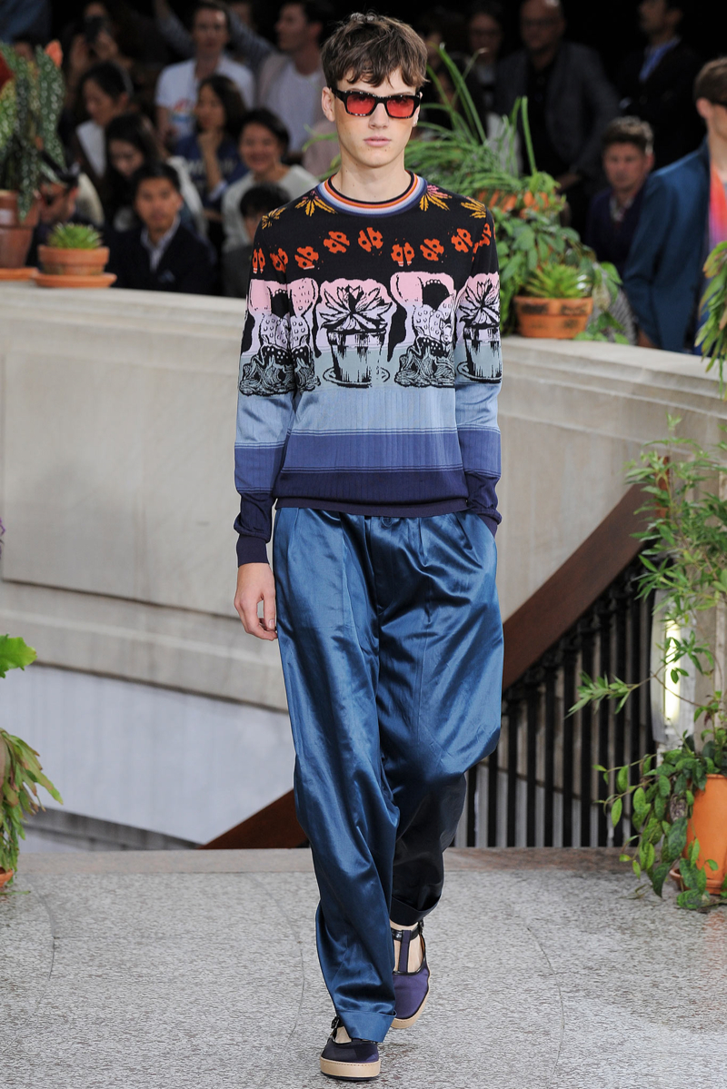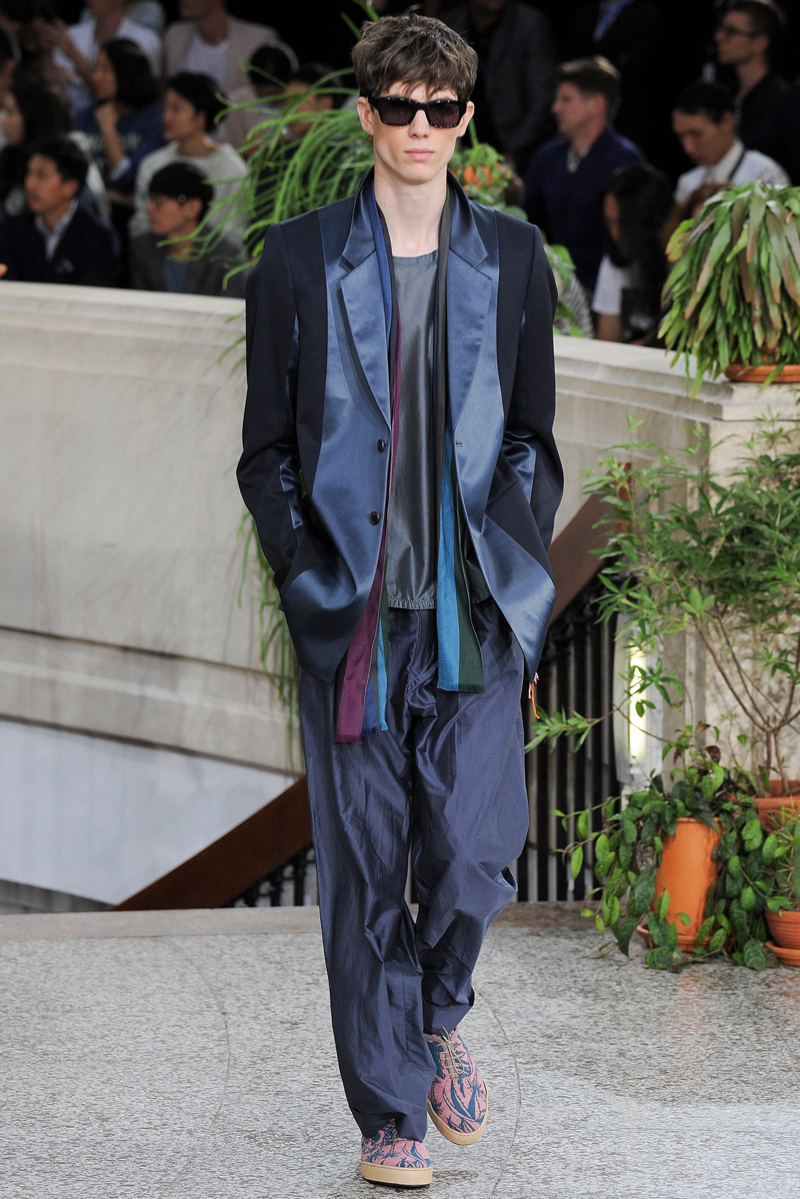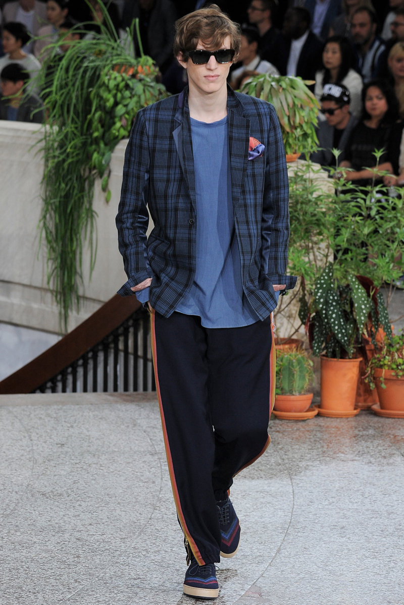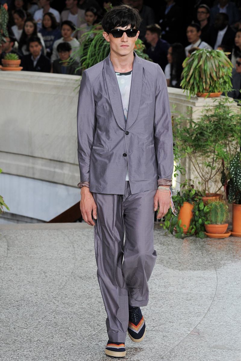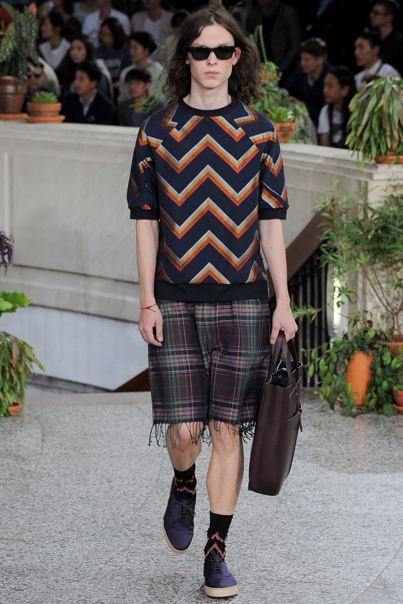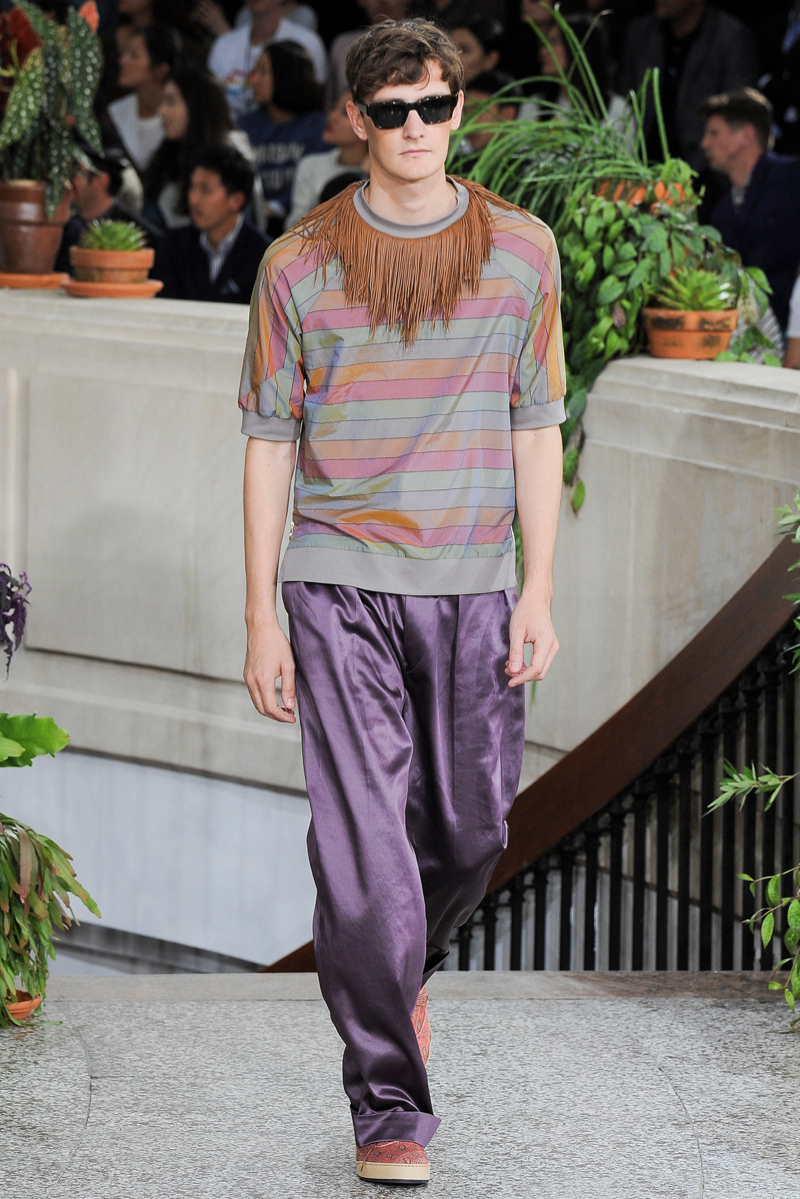 Paul Smith Spring/Summer 2015–Paul Smith had another psychedelic outing for spring/summer 2015, turning to a gamut of colors and cheeky prints of pot. Relaxed with an edge, silk trousers were an elevated step from pajama bottoms. Scarves, plaid shorts and tops were completed with fringe for a defiant look that went right along with bright diagonal prints. Gradients also came into play, embracing vivid watercolors. From short-sleeve tees and billowing trousers to casual knit pullovers, the Paul Smith man was one of the most relaxed imabges during Paris Fashion Week, ending with a resounding ‘Yeah!’ (yes, the closing t-shirt said that!)