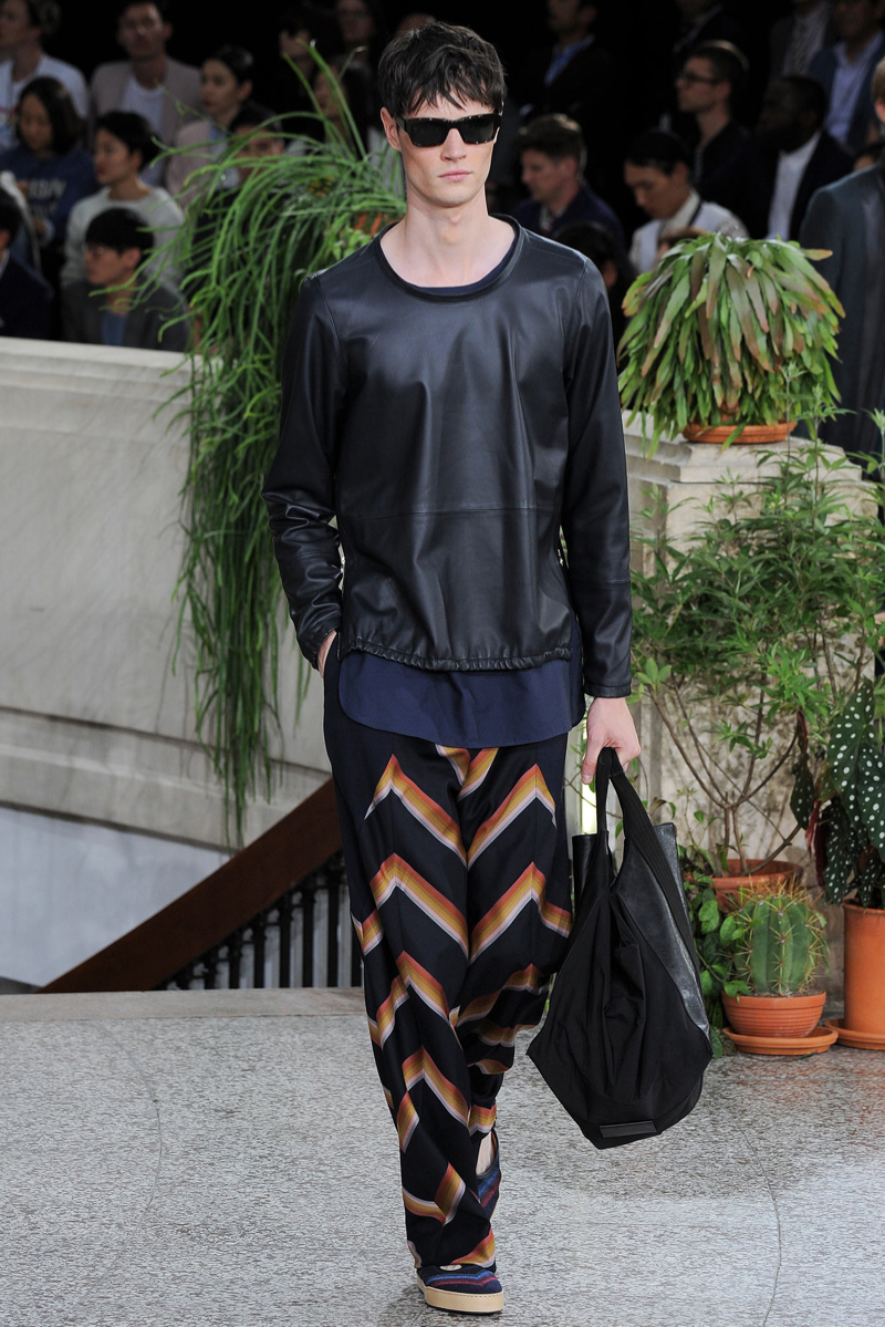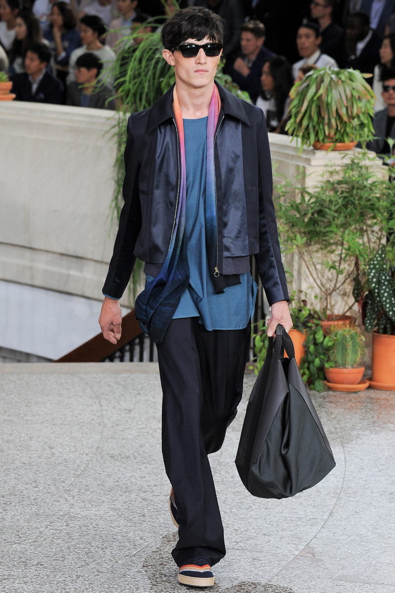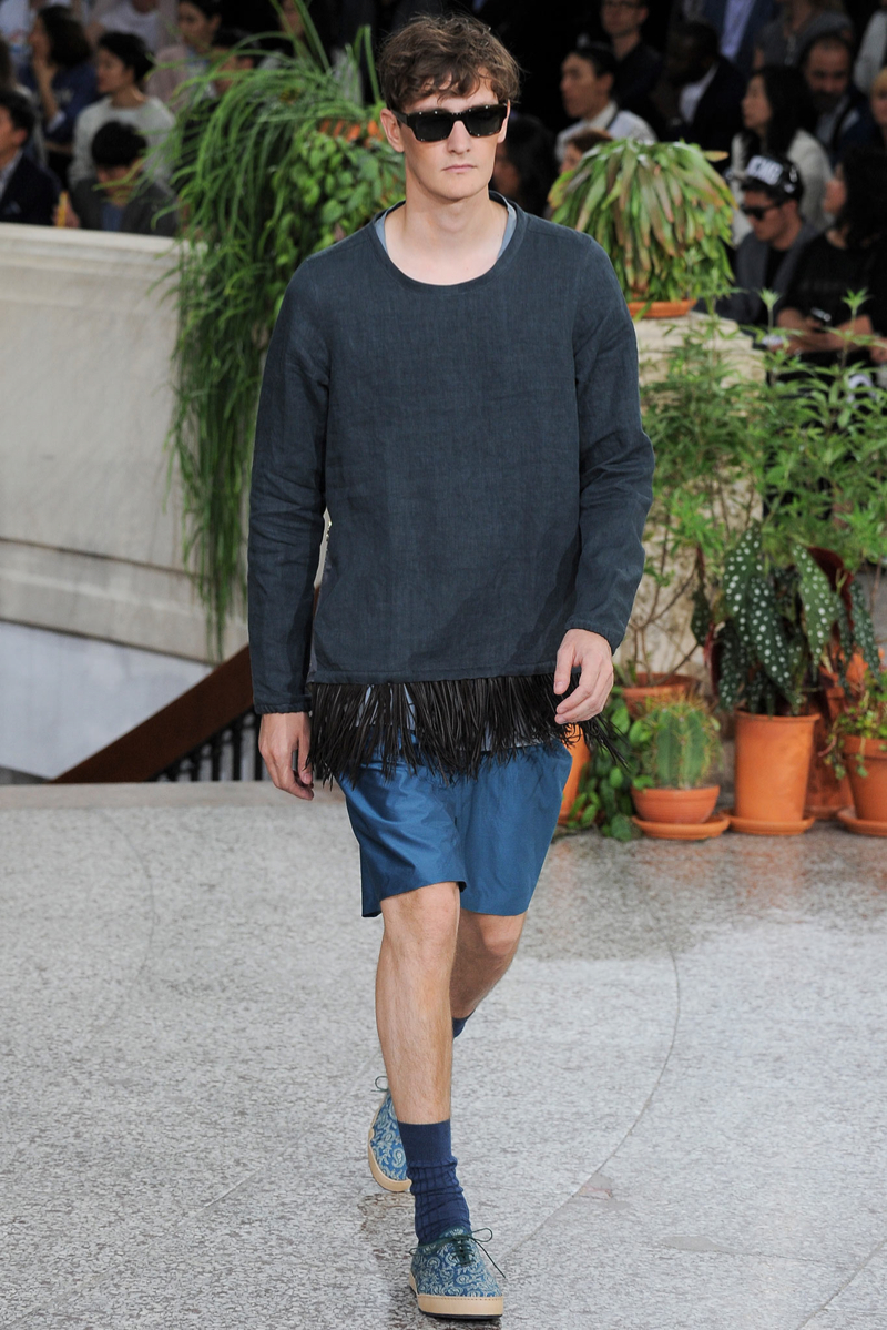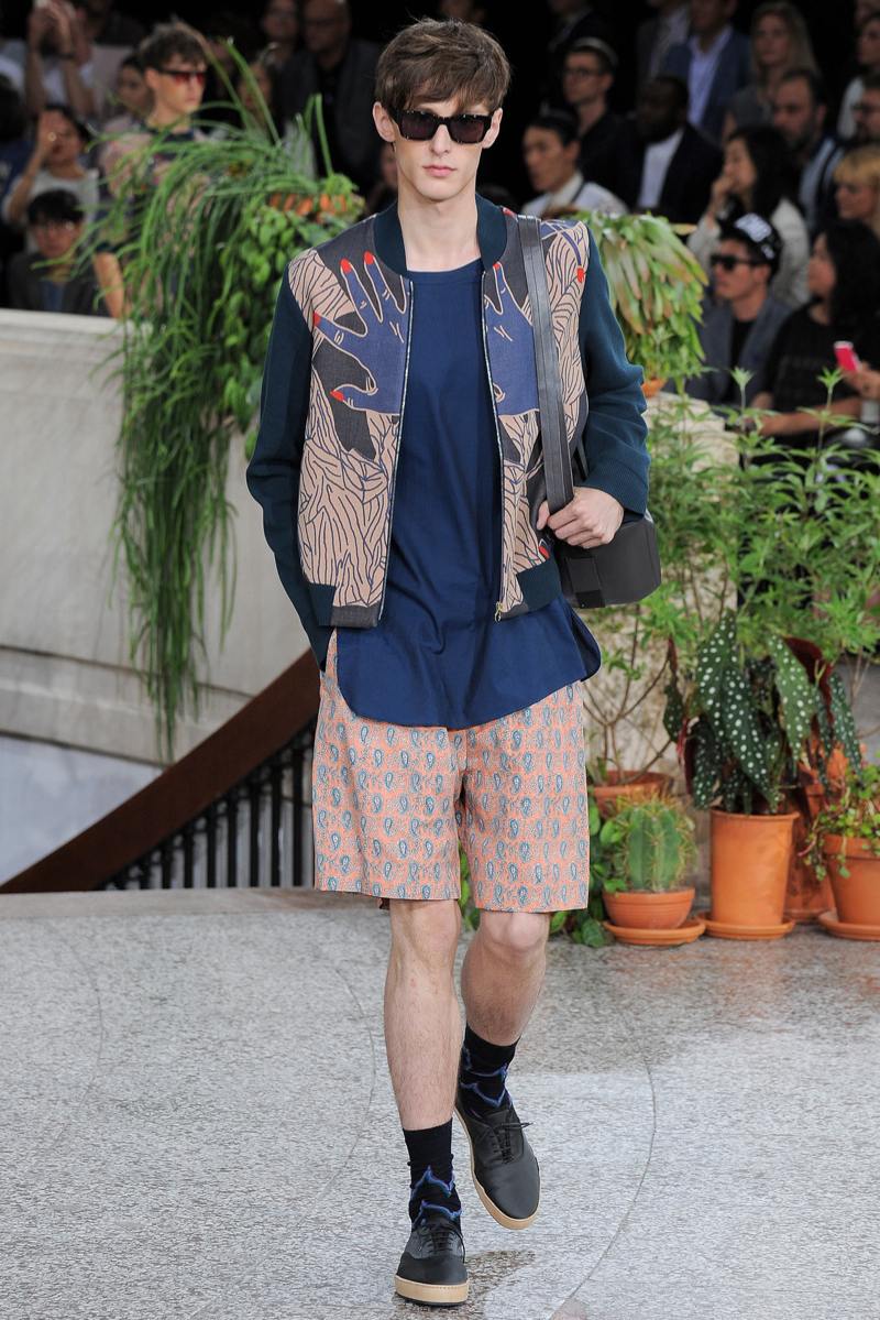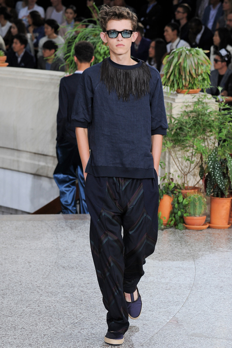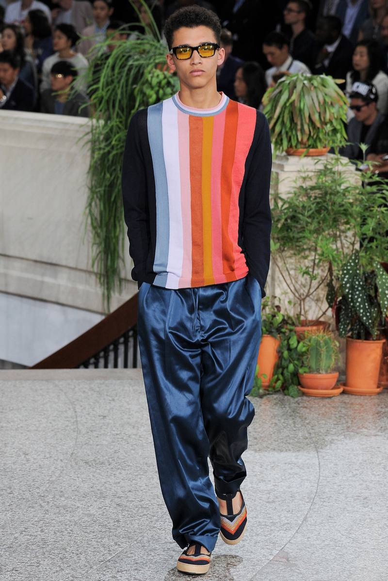 Paul Smith Spring/Summer 2015–Paul Smith had another psychedelic outing for spring/summer 2015, turning to a gamut of colors and cheeky prints of pot. Relaxed with an edge, silk trousers were an elevated step from pajama bottoms. Scarves, plaid shorts and tops were completed with fringe for a defiant look that went right along with bright diagonal prints. Gradients also came into play, embracing vivid watercolors. From short-sleeve tees and billowing trousers to casual knit pullovers, the Paul Smith man was one of the most relaxed imabges during Paris Fashion Week, ending with a resounding ‘Yeah!’ (yes, the closing t-shirt said that!)