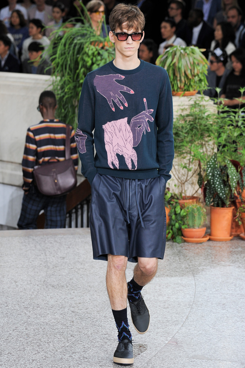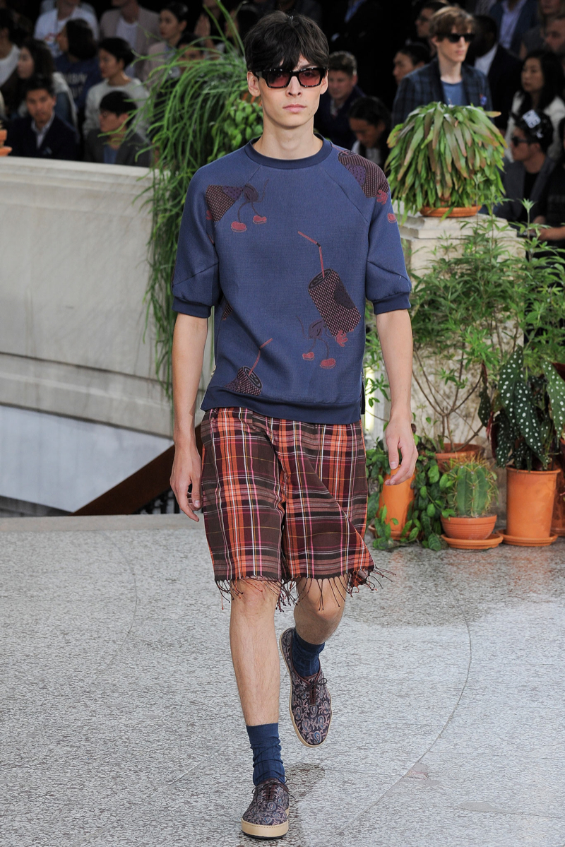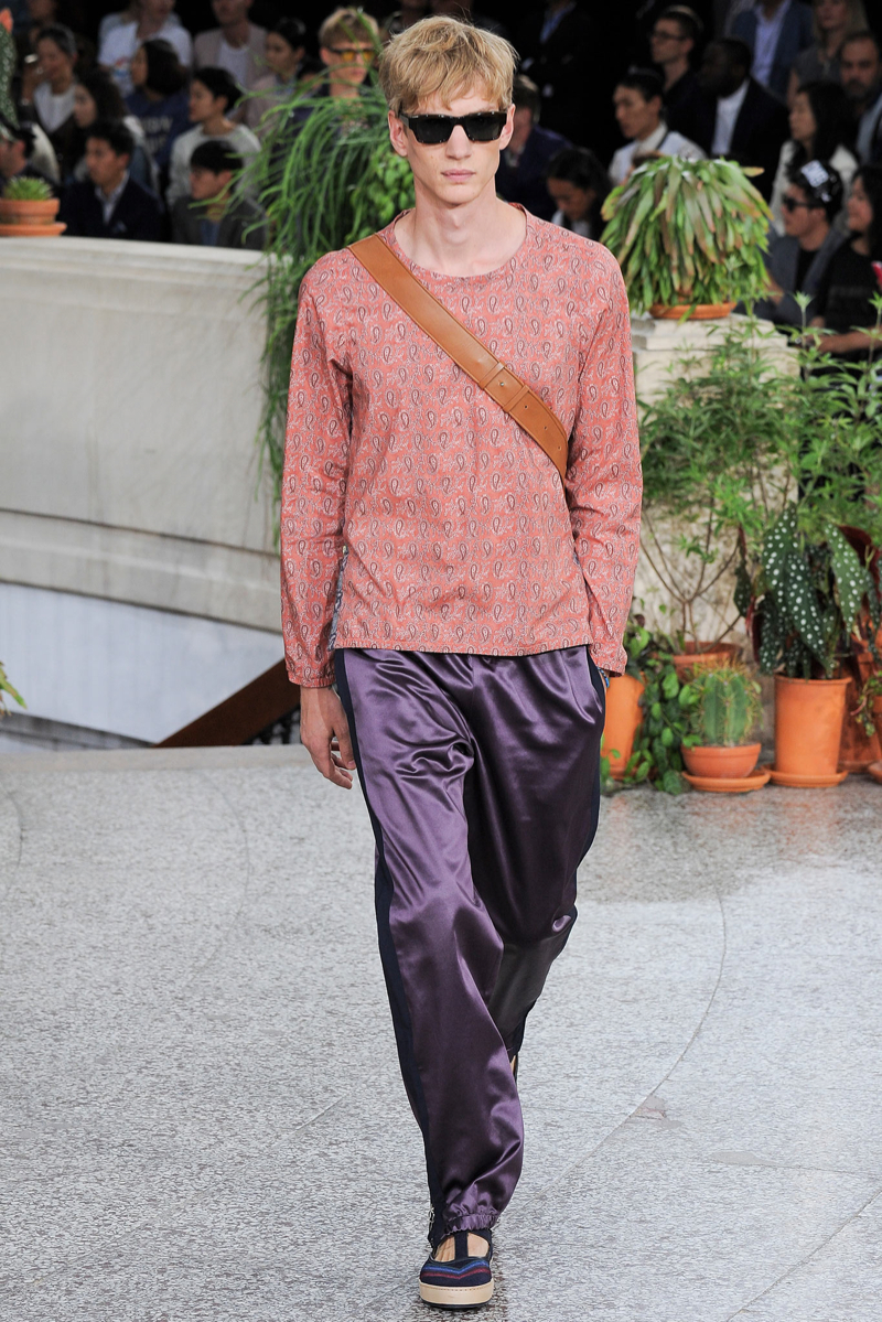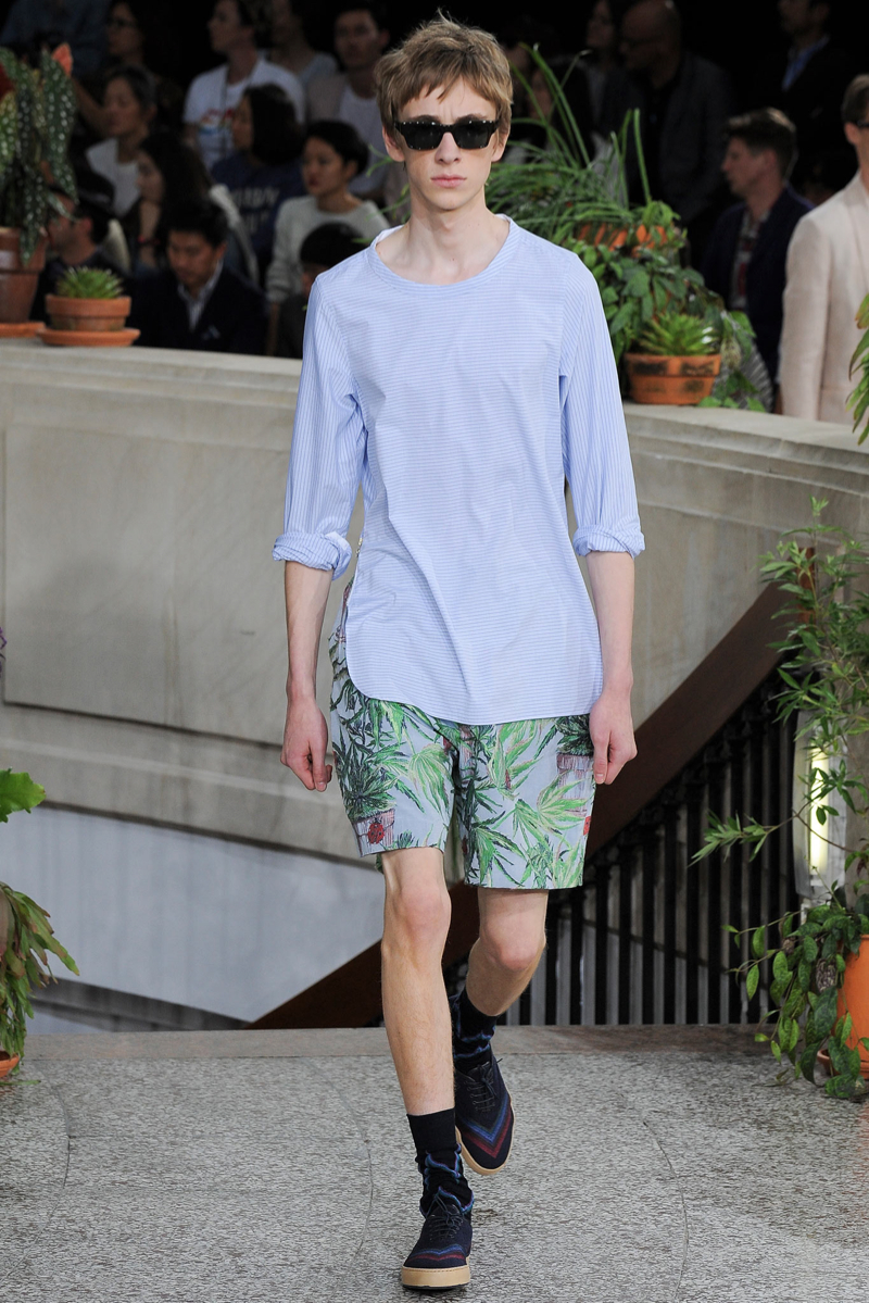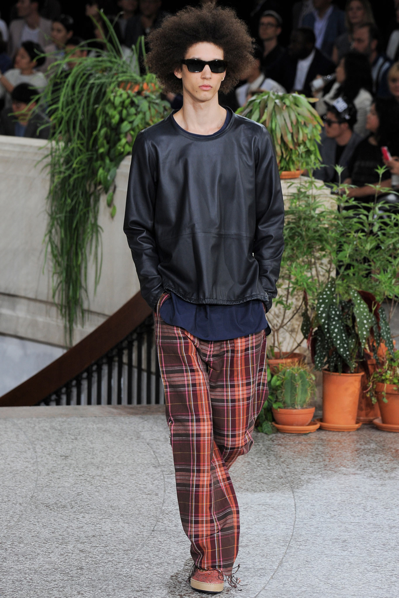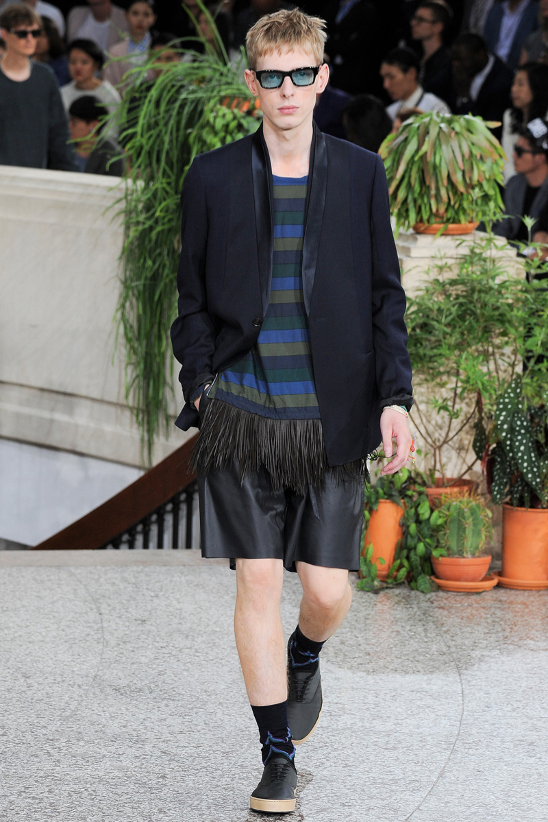 Paul Smith Spring/Summer 2015–Paul Smith had another psychedelic outing for spring/summer 2015, turning to a gamut of colors and cheeky prints of pot. Relaxed with an edge, silk trousers were an elevated step from pajama bottoms. Scarves, plaid shorts and tops were completed with fringe for a defiant look that went right along with bright diagonal prints. Gradients also came into play, embracing vivid watercolors. From short-sleeve tees and billowing trousers to casual knit pullovers, the Paul Smith man was one of the most relaxed imabges during Paris Fashion Week, ending with a resounding ‘Yeah!’ (yes, the closing t-shirt said that!)