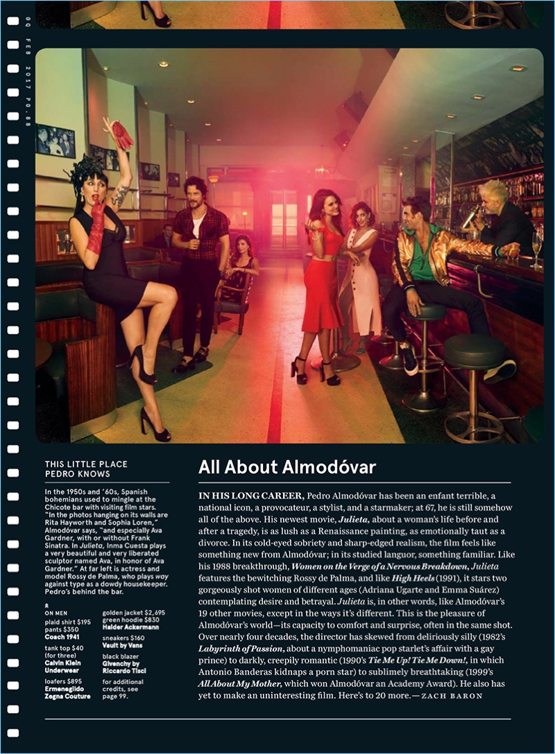 GQ celebrates Pedro Almodóvar and his latest film, Julieta by turning over one of its latest photo shoots to the director. Almodóvar takes us to the streets of Madrid, Spain. Here, a cinematic story unfolds. Jon Kortajarena stars in the editorial, joined by actors and entertainers, personally chosen by Almodóvar. Wearing both casual and tailored styles, the Spanish model sports pieces from brands such as Dsquared2. Anders Overgaard photographs the colorful narrative.
