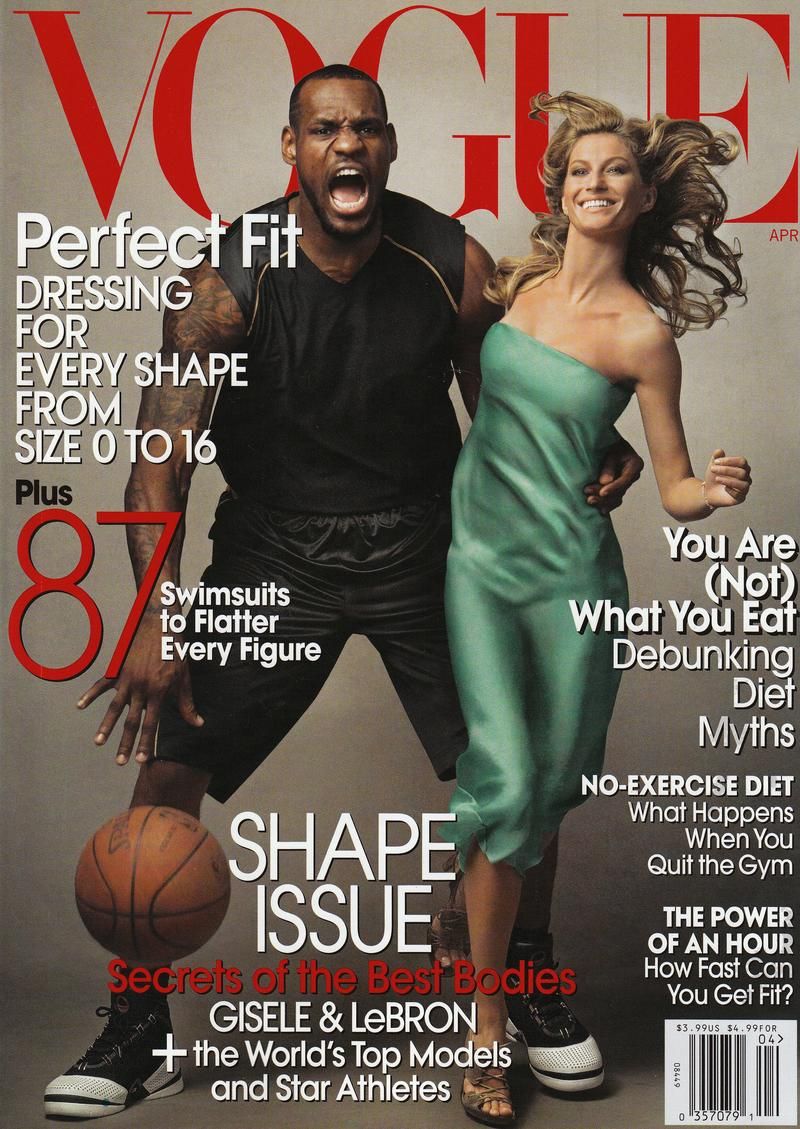 Due to Kardashian’s reality fame, their cover was also one of Vogue’s most controversial stories. Another talked about cover was Lebron James’ April 2008 cover with model Gisele Bundchen. Suggesting racial undertones, critics compared the cover image to a famous illustration of King Kong, grabbing a woman in a dress featuring a similar silhouette.