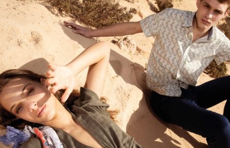 Models Dani van de Water and Sam Steele front the editorial outing. The pair poses in a wardrobe that features must-have items like soft cotton chinos [that] mimic nature’s color palette in stoney whites, peaceful blues, and classic khaki tones.