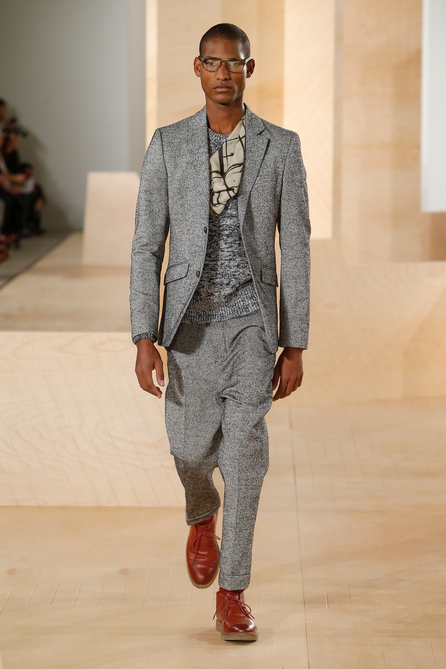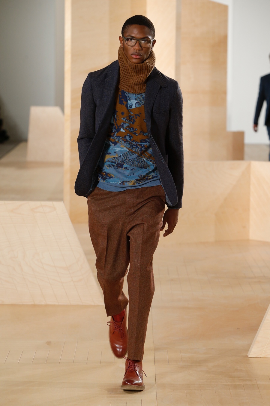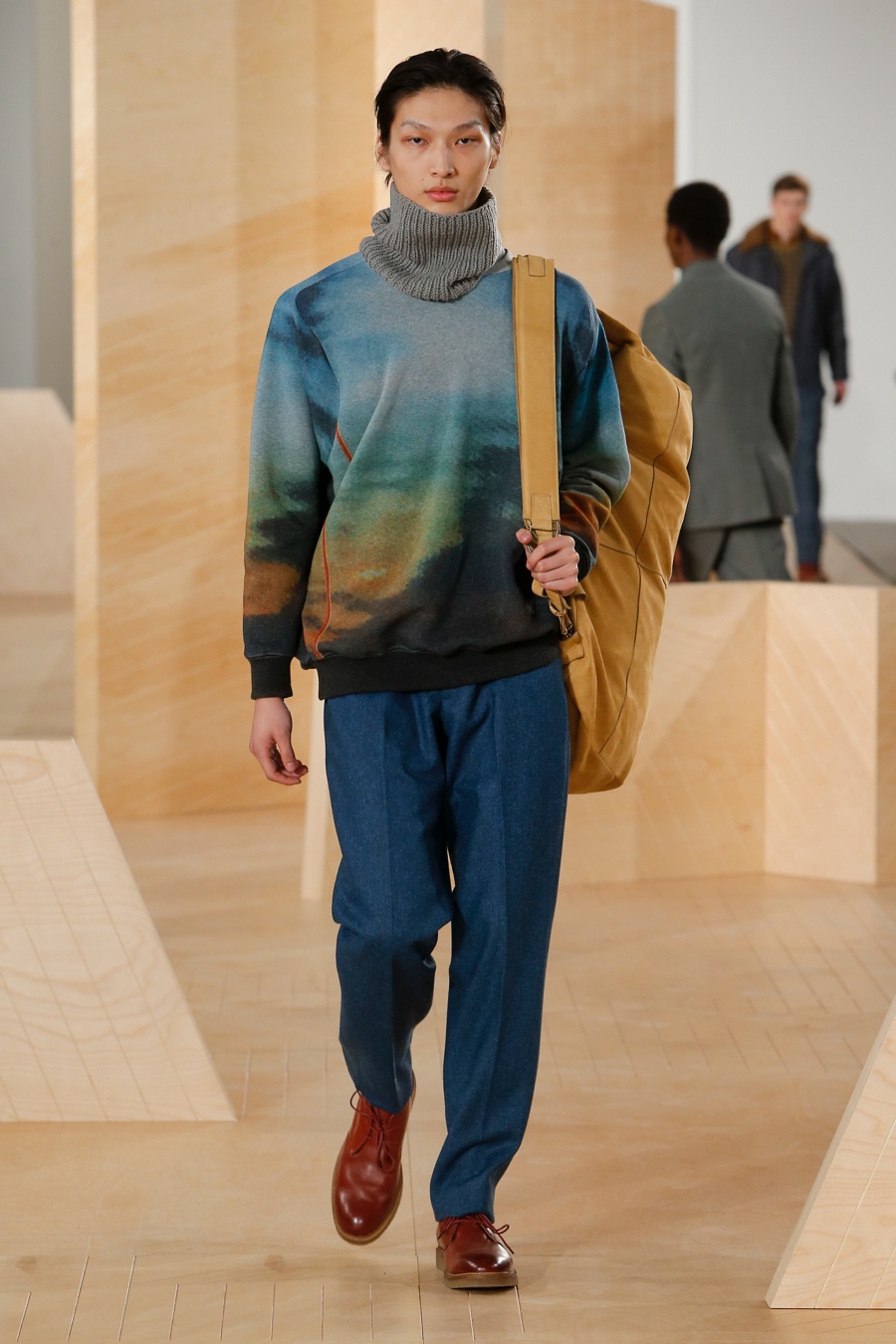 Perry Ellis creative director Michael Maccari reinterpreted menswear essentials for fall-winter 2016. Looking to landscape images for inspiration this season, Maccari honed in on the concept of textures and colors that appear abstract close-up, but simple from afar. Explaining the idea, Maccari shared, “We’ve been playing with the idea of images appearing differently in the distance than they do up close―like landscapes.” He continued, “When you step back, you start to get the bigger picture of shape and proportion, but when you get closer, that image is actually made up of many complicated textures and colors.”