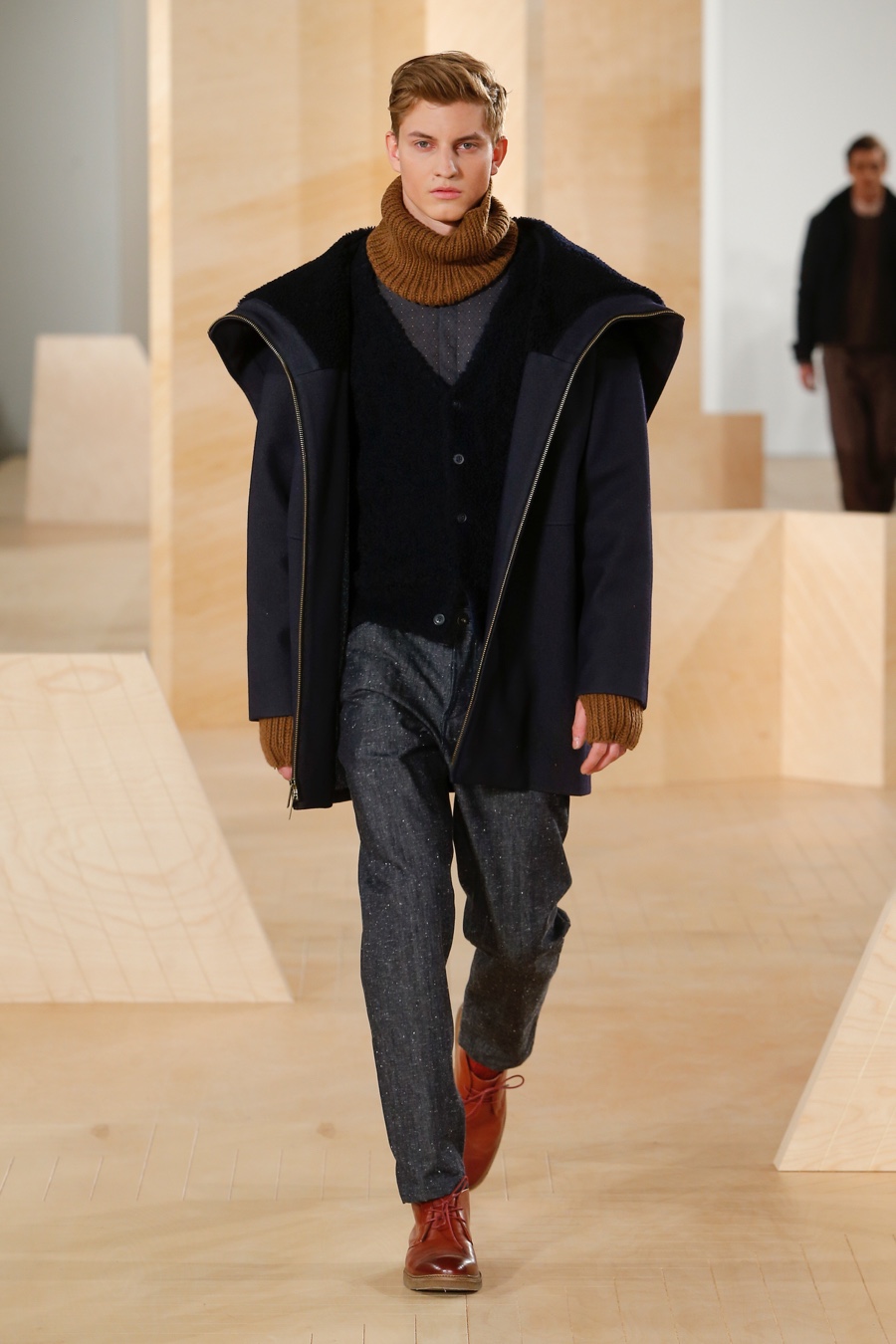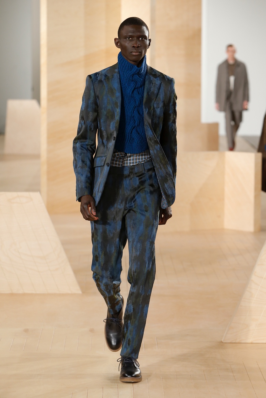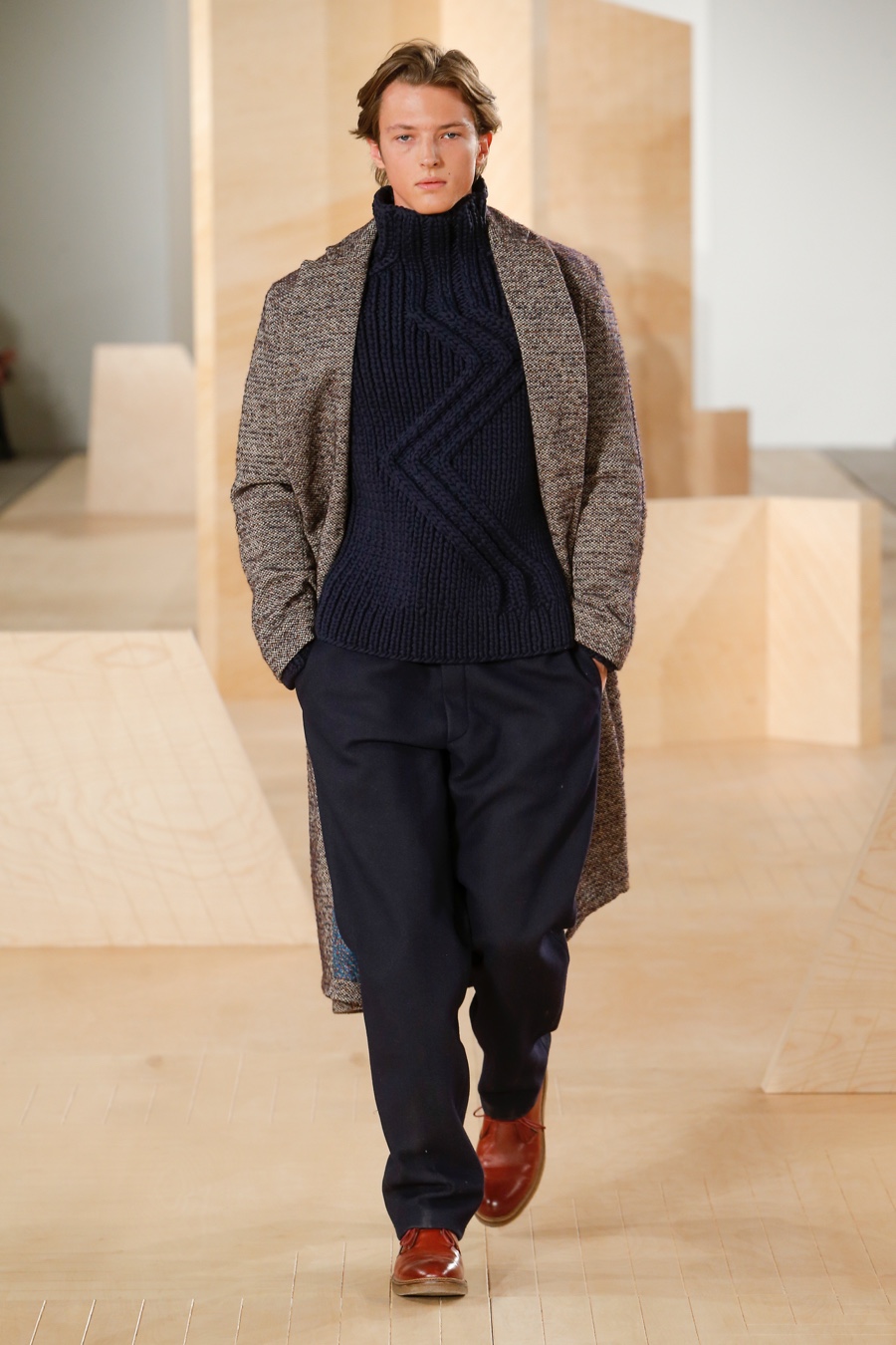 Making the idea a reality, Maccari examined the work of American painter Richard Diebenkorn, borrowing from his use of layered, colorblocked shapes and reinterpreting them as micro prints with a seasonless color palette. Referencing the 1960s and 70s, relaxed shapes formed the collection’s framework. Here, slouchy trackpants, chunky sweaters, distressed denim jeans, oversized coats, short denim jackets and patterned knitwear come together for an impressive outing that perfectly captured the relaxed spirit of American menswear.