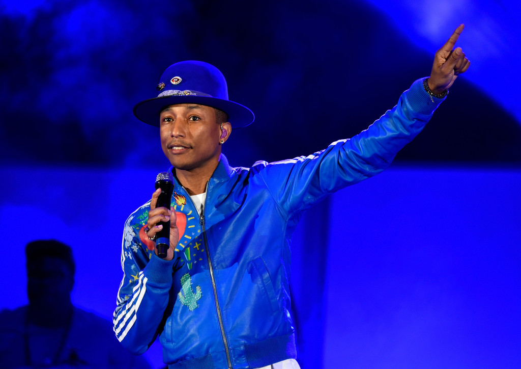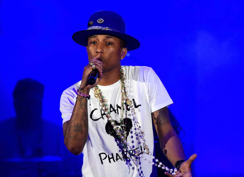 Pharrell Performs in Chanel T-Shirt & Custom Adidas Blue Leather Bomber Jacket