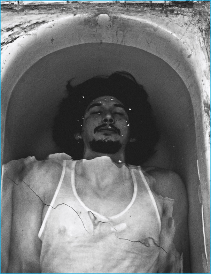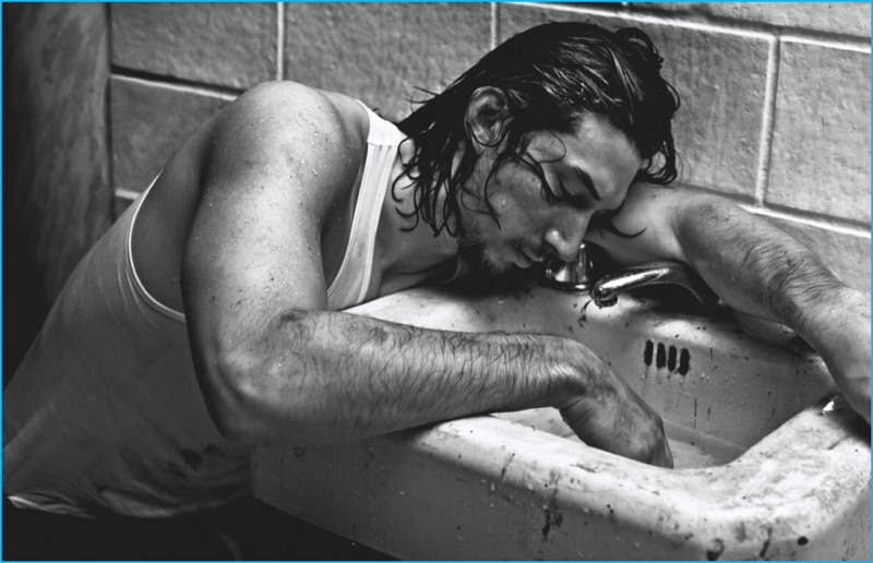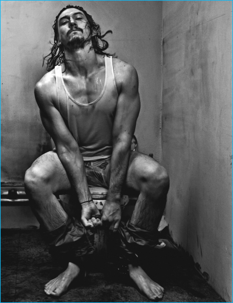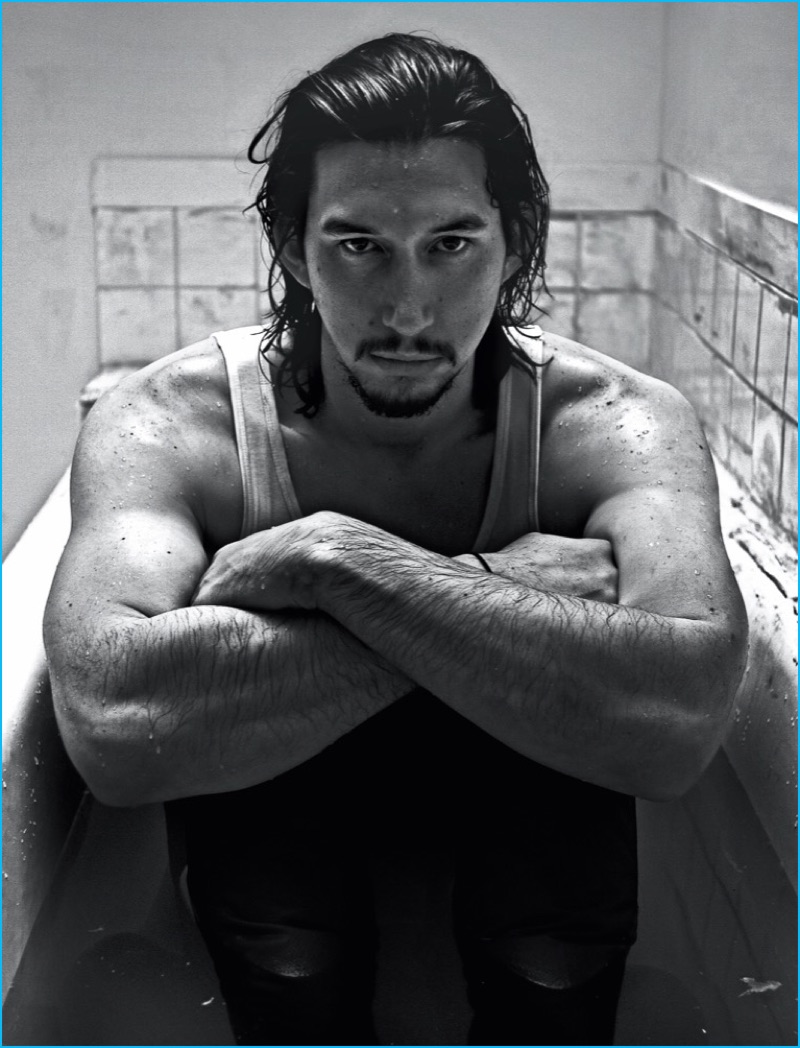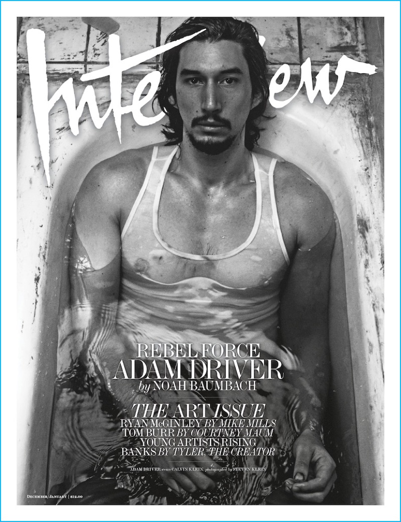 Adam Driver relaxes in a bathtub as he covers the December 2016/January 2017 issue of Interview magazine. Appearing before the lens of photographer Steven Klein, Driver wears a Calvin Klein wife beater. Driver appears in grungy images as he dons minimal fashions, pulled together by stylist Karl Templer.