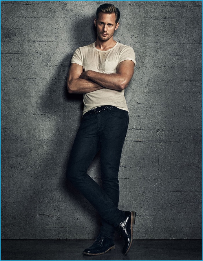 Following a Vogue photo shoot, Alexander Skarsgård reprises his wet shirt look for the pages of Vanity Fair Italia. The Legend of Tarzan star covers the glossy magazine’s June 2016 issue. Photographed by Michael Schwartz, Skarsgård tackles classic men’s fashions that include the crewneck t-shirt and dark wash denim.