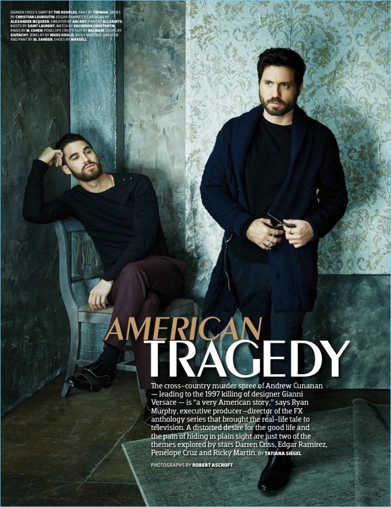 FX show American Crime Story: The Assassination of Gianni Versace lands in the spotlight once more. The show’s stars cover the latest issue of Emmy magazine. Darren Criss, Edgar Ramirez, Ricky Martin, and Penelope Cruz come together for a photo shoot by Robert Ascroft. Jolene Nava leads styling for the feature.