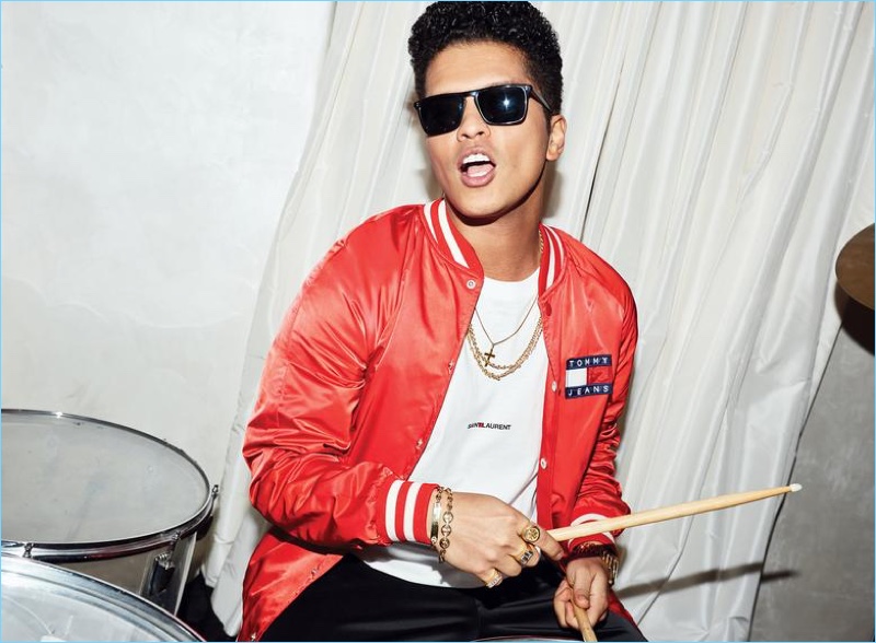 Talking to WSJ. about his personal style, Mars shares, “The style stuff all comes from watching my dad—the pinkie rings, the pompadour, everything.” The Versace on the Floor singer continues, “My dad would take me to school in some big, busted up Cadillac, and he’d be wearing a rhinestone jacket and have his hair all whipped and greased up, flashy glasses, and I was like, My dad’s not like the other dads at school! I’d try to get out of the car, zoom out. And now I’m the one driving the busted Cadillac, wearing some gaudy shit, and it’s what makes me happy.”