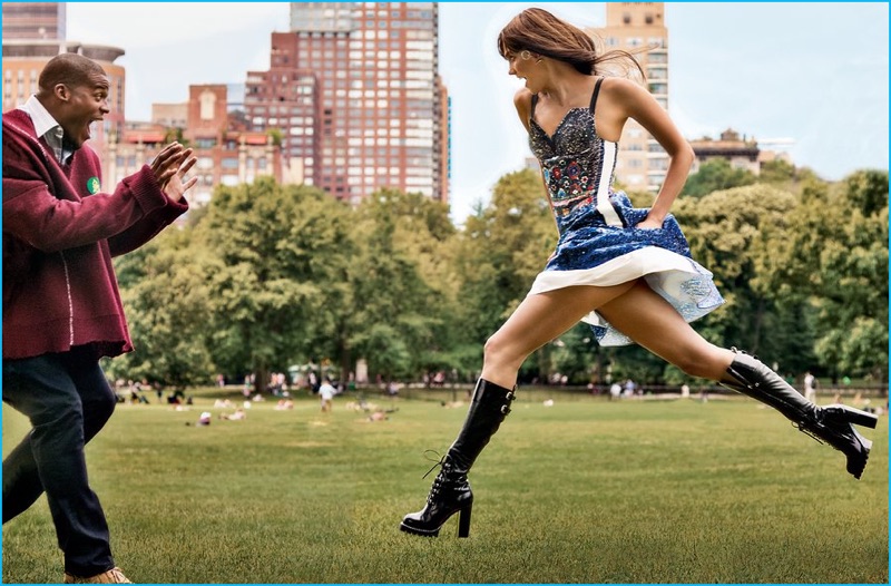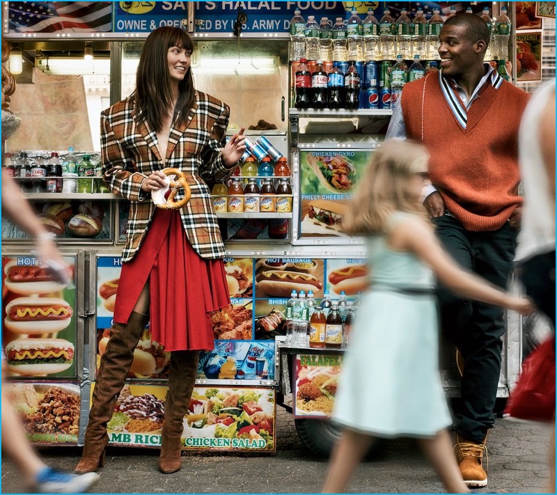 Stopping by a street stand, Cam Newton and Karlie Kloss charm. Newton wears a Raf Simons shirt and sweater vest with Timberland boots.