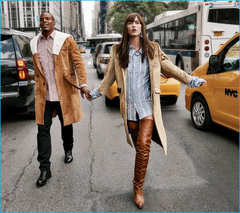 Cam Newton gets into the shearling trend with a Loewe coat. Holding hands with Karlie Kloss, Newton also wears an Etro shirt and Aidan Black shoes.